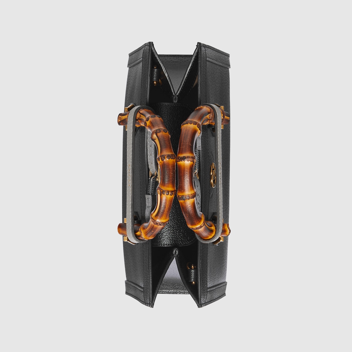 Combining recognizable elements of the House, the small tote bag is defined by its bamboo handles and Double G hardware. Crafted from black leather, the accessory is further accentuated by two colored belt details, a playful reference to the bands used to keep handles in shape.
