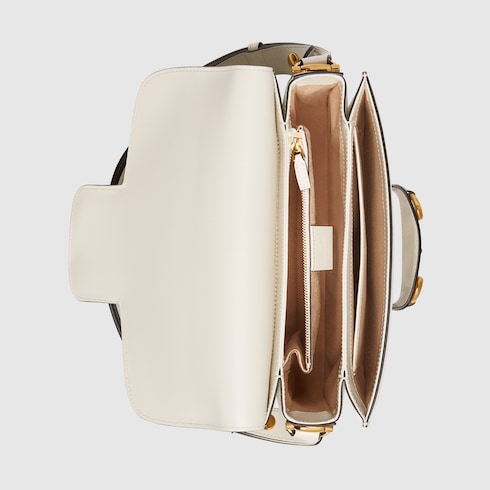 Introduced for Cruise 2020, the Gucci Horsebit 1955 bag is recreated from an archival design. With the same lines and forms first introduced over six decades ago, the accessory unifies the original details with a modern spirit, highlighting the Horsebit. Part of Gucci’s genetic code, the double ring and bar design has been established as one of the most distinctive elements among the House symbols borrowed from the equestrian world. Presented on a small flap shoulder bag, the hardware is paired with textured white leather and completed with a special mechanism that adjusts the length of the shoulder strap so it can be carried on one shoulder or cross body.