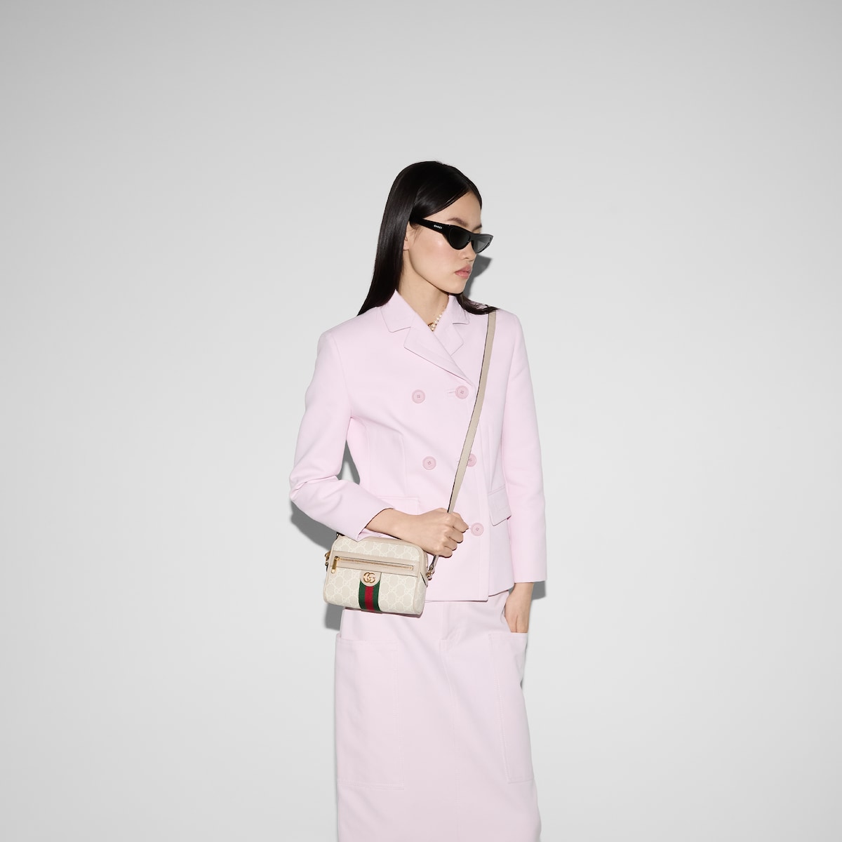 This Ophidia mini shoulder bag is presented in elevated GG Supreme canvas in subtle beige and white shades, complete with the Web stripe. The House continues the idea that pieces should be timeless, while highlighting the historic Double G logo in a lighter gold tone.