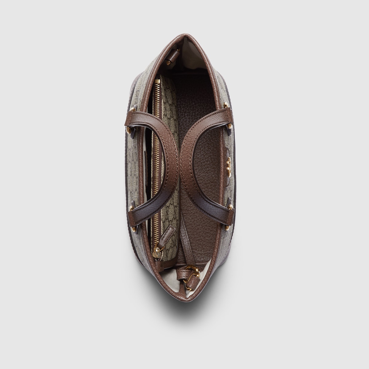The Ophidia line is further elevated through new sizes and styles, like this mini tote bag which has a detachable pouch and detachable leather shoulder strap, allowing for versatile wear. The beige and ebony GG Supreme canvas is complete with light gold-toned Double G hardware.