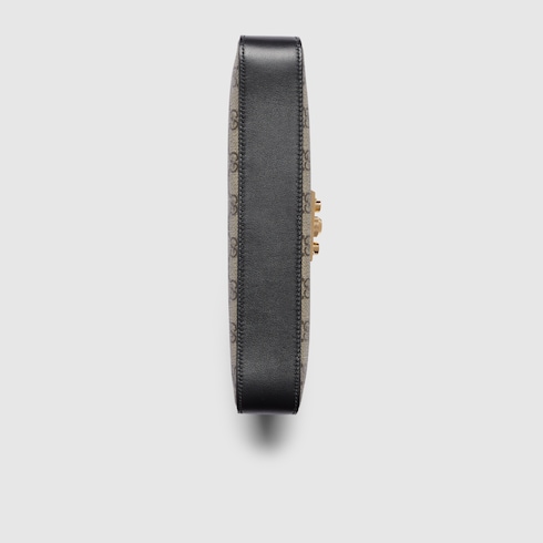 Drawing from the House’s origins as an artisanal luggage atelier, the Padlock closure features prominently on this small shoulder bag in beige and ebony GG Supreme canvas, with black leather trim, and a new adjustable leather and chain strap. It is complete with gold-toned hardware and key with leather holder.
