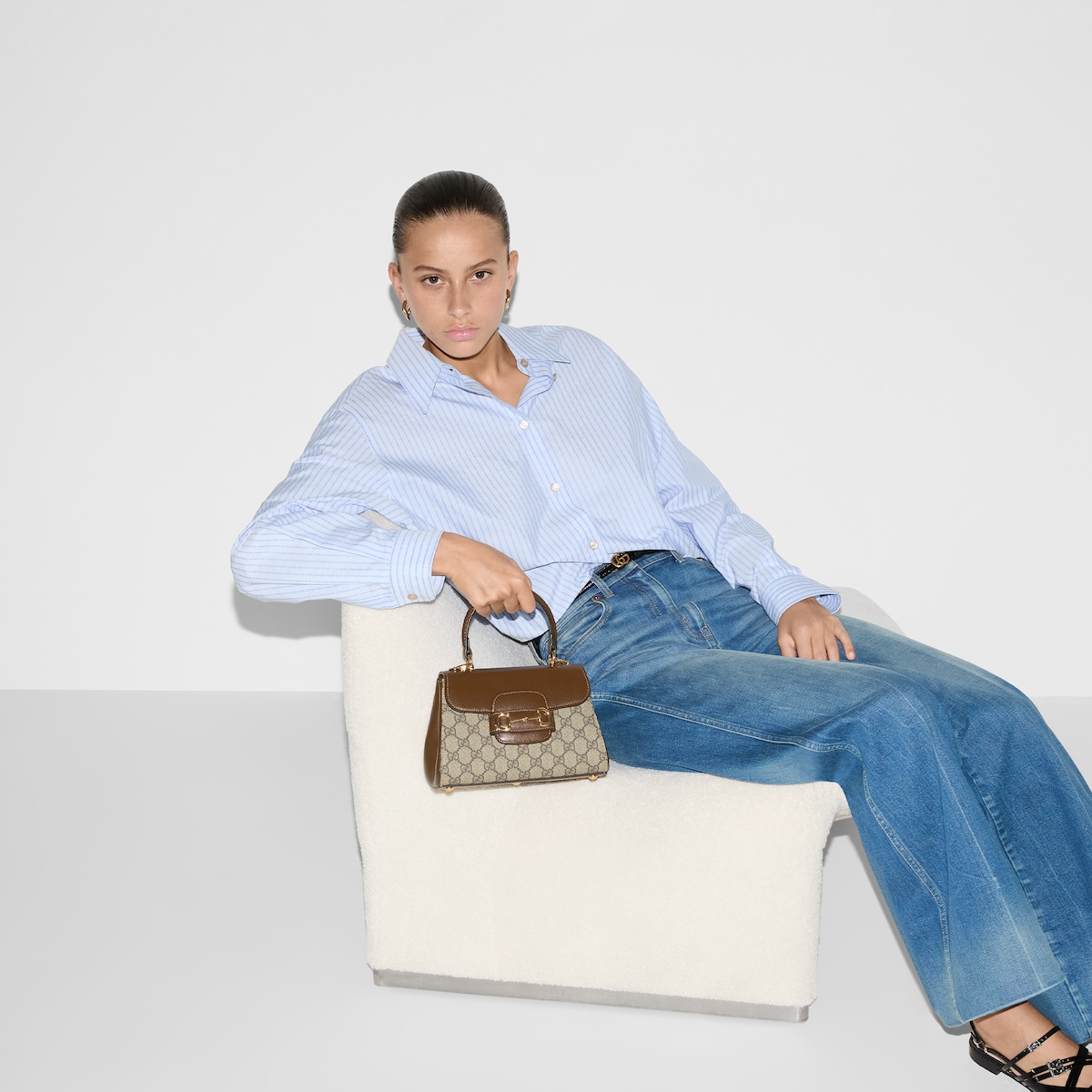 The Gucci Horsebit 1955 is presented as a top handle bag in light brown leather. The collection unifies details first introduced on the original bag that inspired the line from over six decades ago with a modern spirit, highlighting the Horsebit. Part of Gucci’s genetic code, the double ring and bar design has been established as one of the most distinctive elements among the House symbols borrowed from the equestrian world.