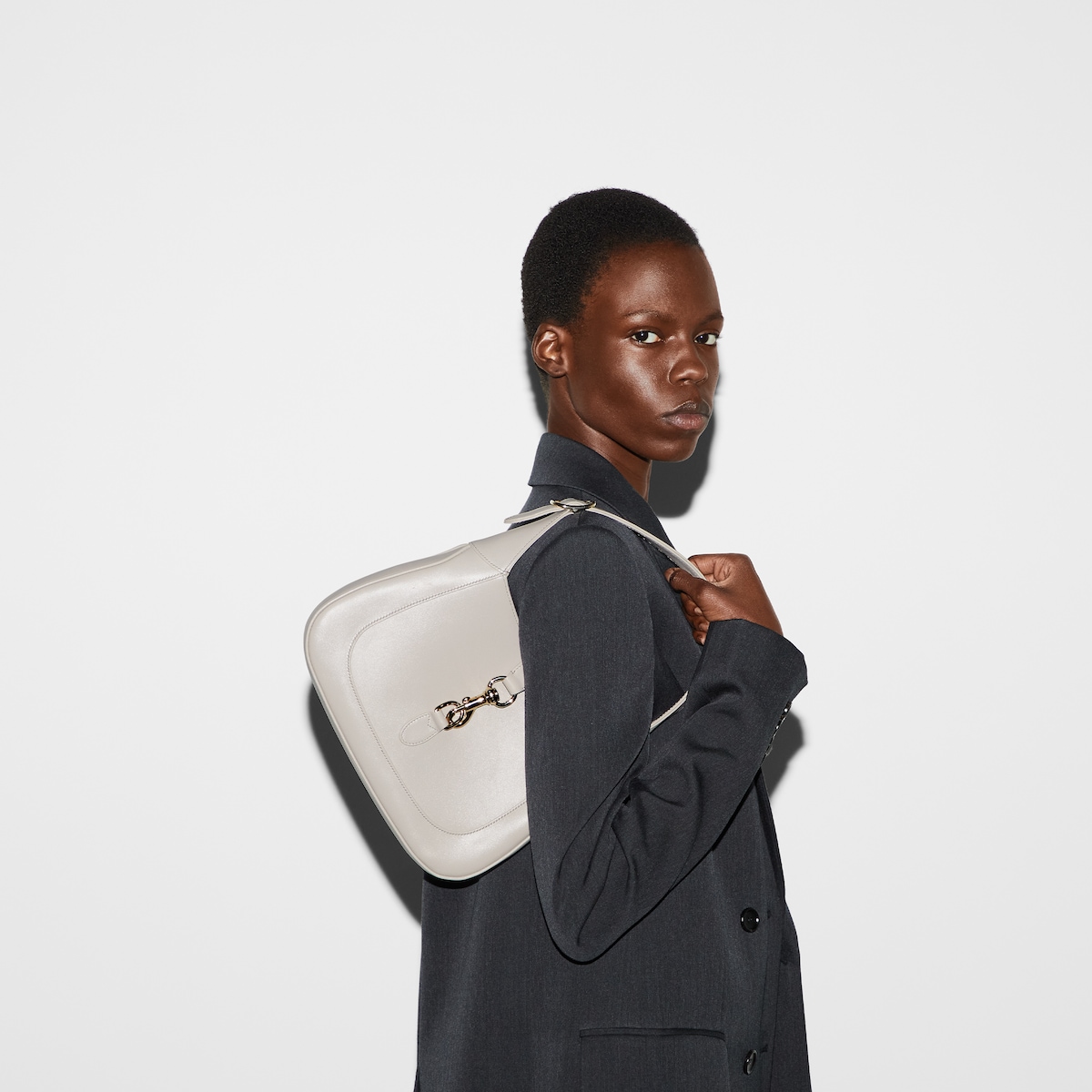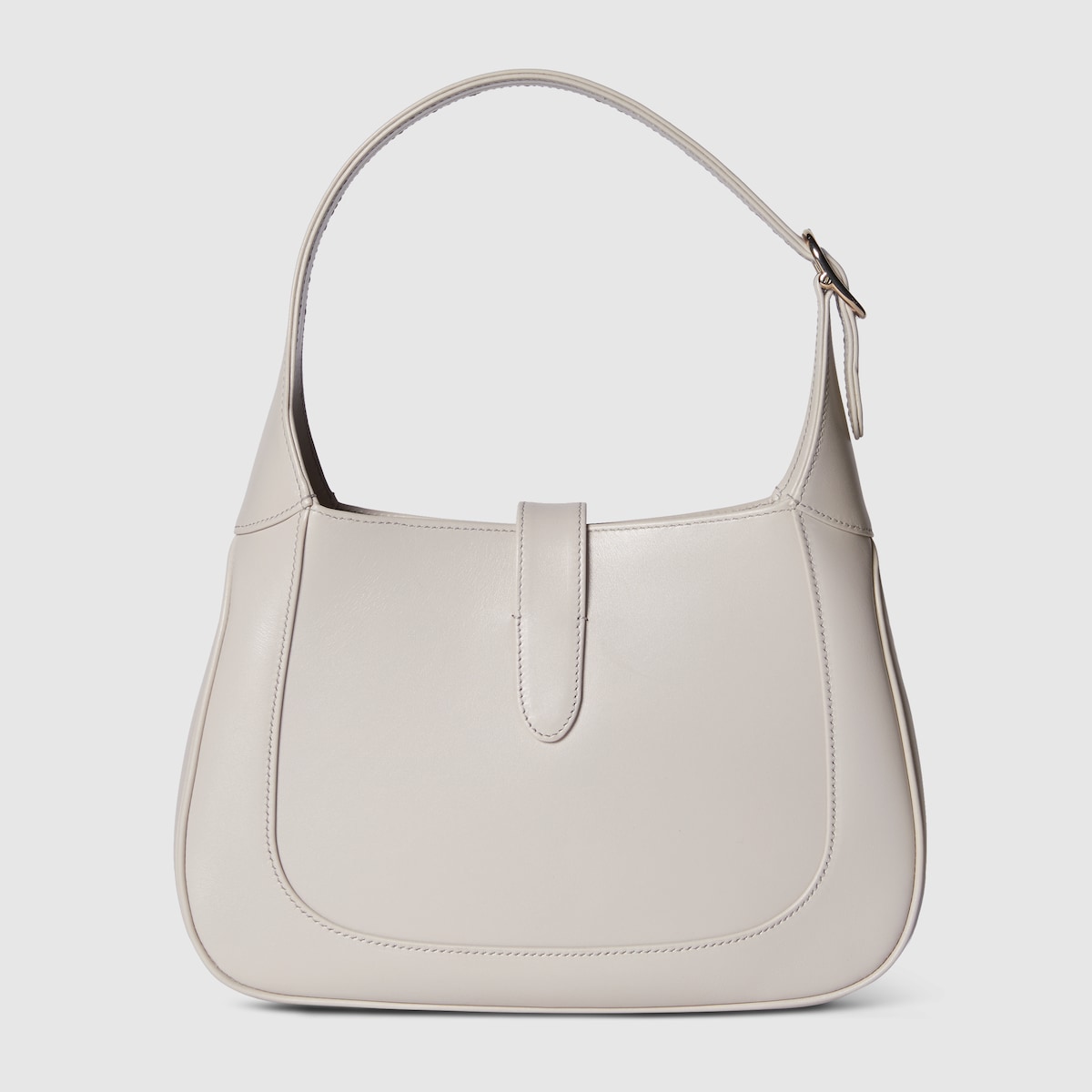 The new Gucci Jackie is crafted from premium fine leather which highlights the craftsmanship, crescent shape, and sleek silhouette of the House’s emblematic shoulder bag. Light gold-toned hook closure, leather trim, and an additional Web strap gives this Gucci Jackie small shoulder bag in light grey leather further styling options.