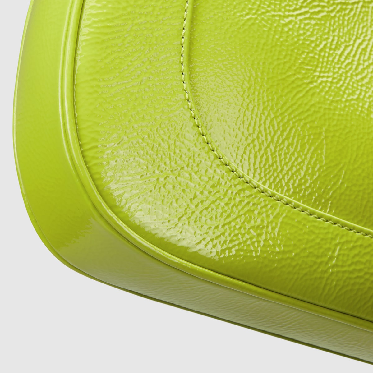 In the Spring Summer 2025 collection, this Gucci Jackie 1961 small shoulder bag is crafted from bright green patent leather, complete with light gold-toned hook closure and an additional strap.