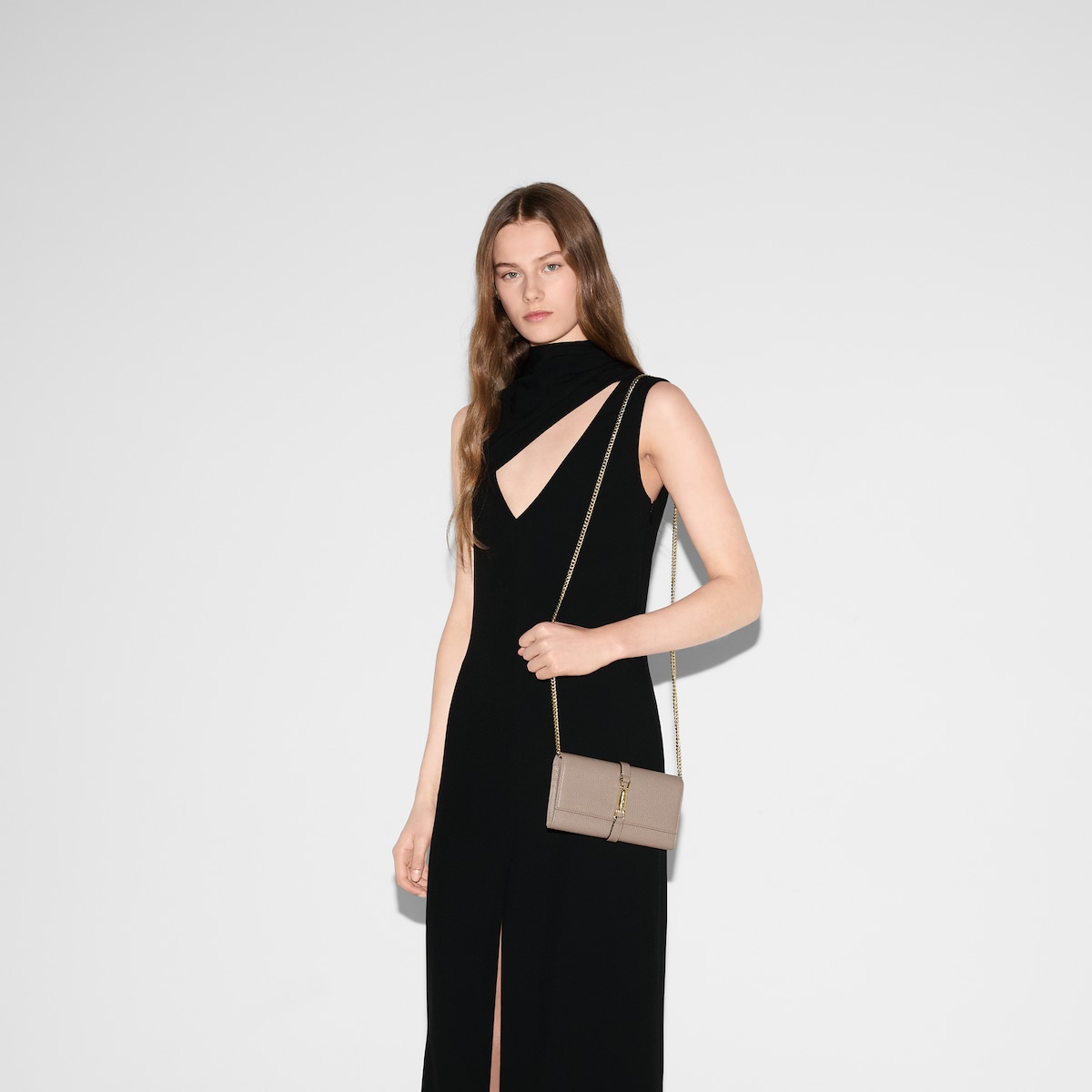 Inspired by the Jackie 1961, this wallet highlights the exceptional craftsmanship and sleek silhouette of one of the House’s most signature designs. The piston detail decorates the front of this taupe leather accessory, while a chain strap allows for easy use.