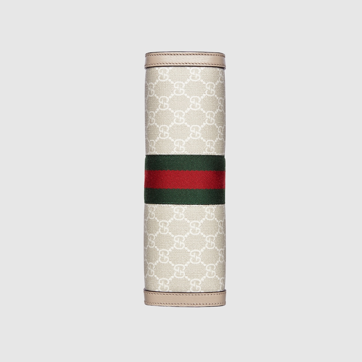 A heritage material from the archive, GG Supreme has been reimagined in Gucci Love Parade in different color combinations and combined with contemporary as well as classic styles. The Ophidia shoulder bag is presented in a beige and white variation of the signature material with a tonal trim. Originally a play on a ’30s design, the canvas speaks to the historical narrative that runs throughout the collection.