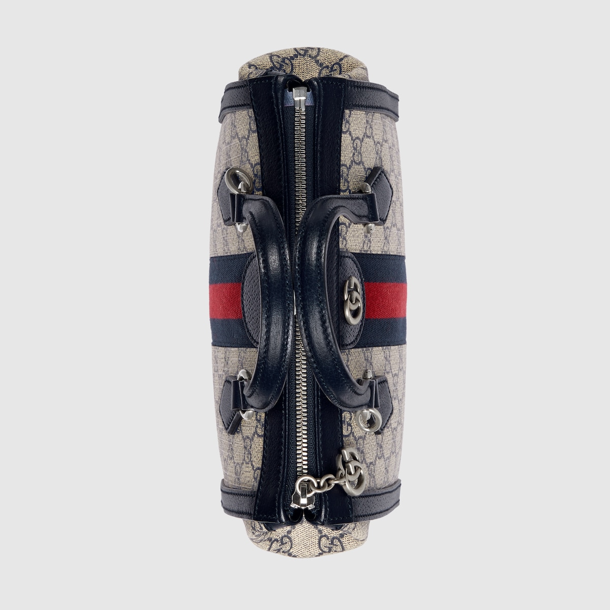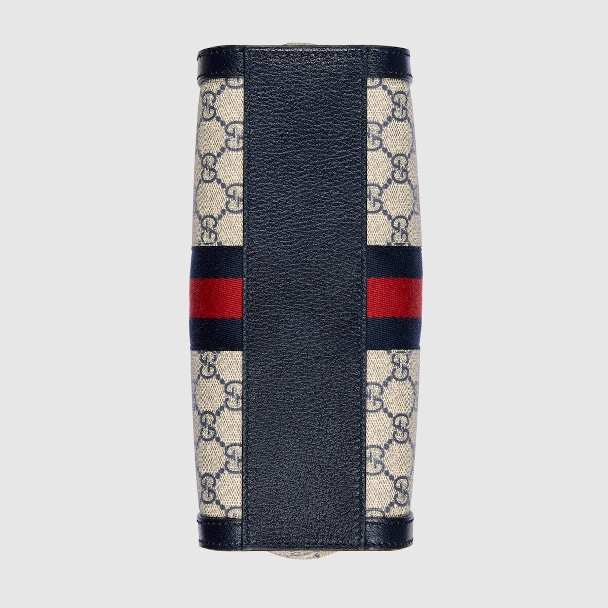 Mirroring the material’s historic origins, GG Supreme is introduced in a timeless mix of blue and beige for Gucci Love Parade. The canvas has come to the forefront of each collection decade after decade to become a hallmark of the House. Here, the classic palette defines this small tote from the Ophidia line, combined with the Web in blue and red.