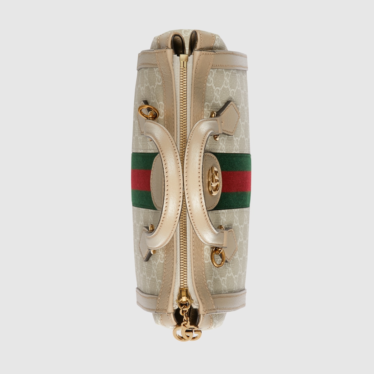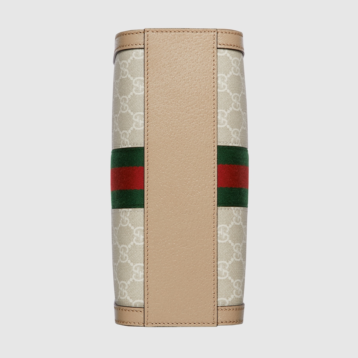 Within Gucci, the world of Ophidia evolves with new iterations, combining vintage inspired details with emblematic House codes. Equipped with a detachable shoulder strap, this tote bag is characterized by the inlaid green and red Web stripe and white leather trim. A petite Double G enriches the style, an archival Gucci code from the ’70s that appears atop a leather tab detail and on the zipper pull.