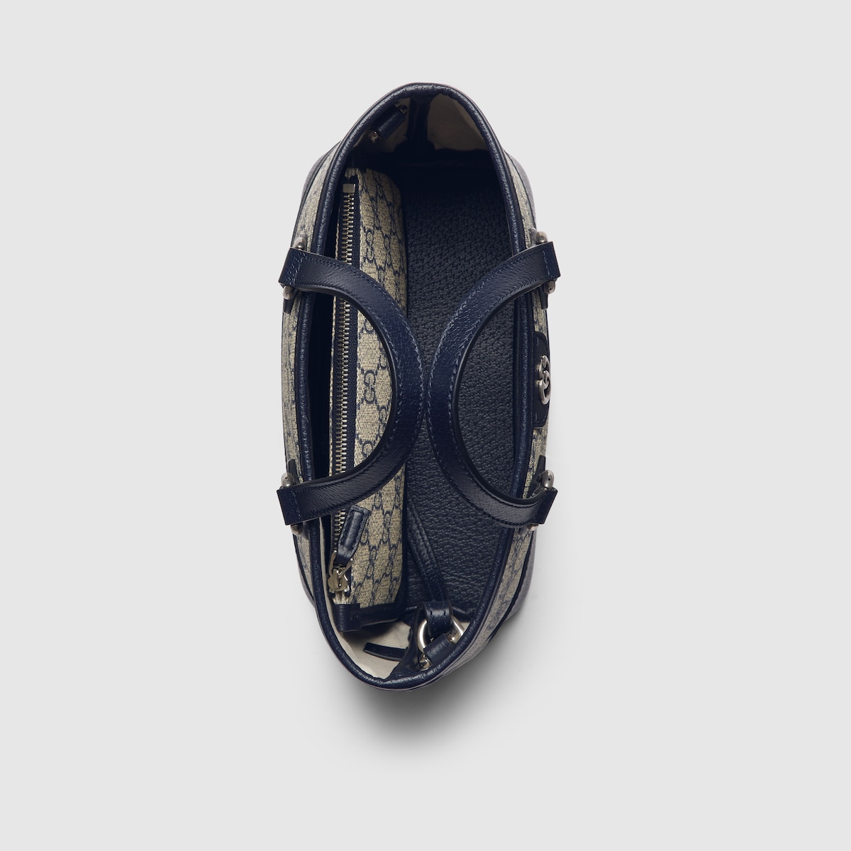 The Ophidia line is further elevated through new sizes and styles, like this mini tote bag which has a detachable pouch and detachable leather shoulder strap, allowing for versatile wear. The beige and blue GG Supreme canvas is complete with light gold-toned Double G hardware.