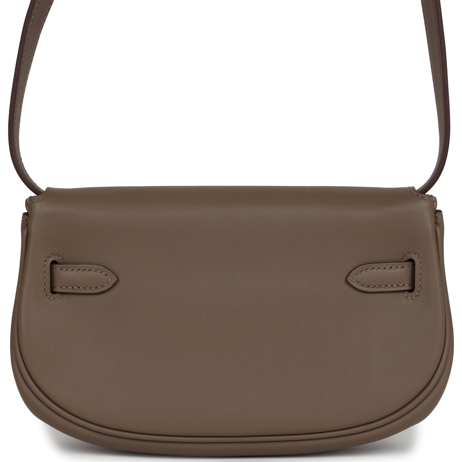 This Kelly Moove Etoupe swift calfksin leather with gold hardware and features tonal stitching, round half moon shape, pull straps that attaches to a toggle closure, and an adjustable flat leather strap with small pouch.