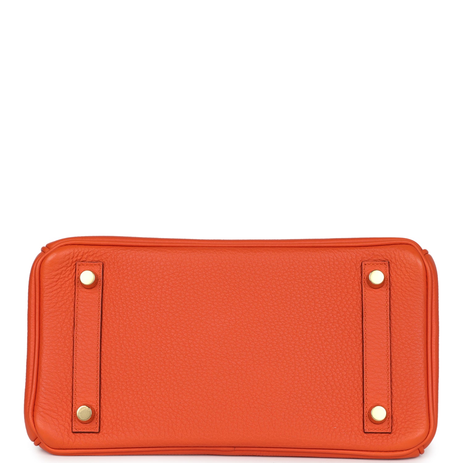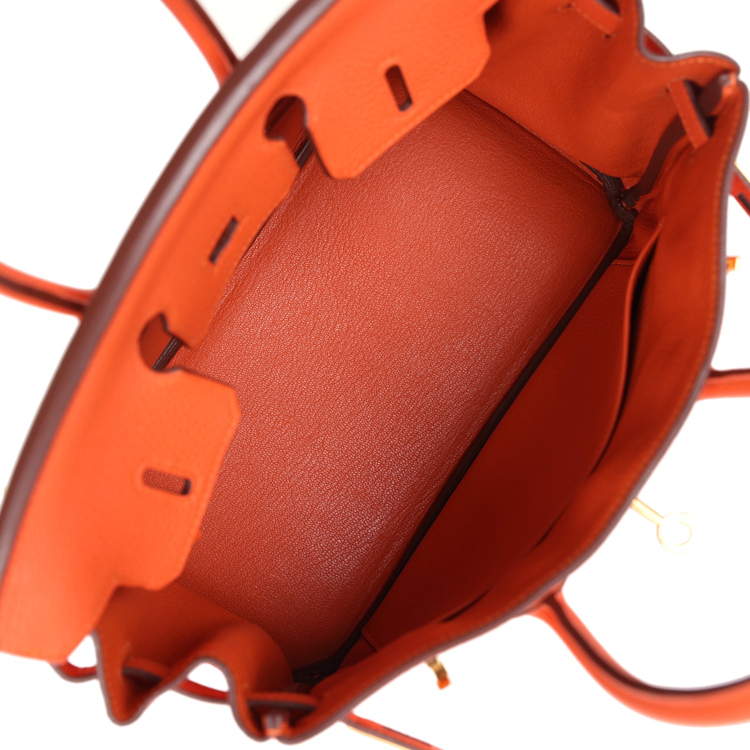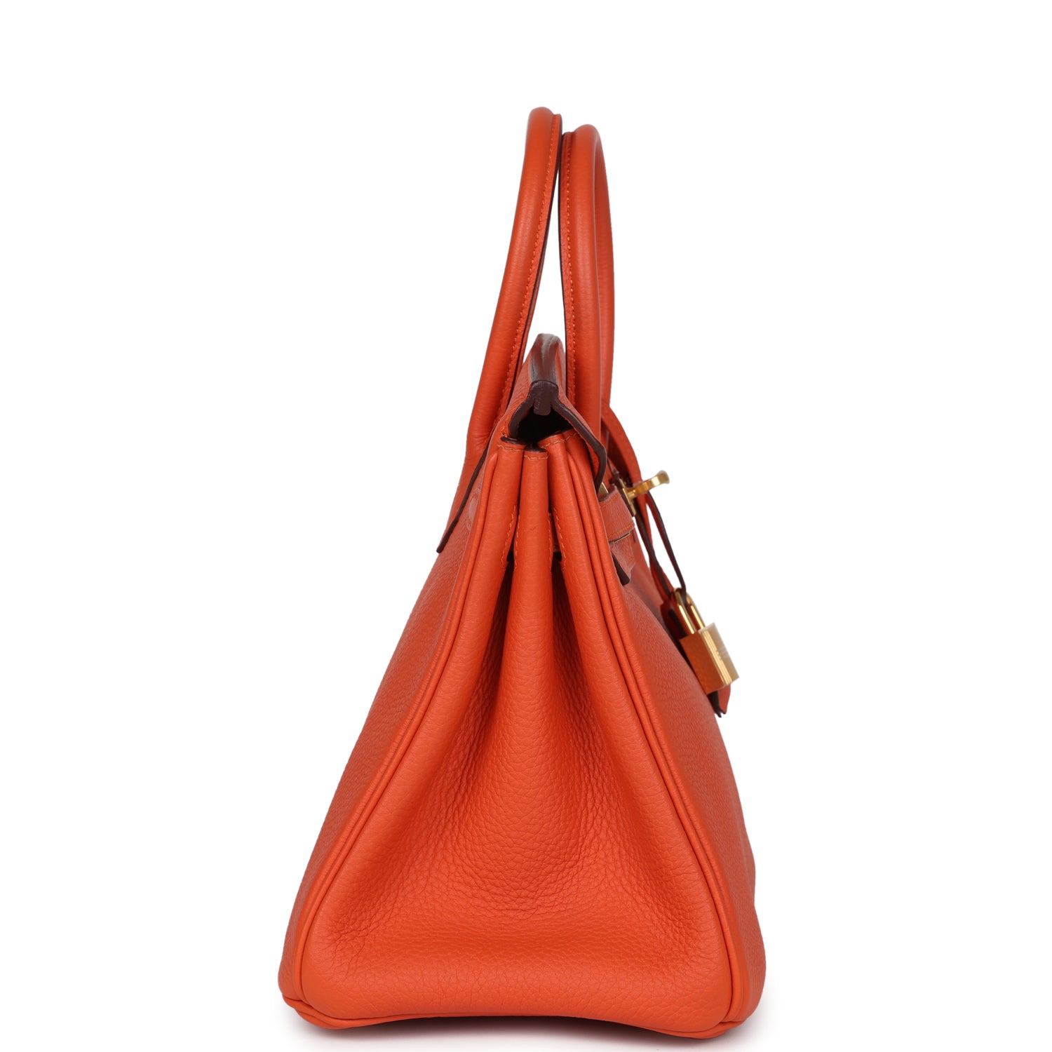 This Birkin is in Feu togo leather with gold hardware and has tonal stitching, front flap, two straps with center toggle closure, clochette with lock and two keys, and double rolled handles.