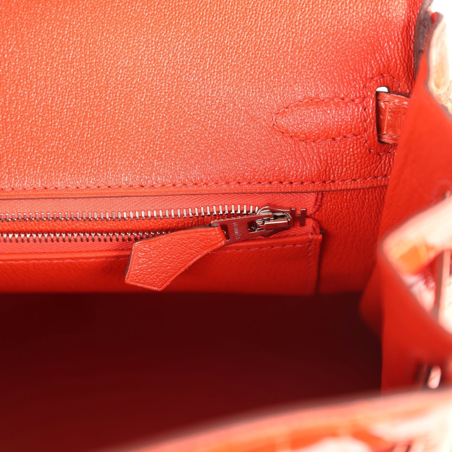 The interior is lined in Orange Poppy Chevre leather and has one zip pocket with Hermes engraved pull; pocket on opposite side.