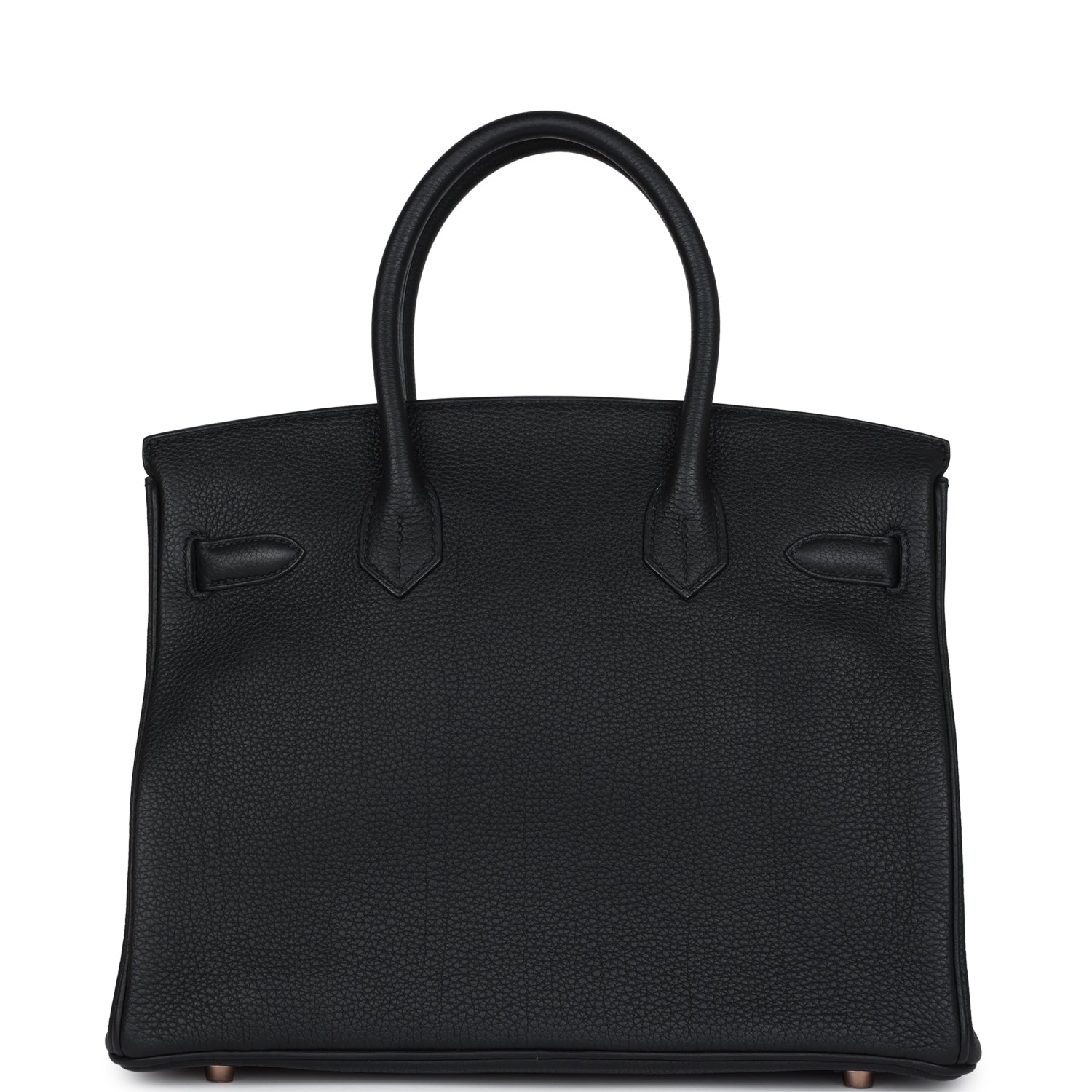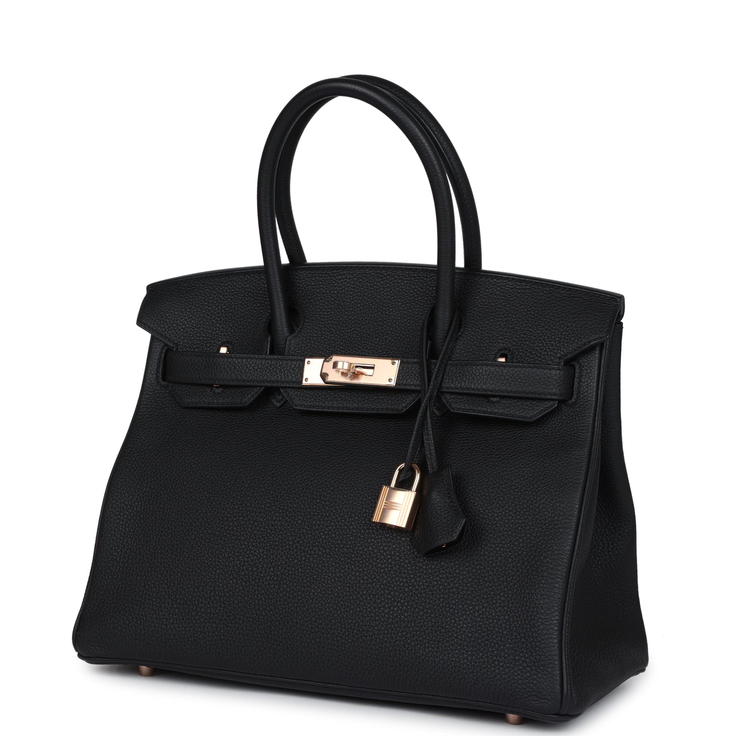 This Birkin is in Black togo leather with rose gold hardware and has tonal stitching, front flap, two straps with center toggle closure, clochette with lock and two keys, and double rolled handles.