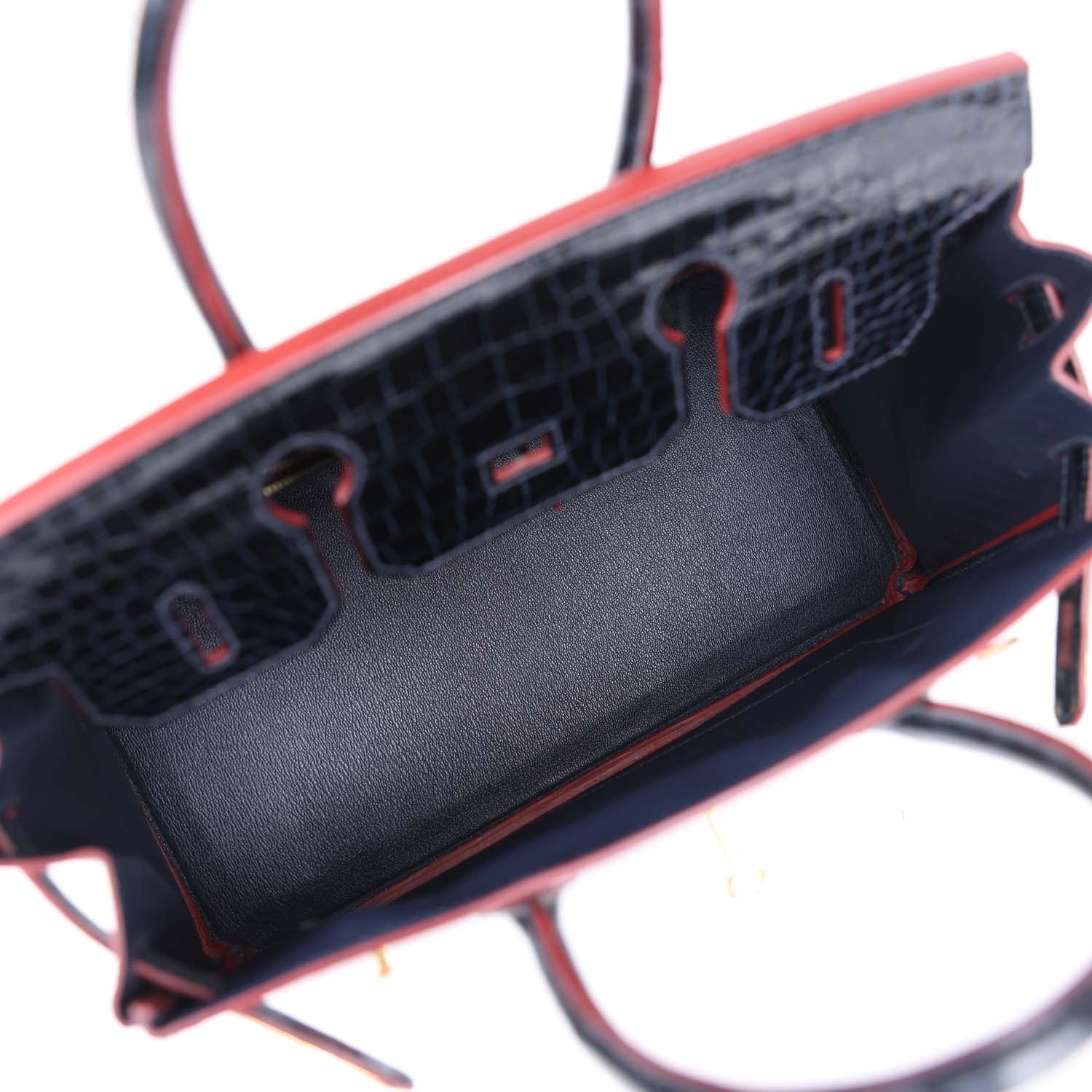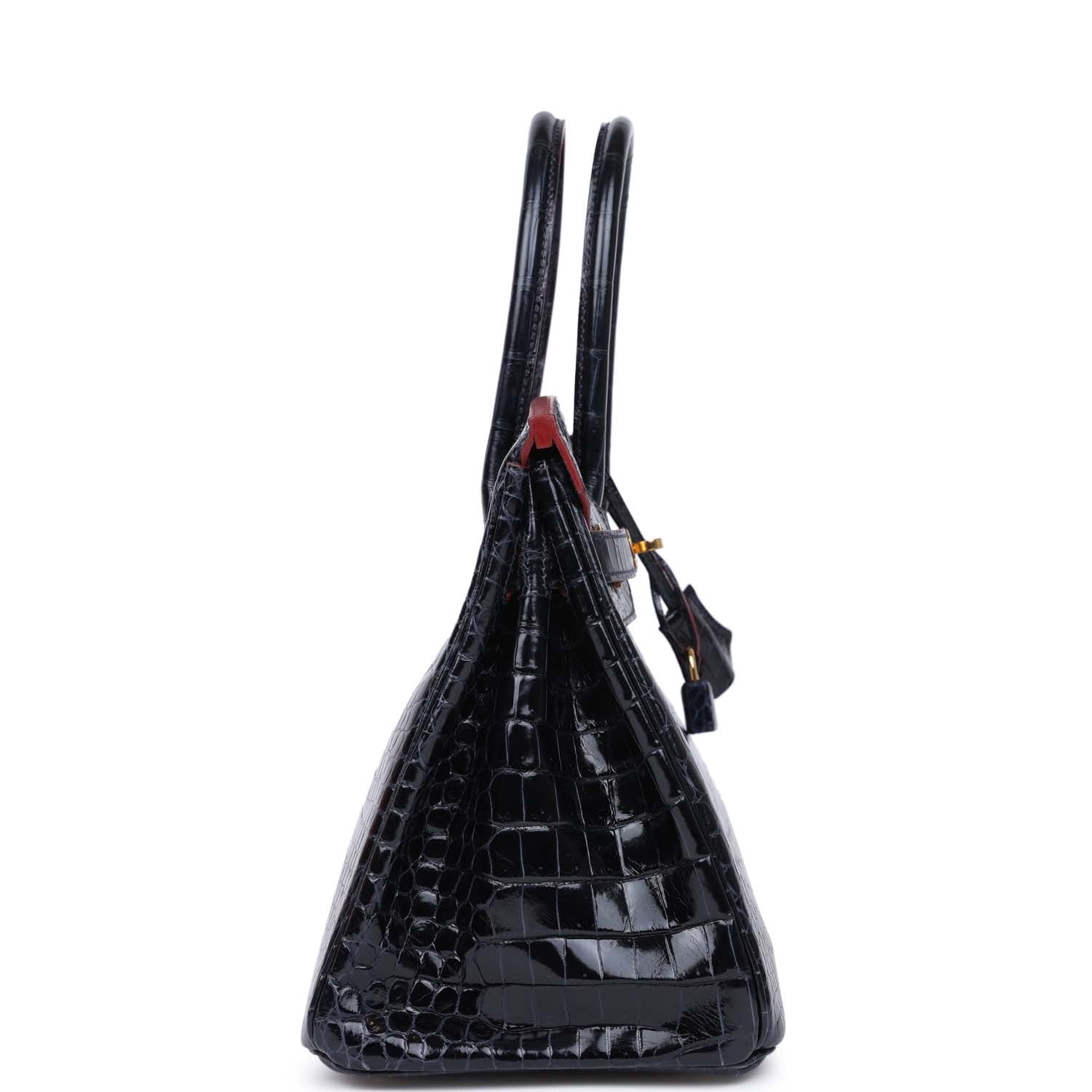 • Hermes Birkin 30 Bleu Marine and Rouge H Contour Shiny Porosus Crocodile Gold Hardware