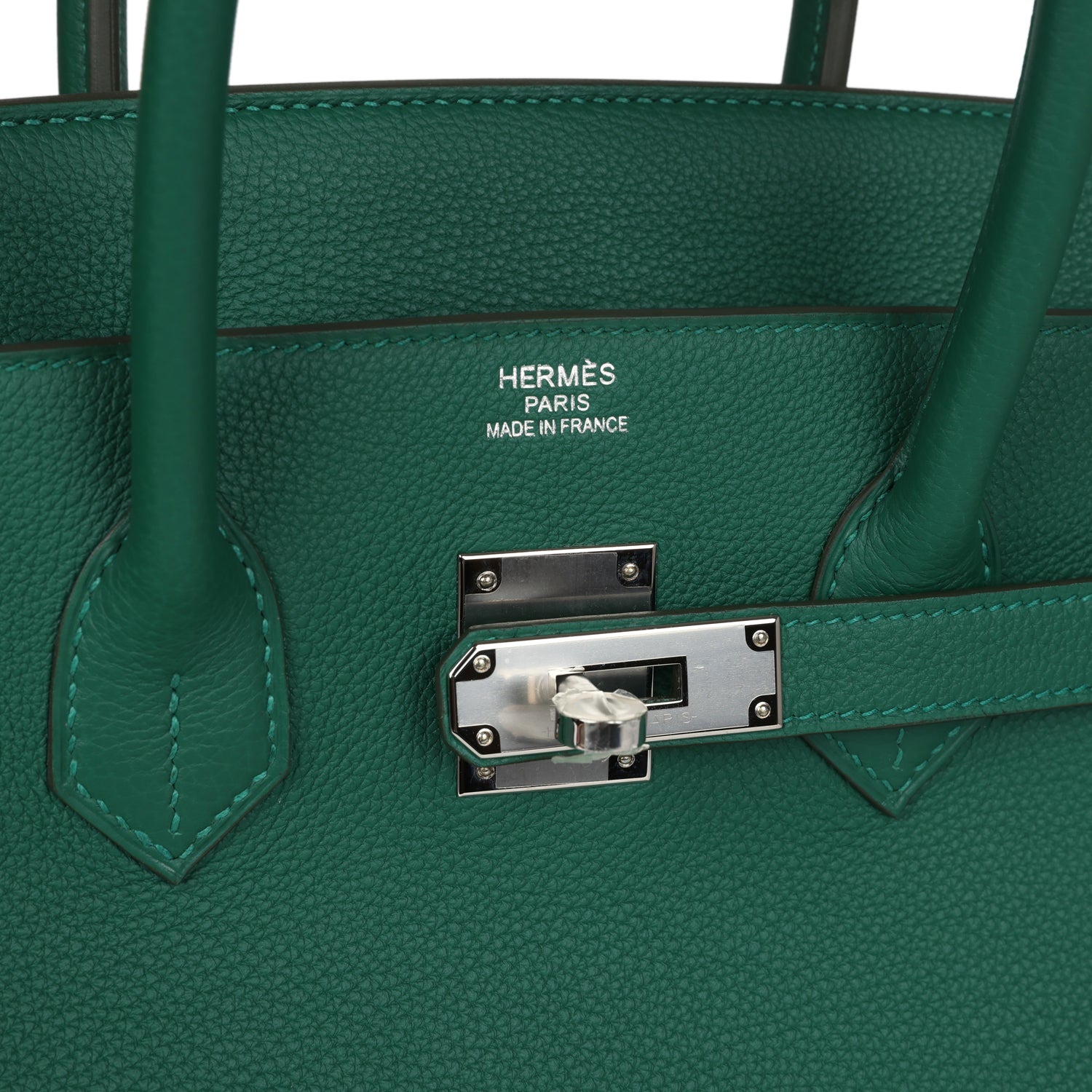 This Birkin is in Vert Moyen togo leather with palladium hardware and has tonal stitching, front flap, two straps with center toggle closure, clochette with lock and two keys, and double rolled handles.
