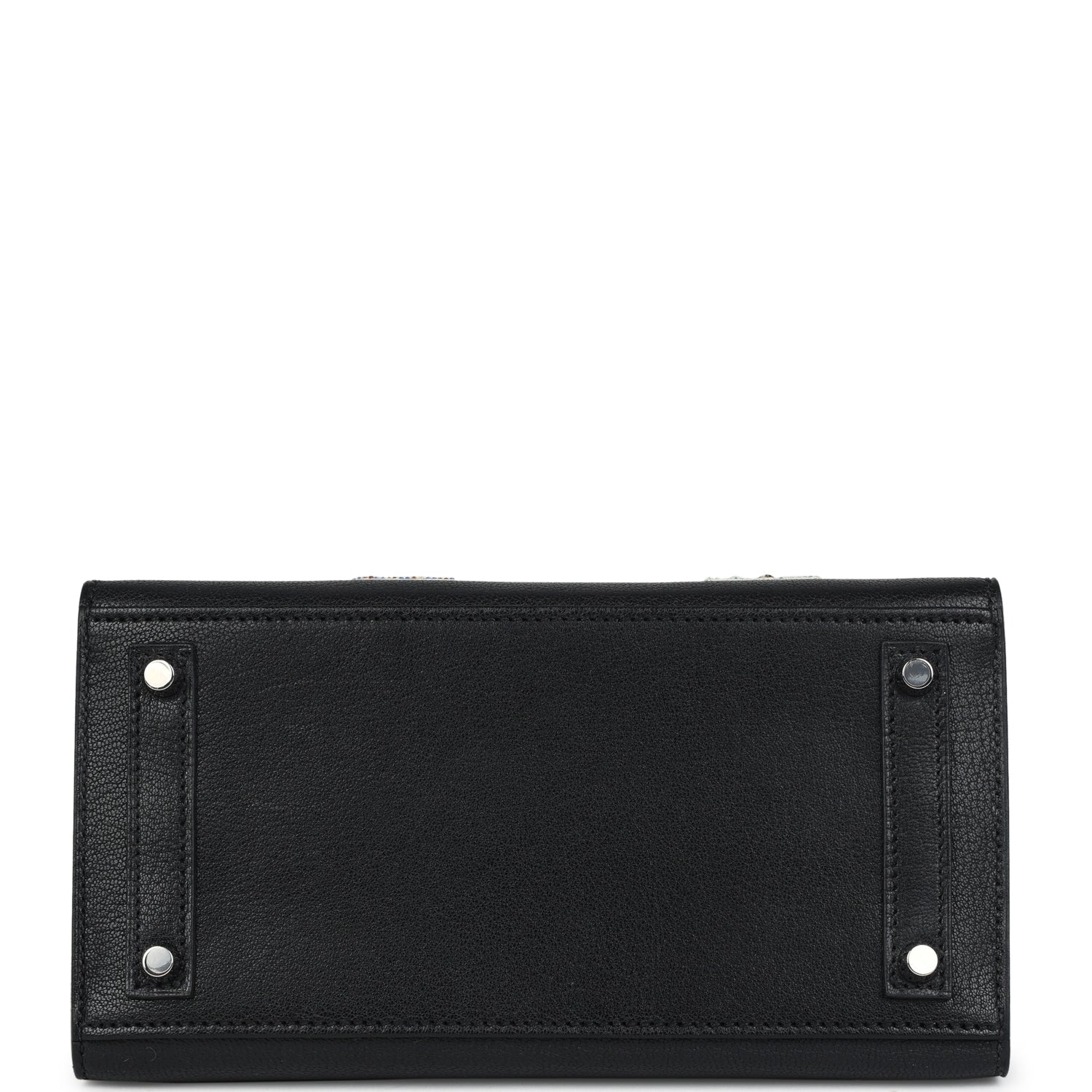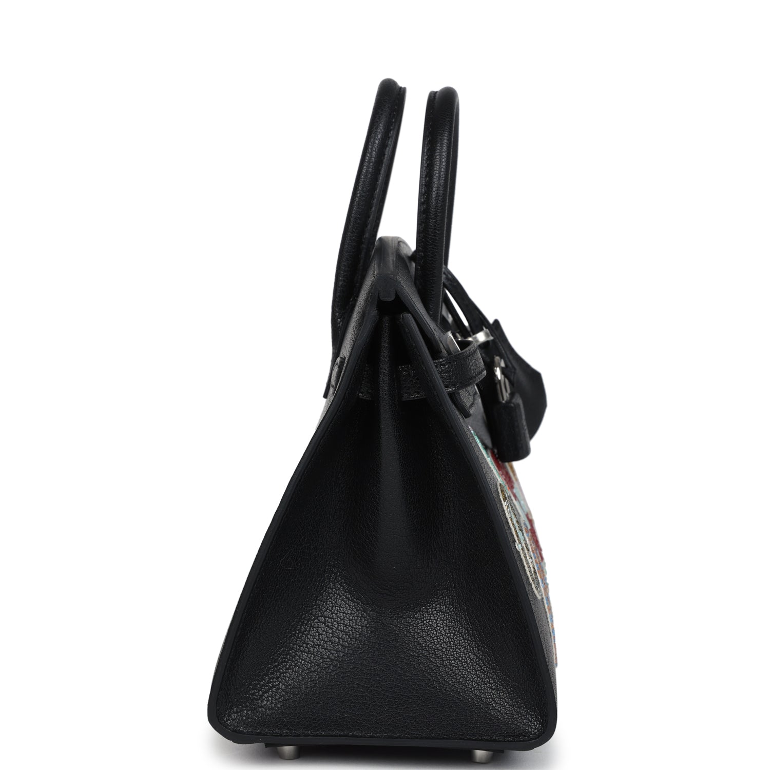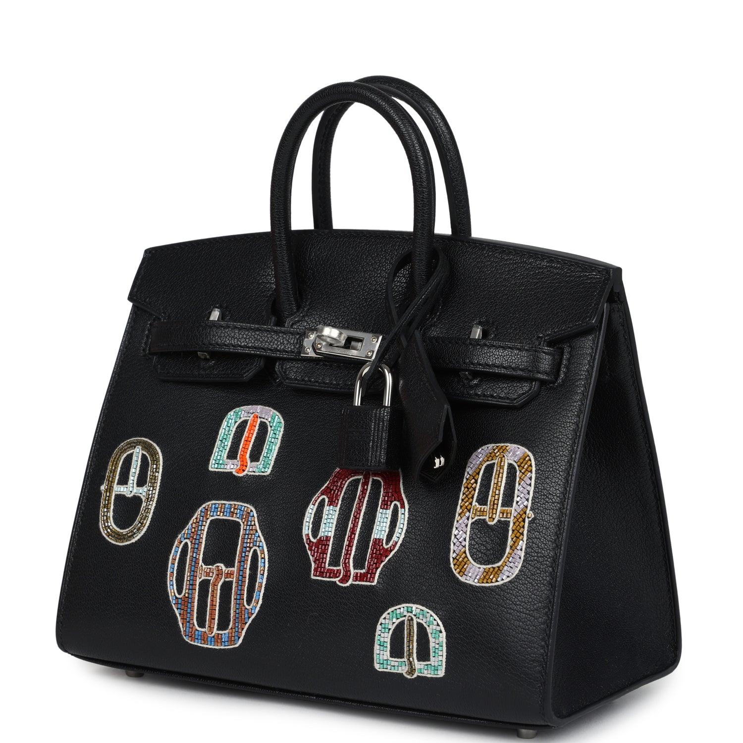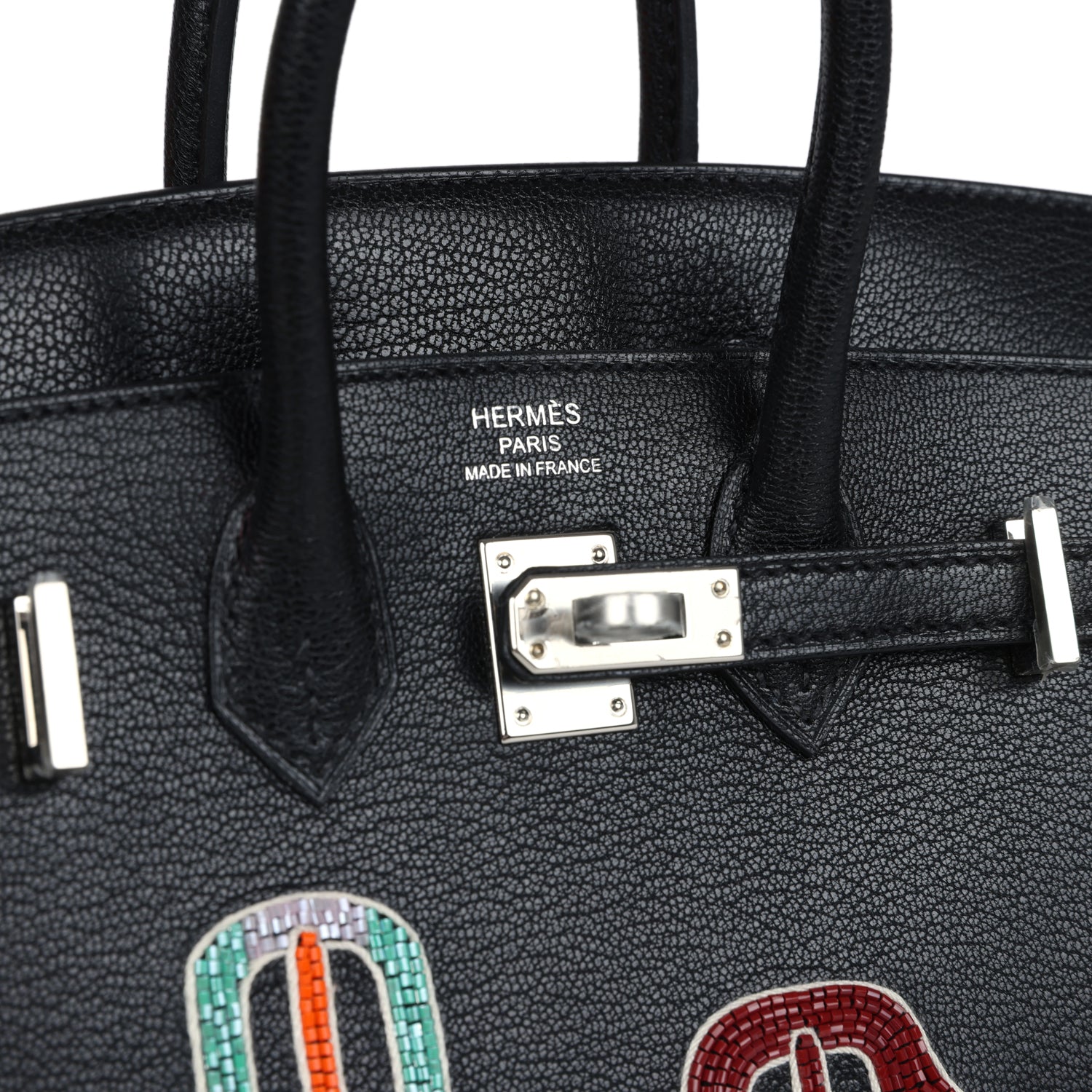 This limited edition “Bouclerie Moderne Casaque” Birkin is of Black Chevre Chamkila leather with palladium hardware featuring, tonal stitching, multicolored beaded belt buckles on front of the bag, front flap with two straps, front toggle closure, clochette with lock and two keys, and two rolled handles.