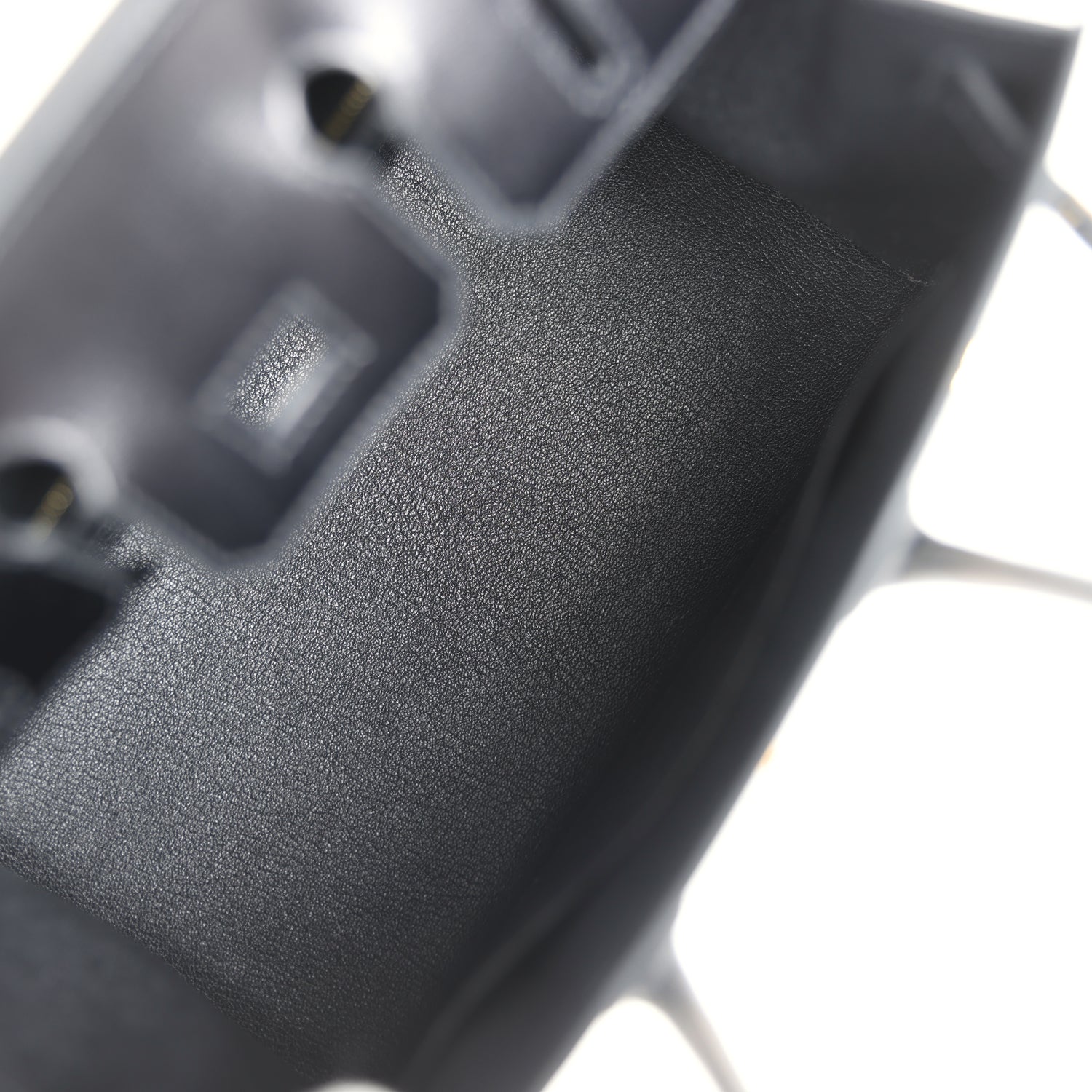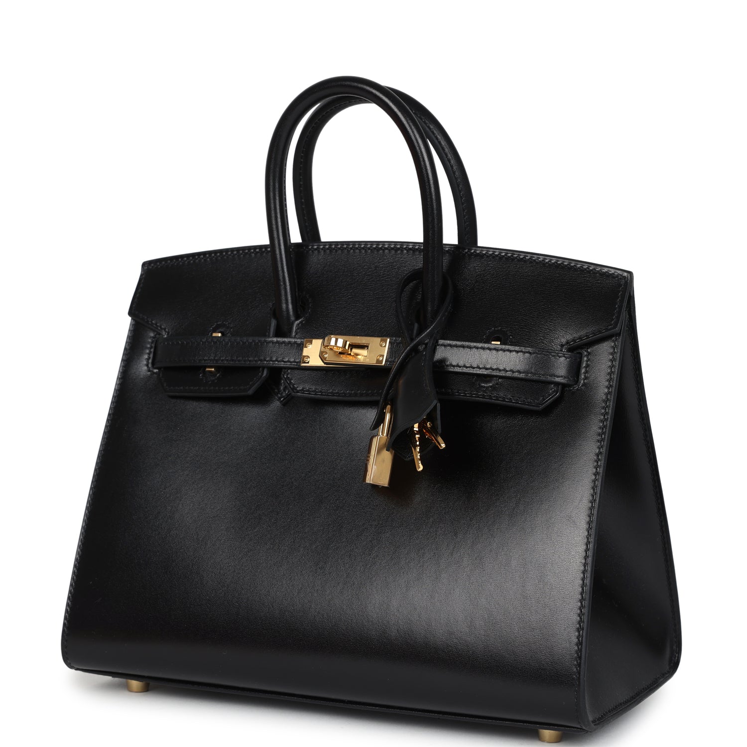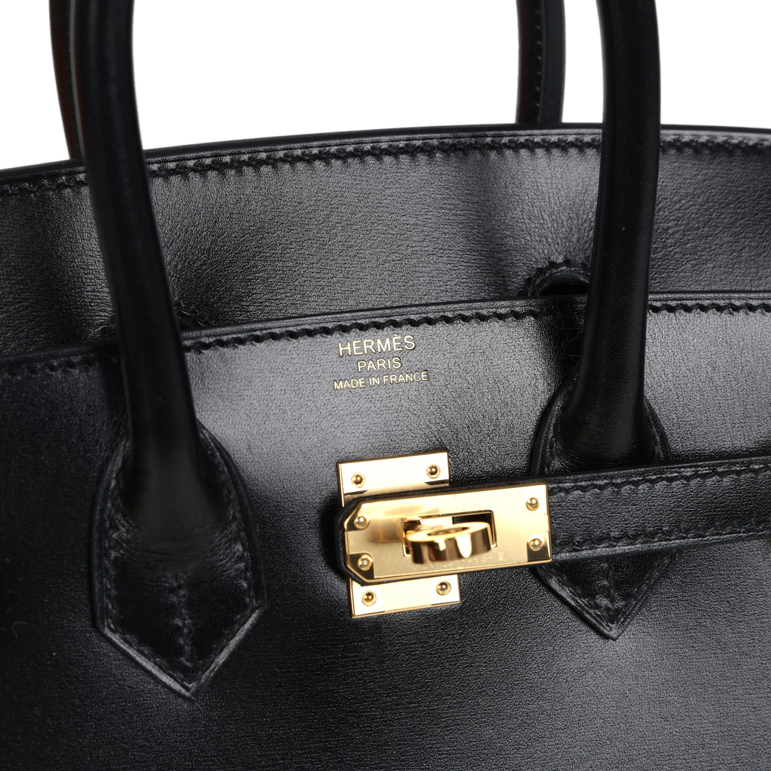This Birkin is in Black box calfskin leather with gold hardware, featuring tonal stitching, front flap with two straps, front toggle closure, clochette with lock and two keys, and double rolled handles.