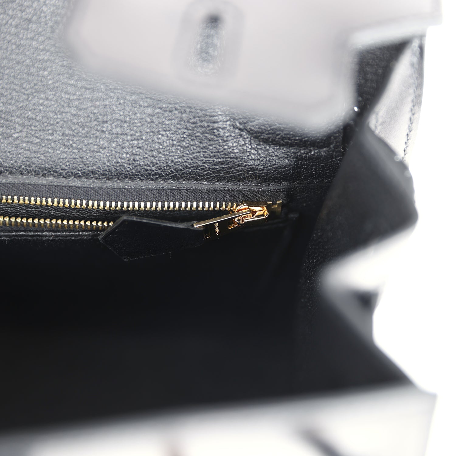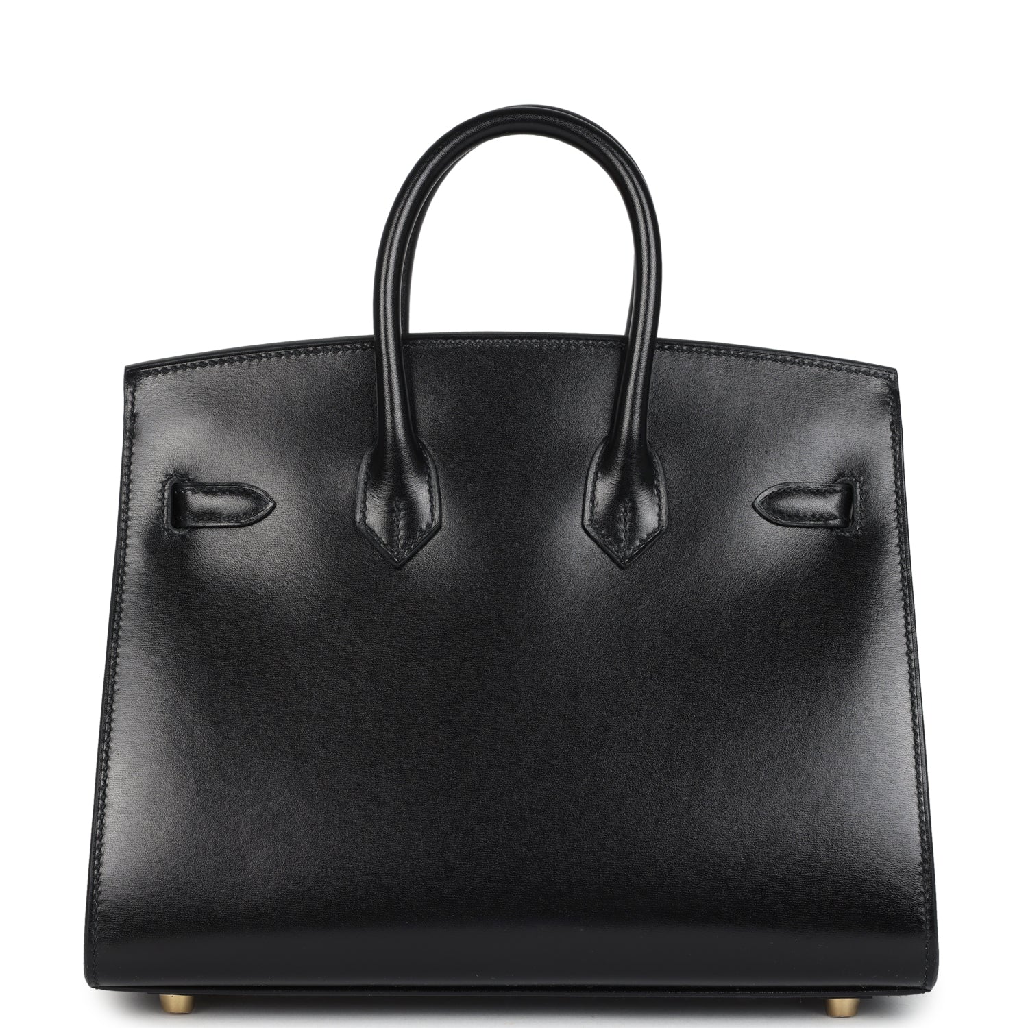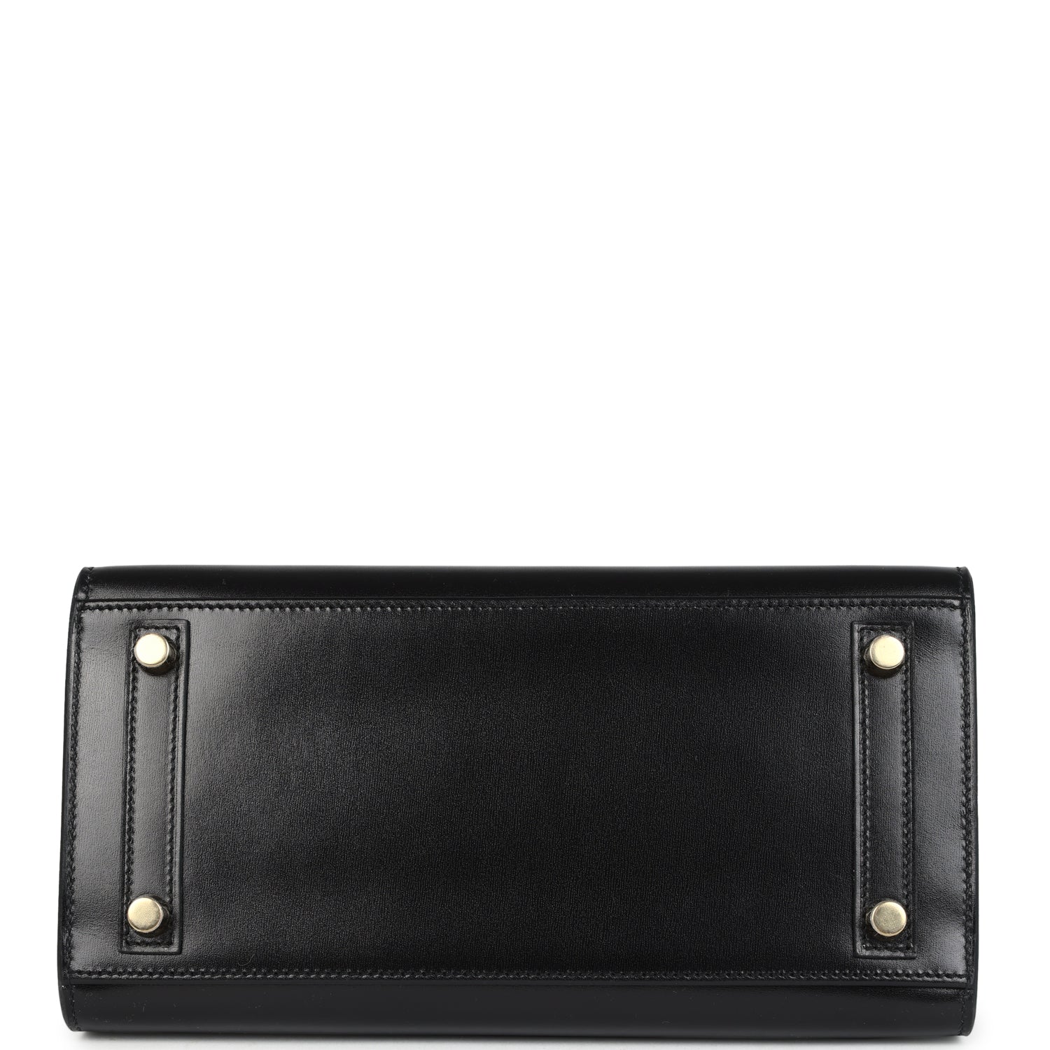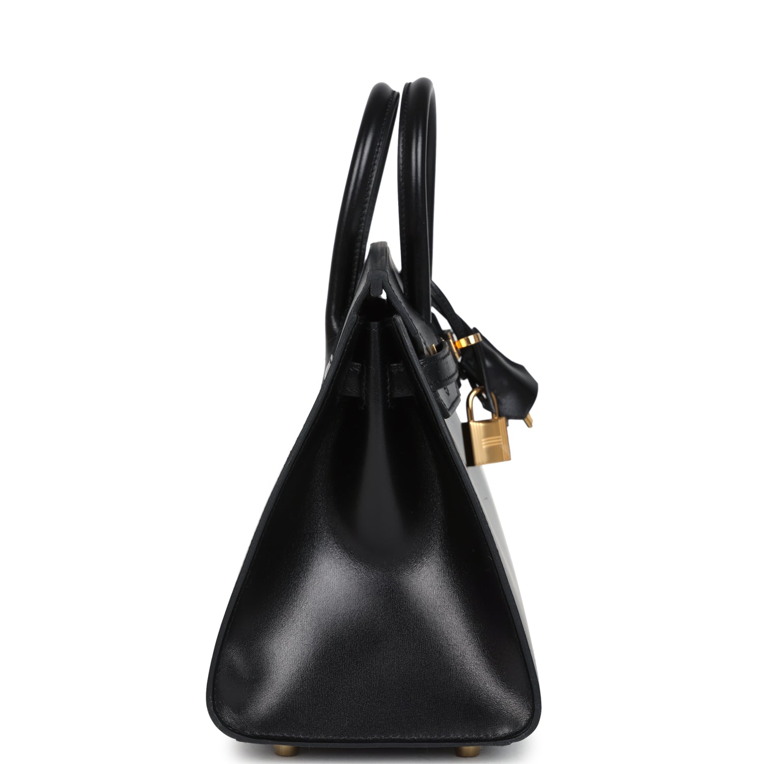This Birkin is in Black box calfskin leather with gold hardware, featuring tonal stitching, front flap with two straps, front toggle closure, clochette with lock and two keys, and double rolled handles.