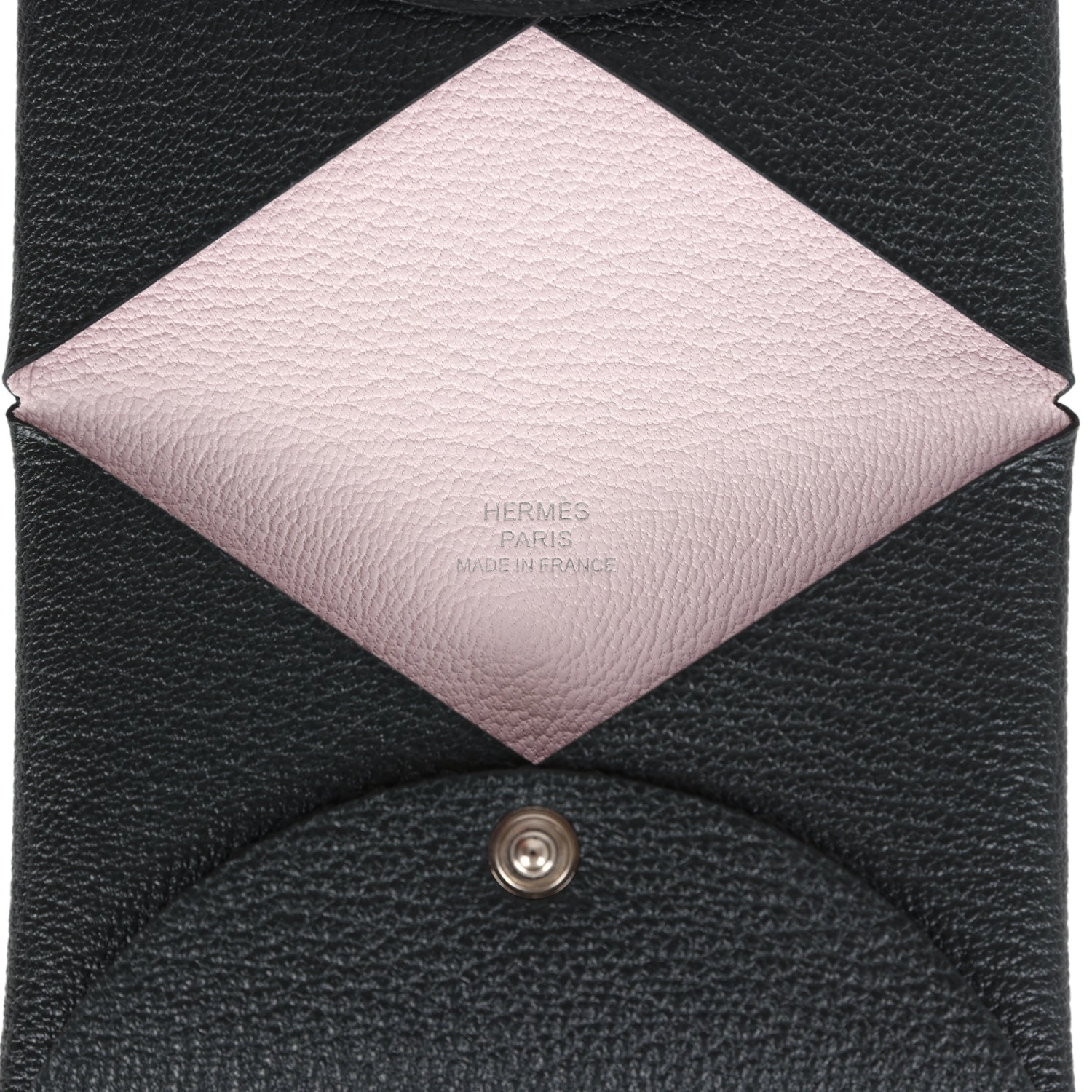 The interior is lined with Rose Sakura chevre leather and features one card slot and one snap compartment.