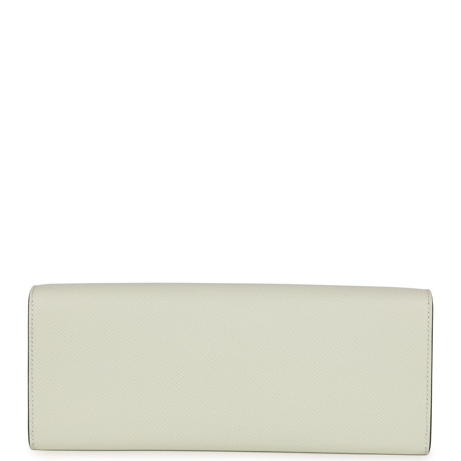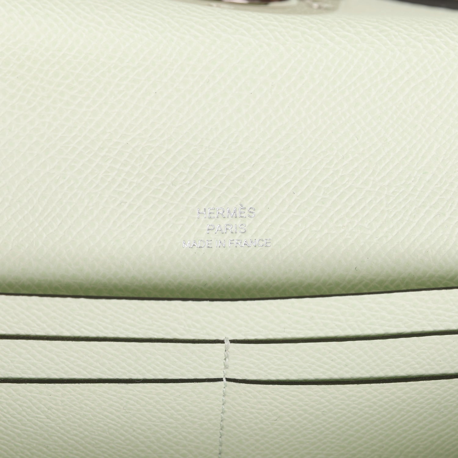 The interior is lined with Vert Fizz epsom leather and one main compartment with four credit card slots and a slip pocket.