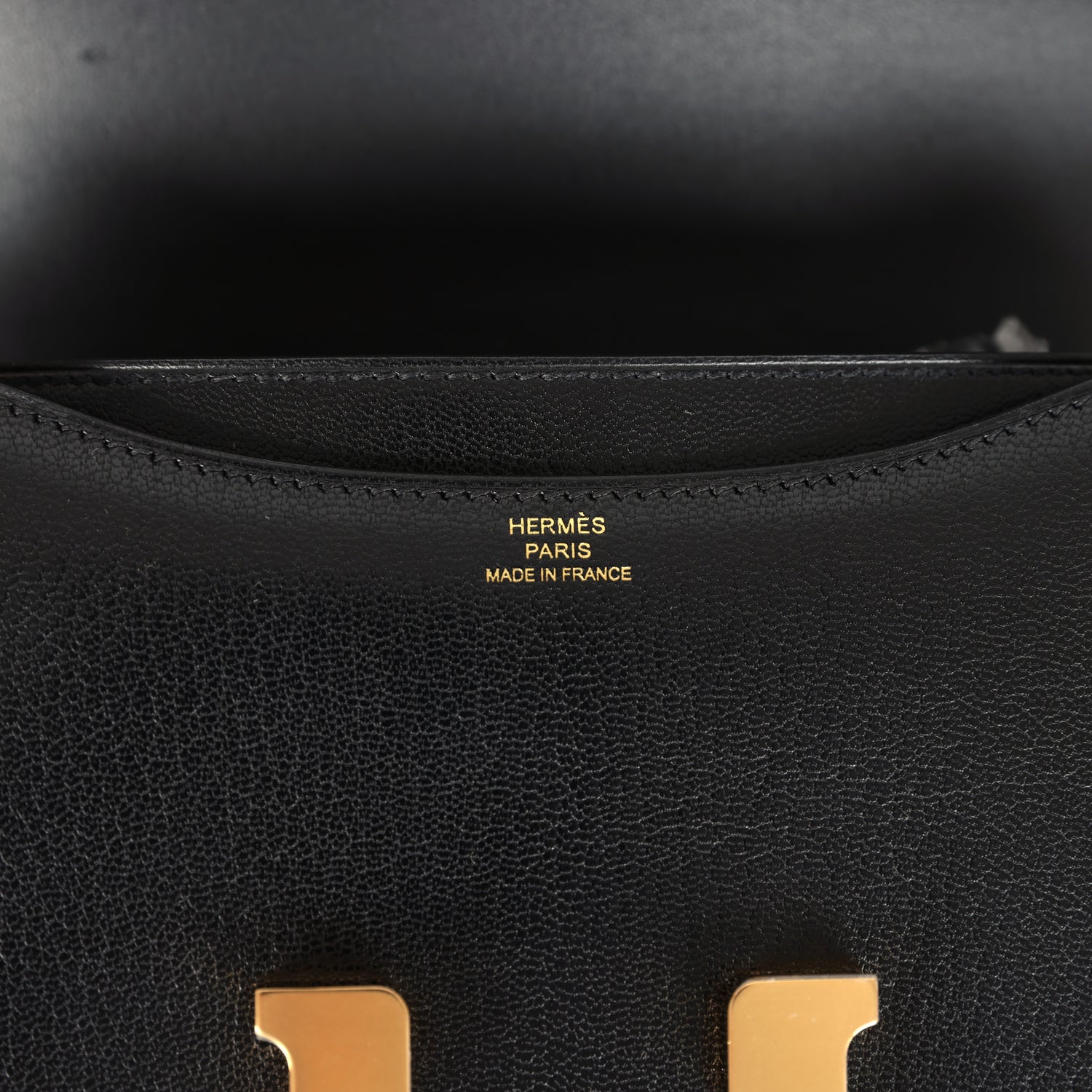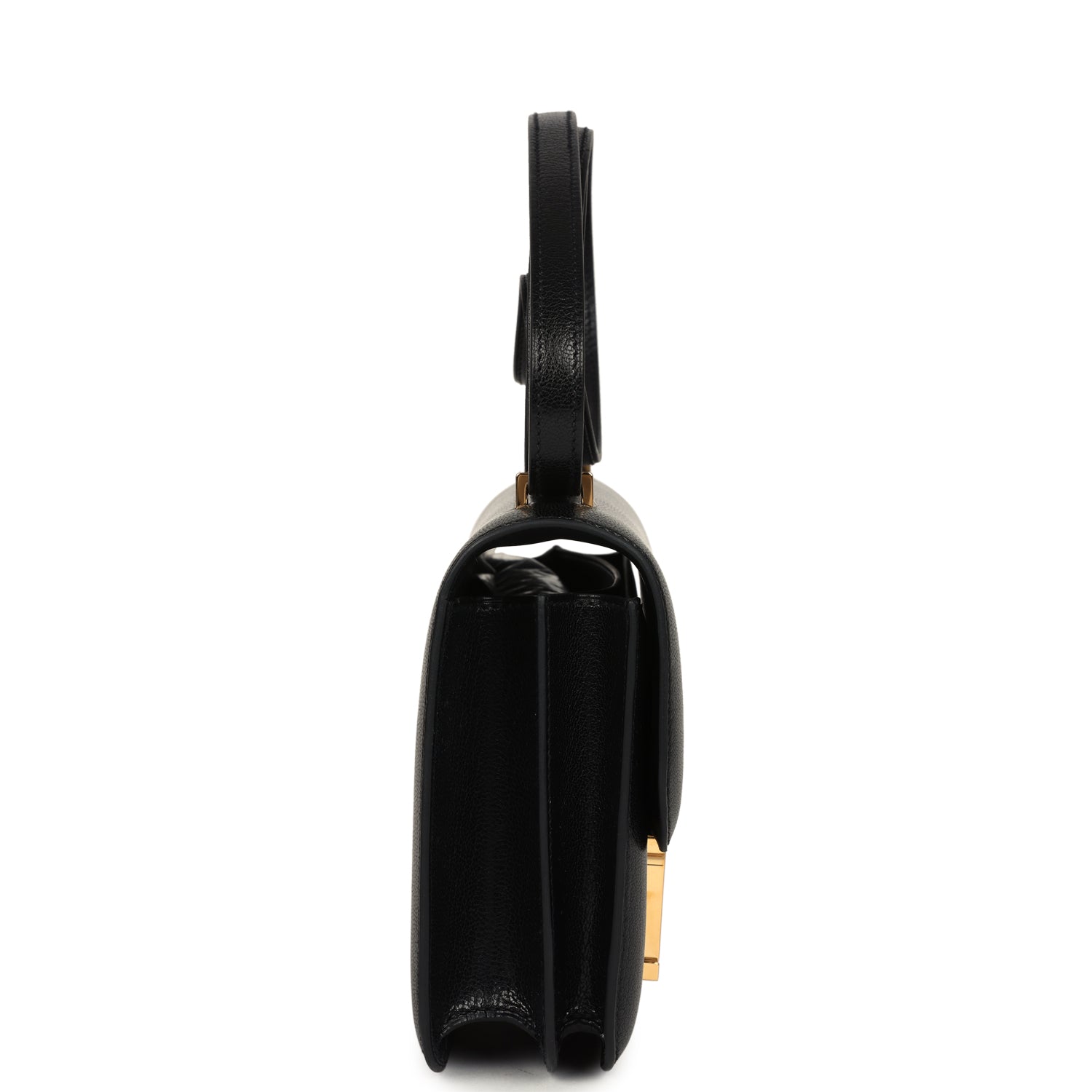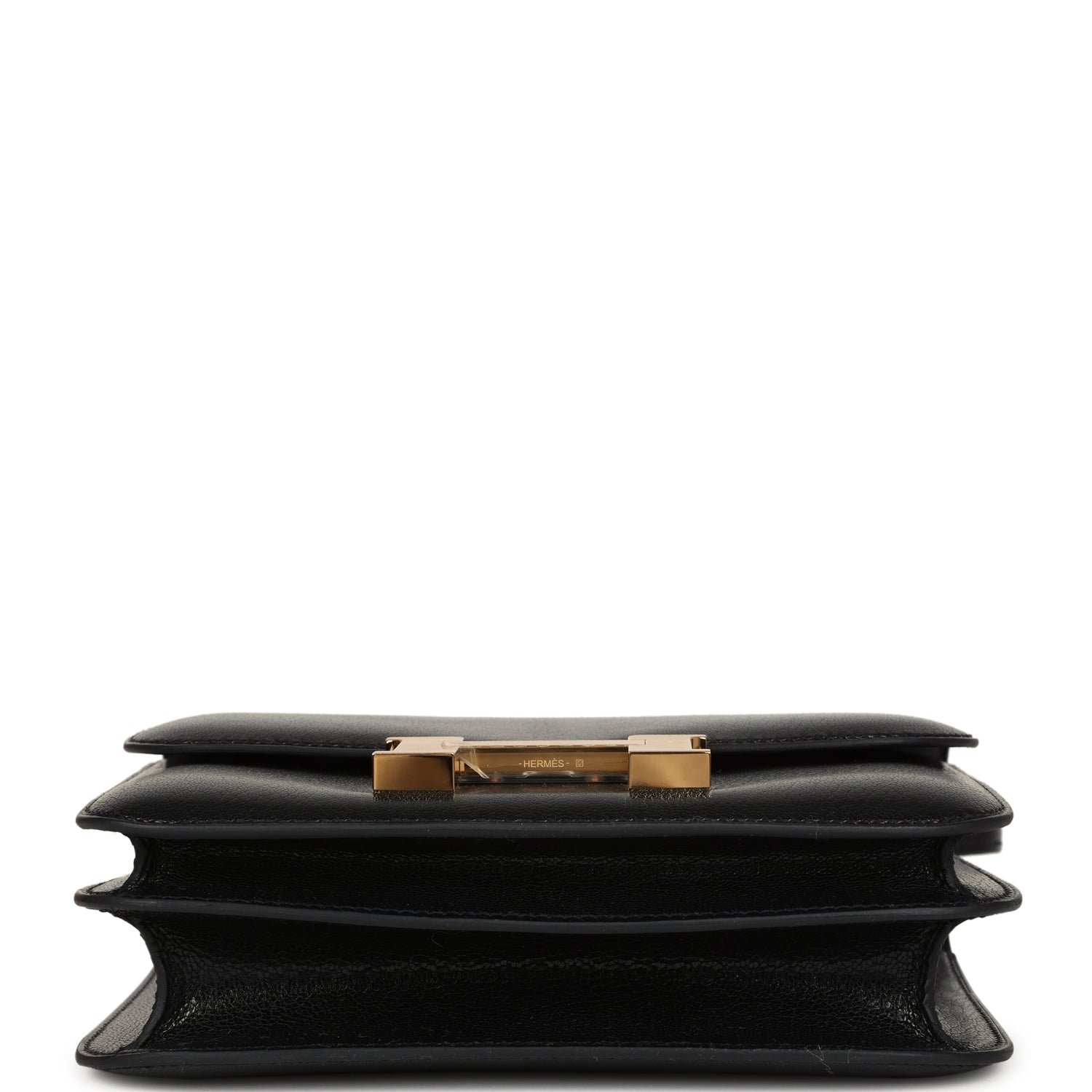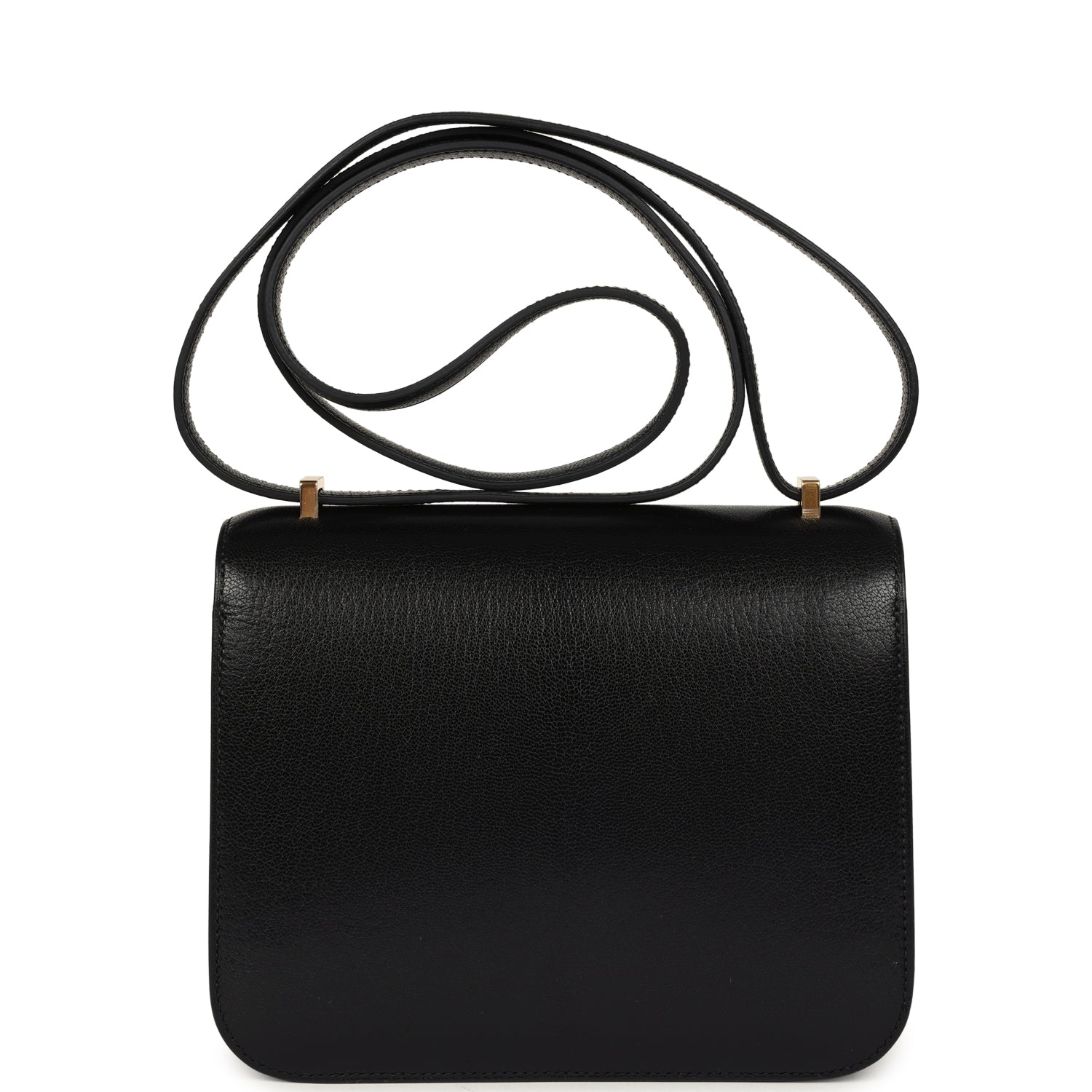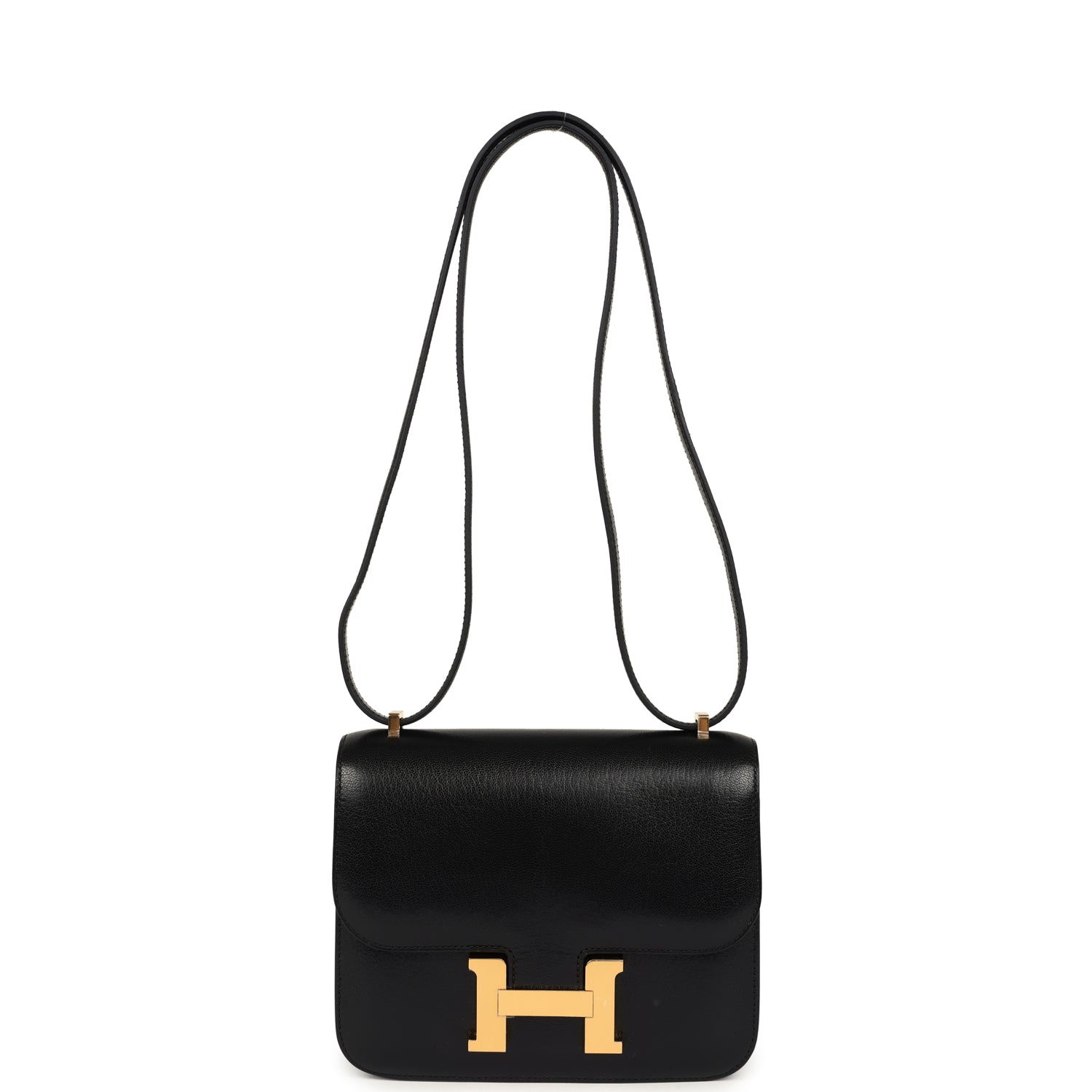 This Constance is in Black chevre chamkila leather with gold hardware and has tonal stitching, a metal "H" snap lock closure and adjustable shoulder strap.