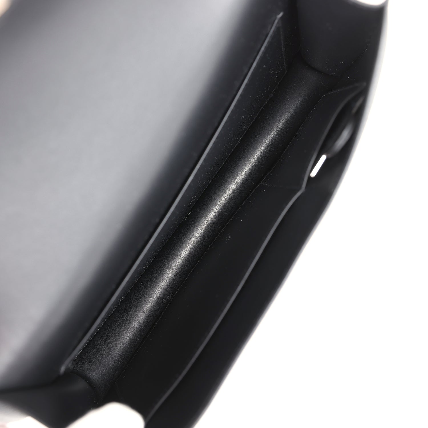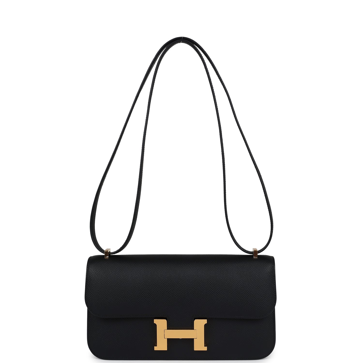 This Hermes Constance Elan is in Black epsom leather with gold hardware, featuring tonal stitching, metal "H" snap closure, and an adjustable strap.