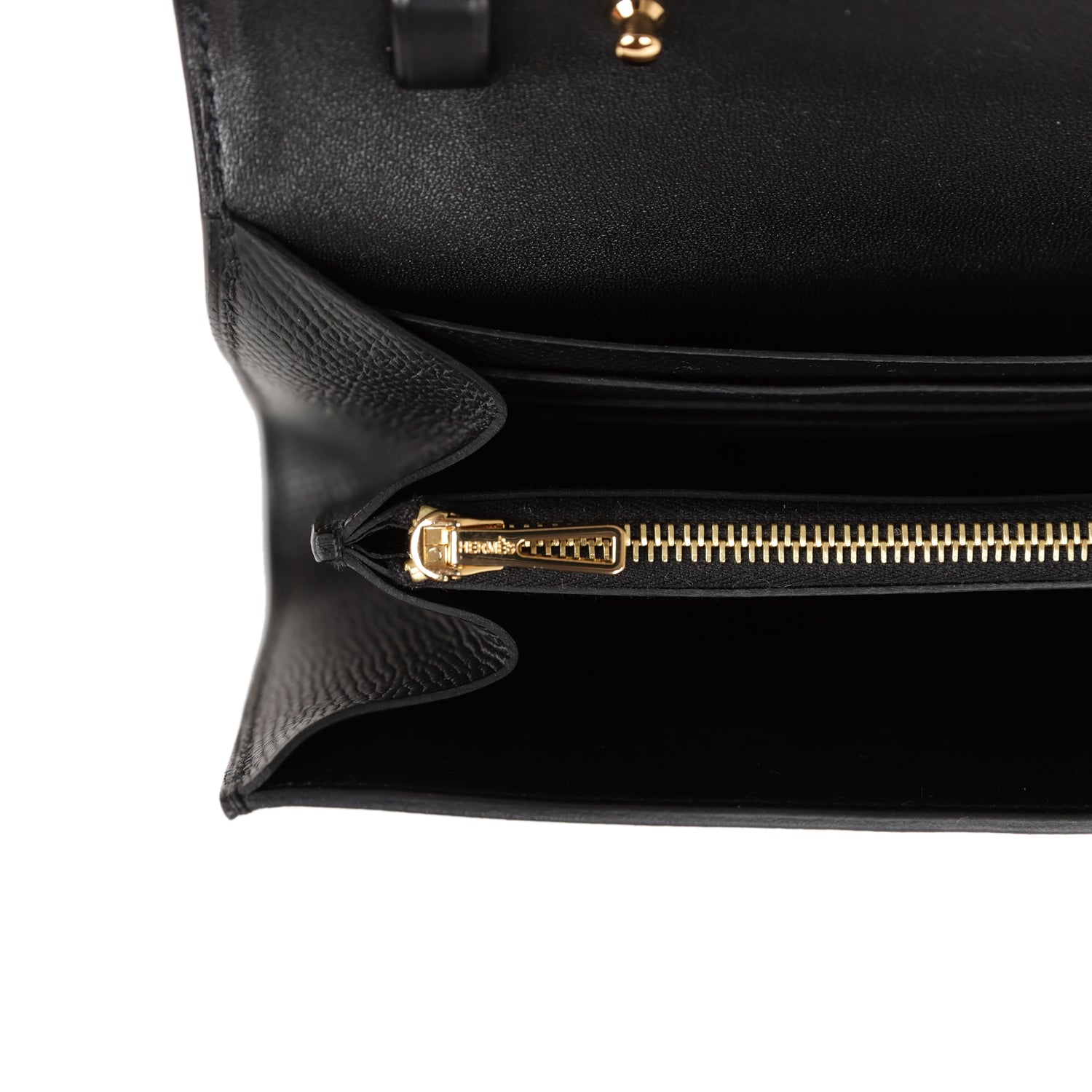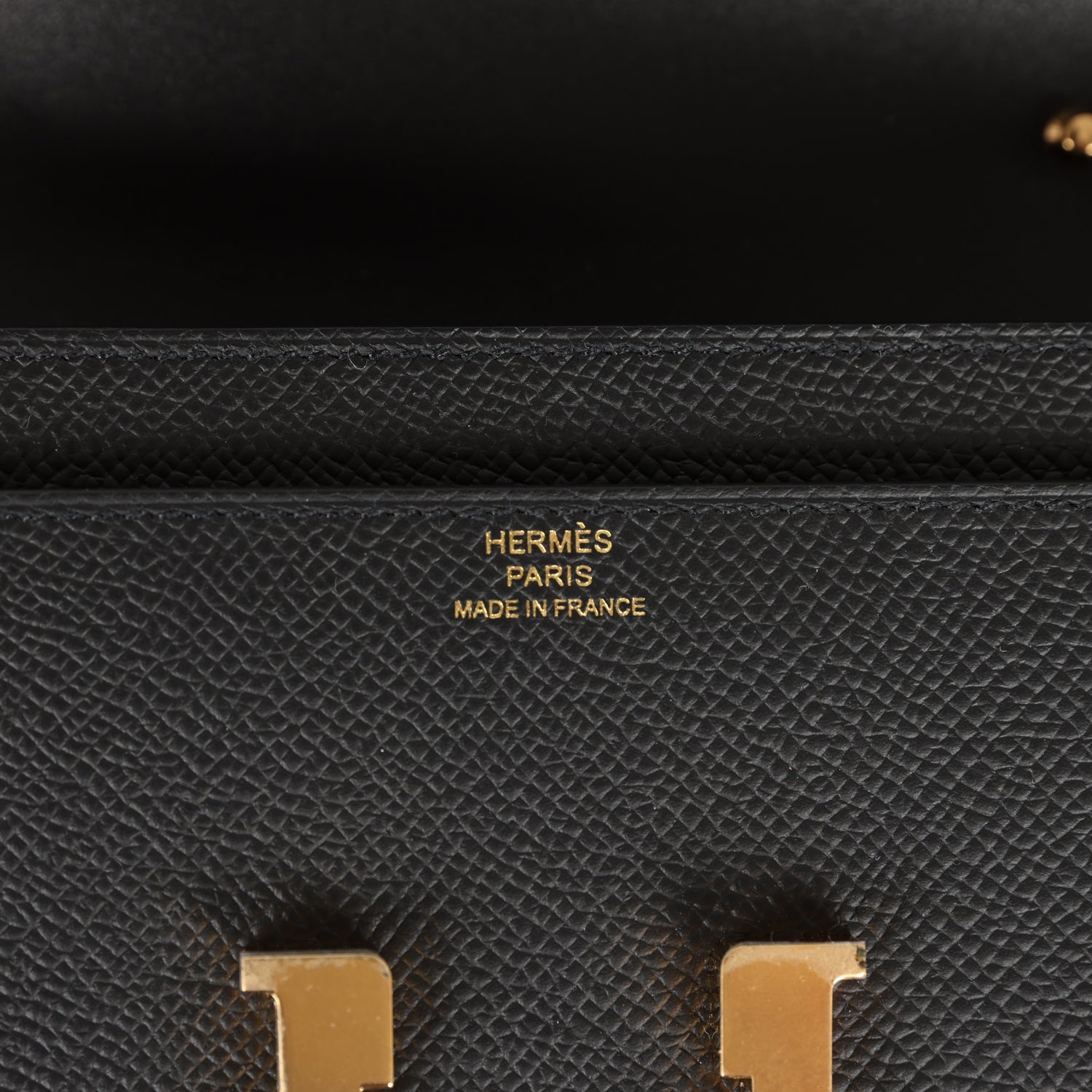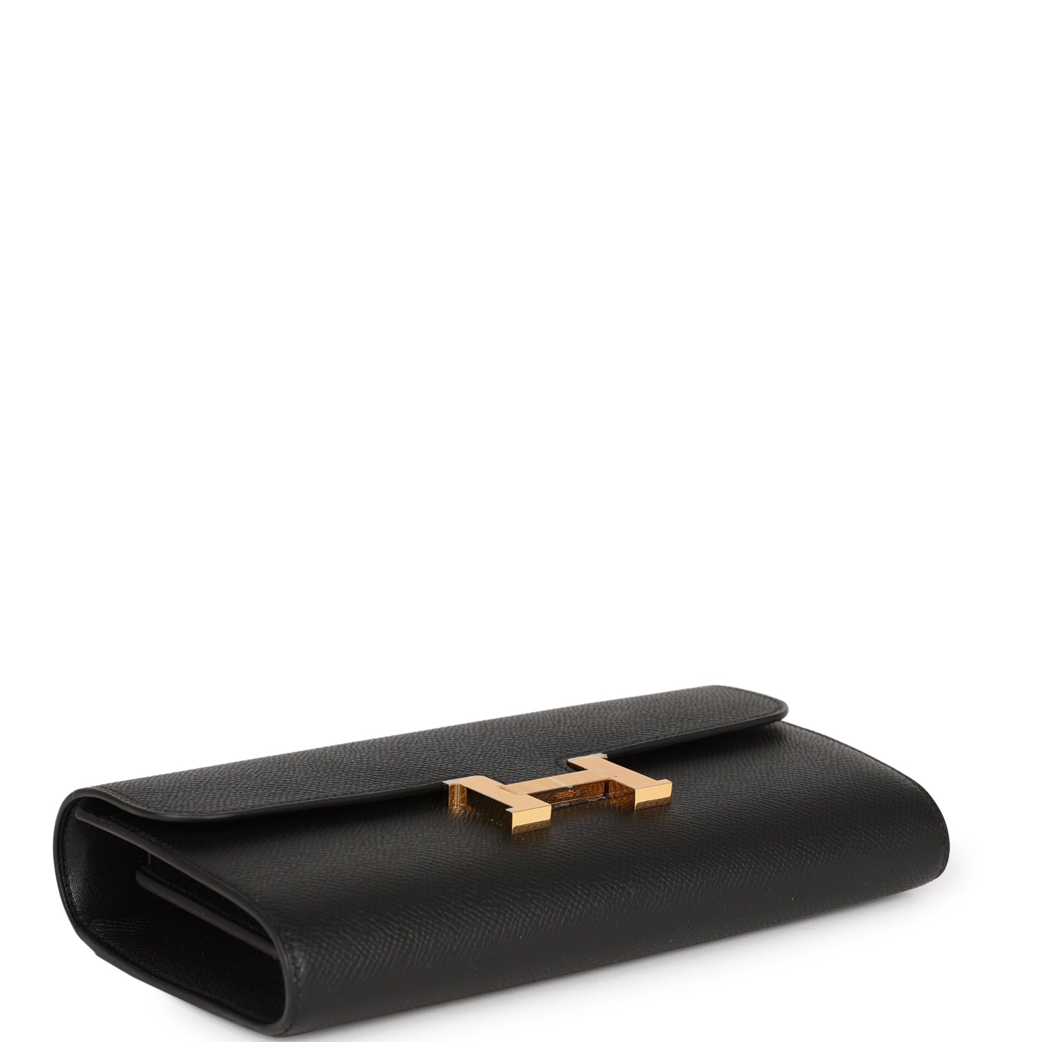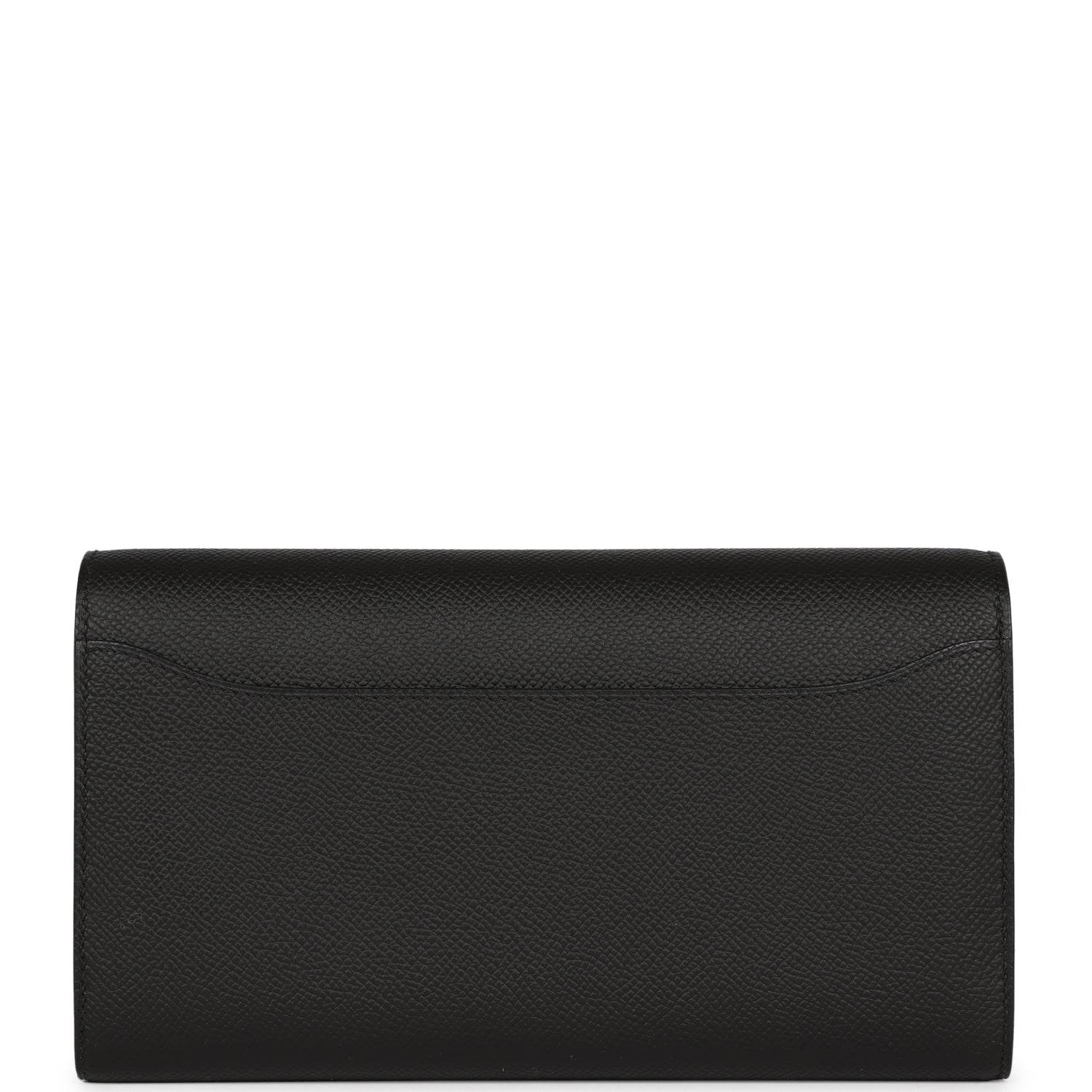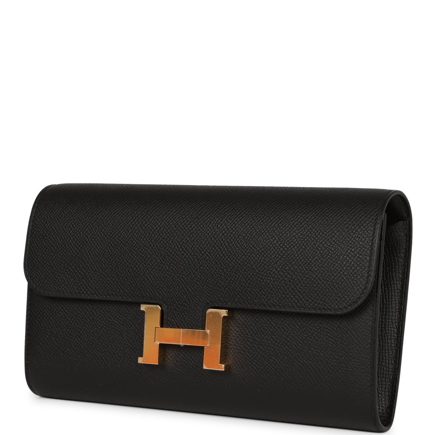 This Constance Wallet To Go is in Black epsom leather with gold hardware and has tonal stitching, metal "H" snap lock closure, open front compartment and removable crossbody strap.