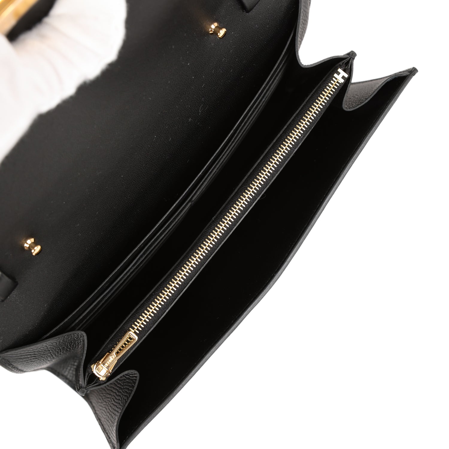 The interior is lined with Black epsom leather and two main compartments with six credit card slots and a zippered center compartment with Hermes H lock pull.