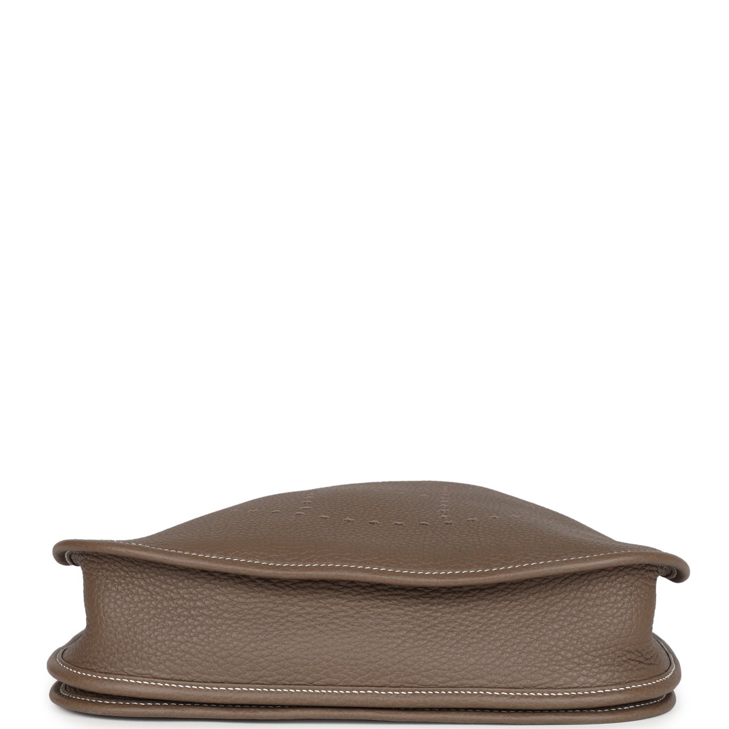 This Evelyne is in Etoupe clemence leather with gold hardware and has contrast stitching, pull tab top closure and Etoupe removable canvas and leather shoulder/crossbody strap.