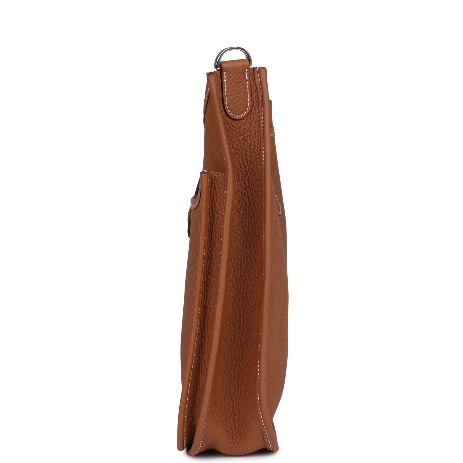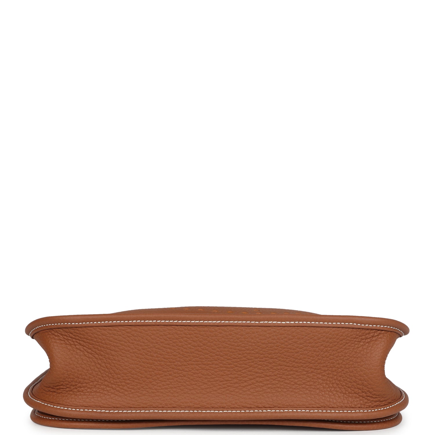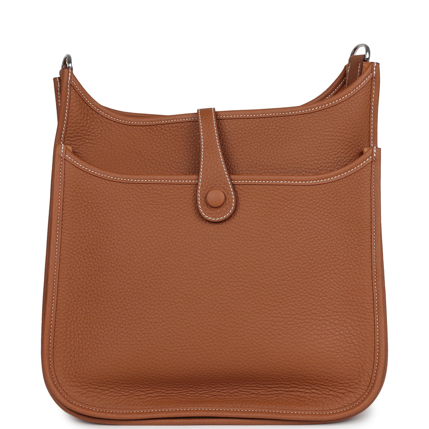 This Evelyne is in Gold clemence leather with palladium hardware and has contrast stitching, pull tab top closure and Gold removable canvas and leather shoulder/crossbody strap.