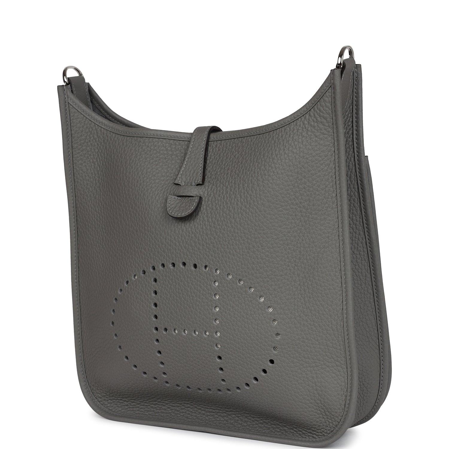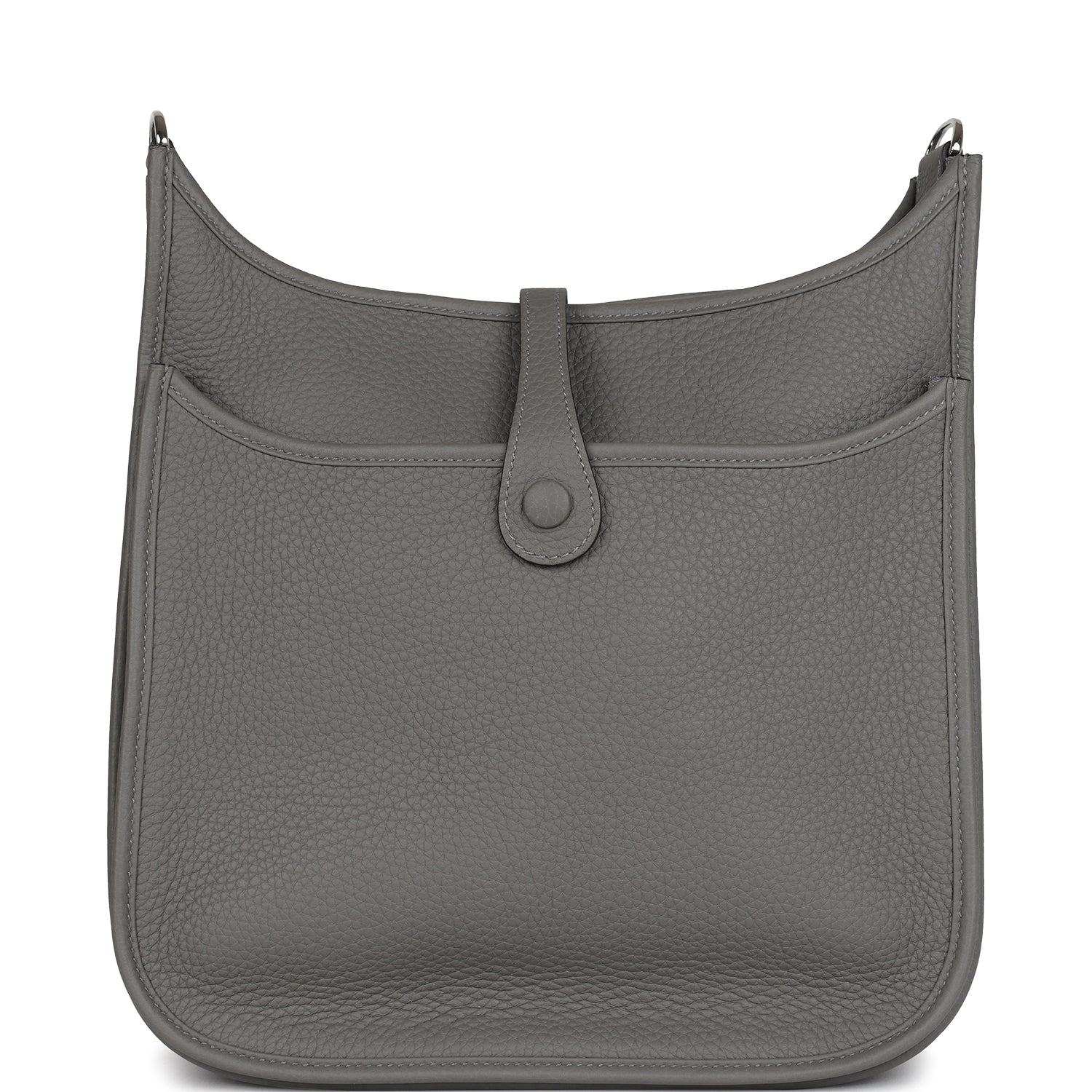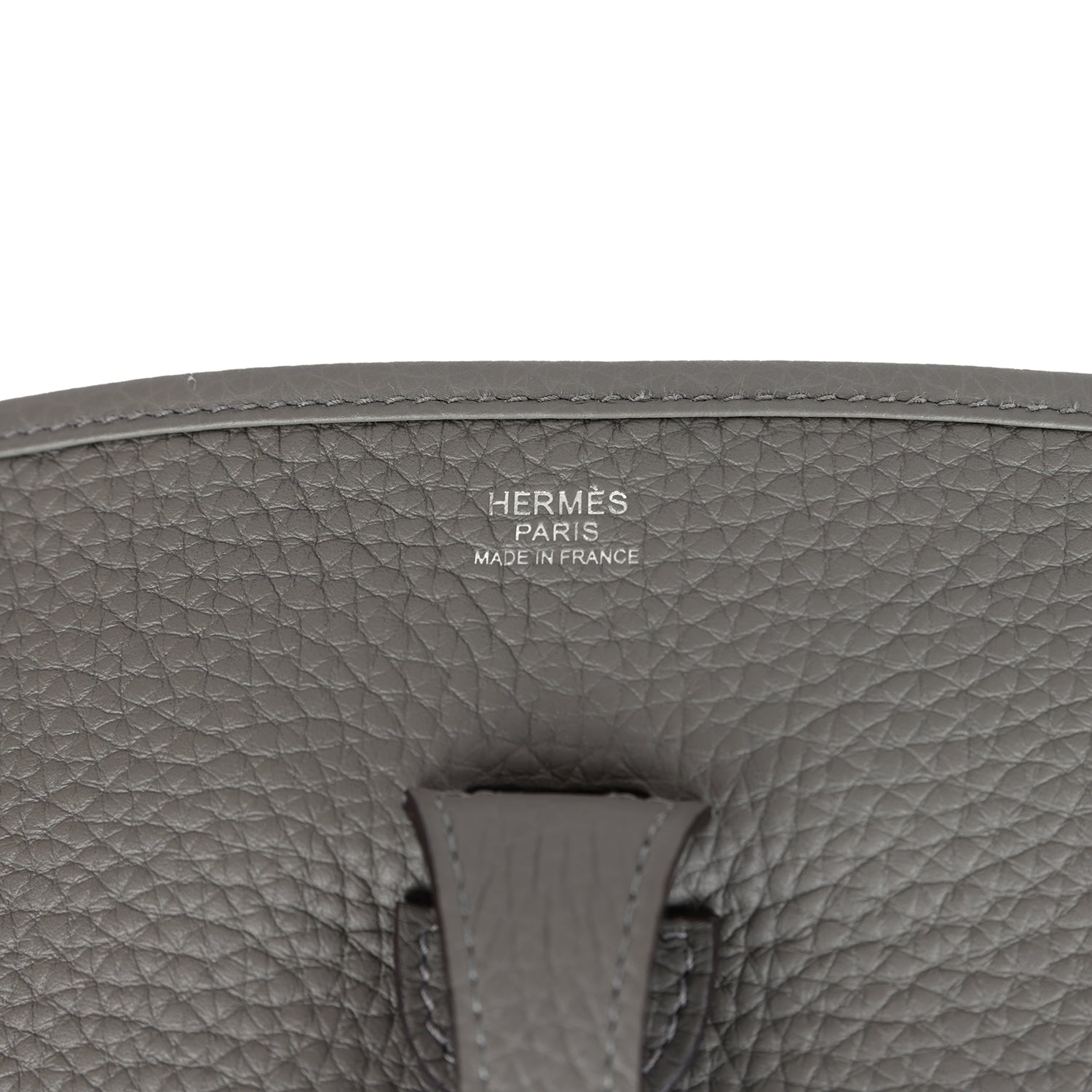 This Evelyne is in Gris Meyer clemence leather with palladium hardware and has tonal stitching, pull tab top closure and Gris Meyer removable canvas and leather shoulder/crossbody strap.