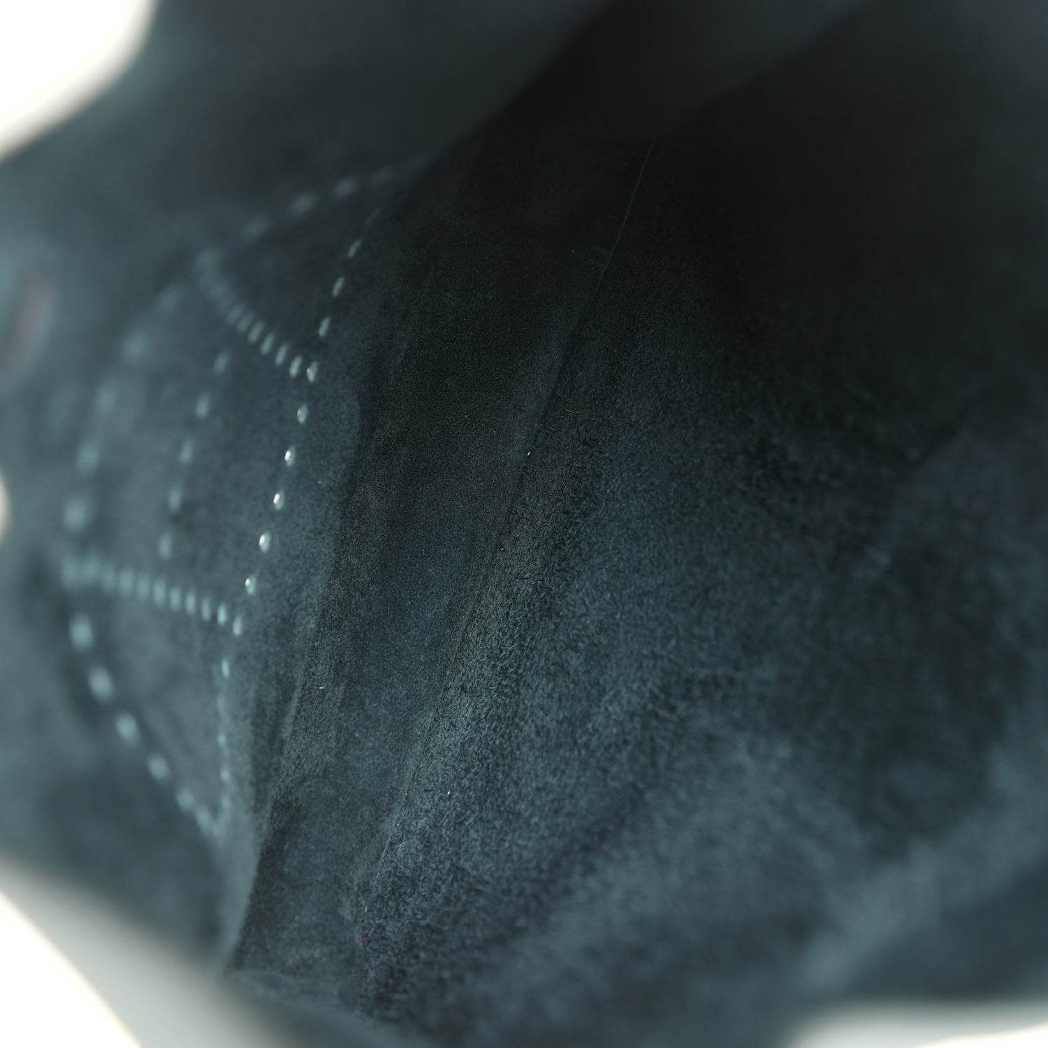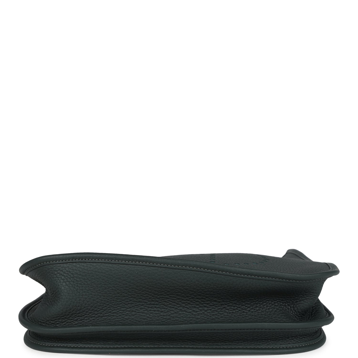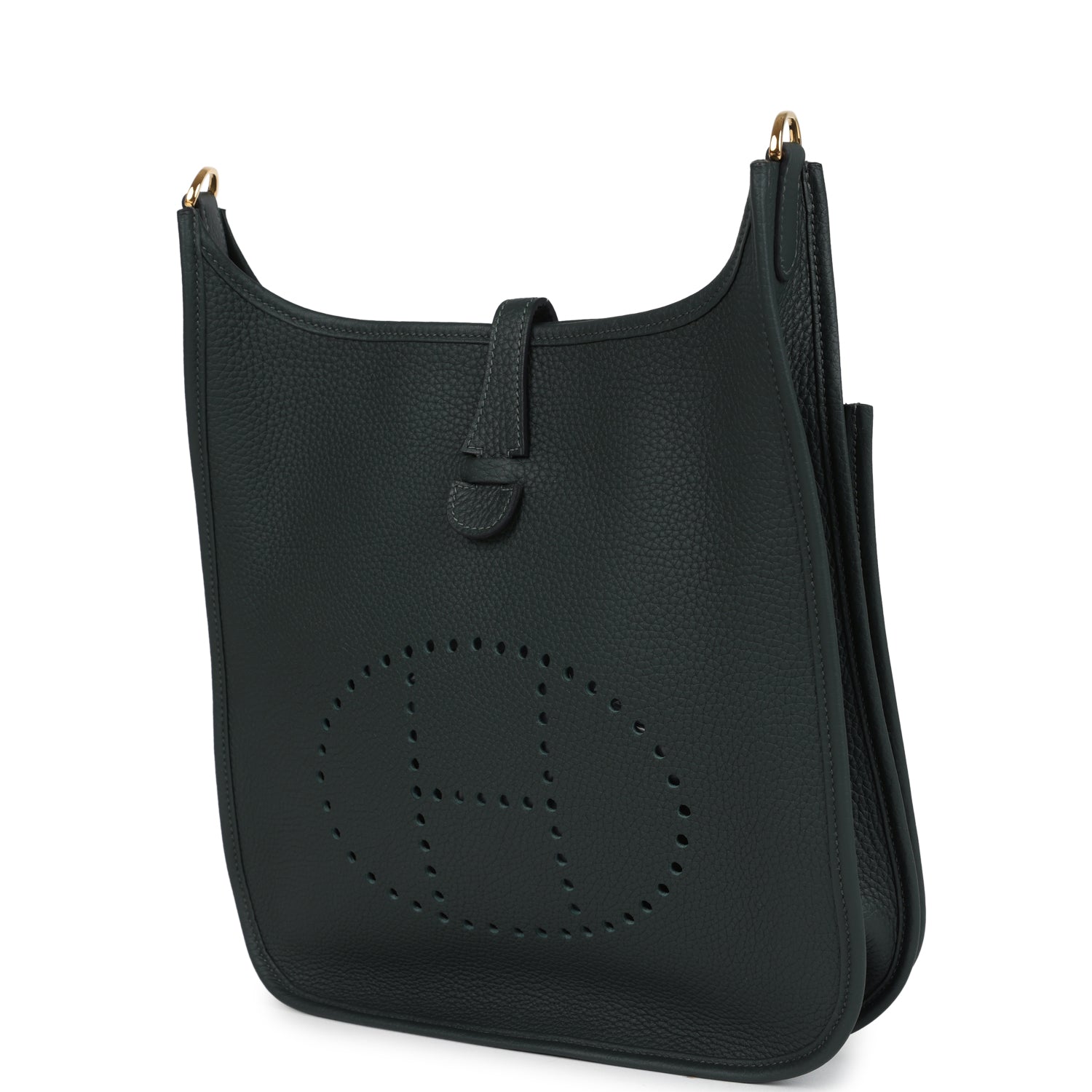 This Evelyne is of Vert Fonce clemence leather with gold hardware and has tonal stitching, large perforated H in circle (front) pull tab top closure and Vert Fonce removable canvas and leather shoulder/crossbody strap.