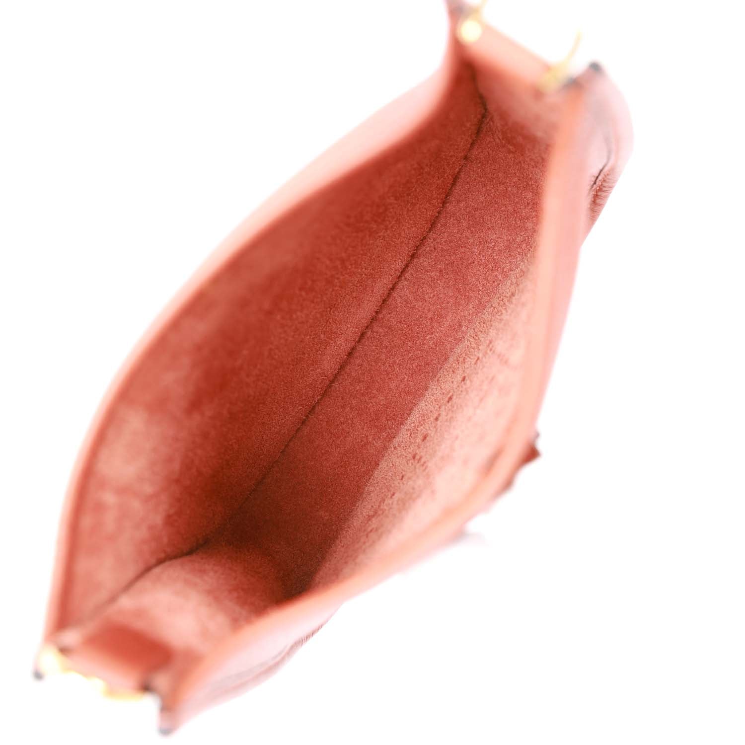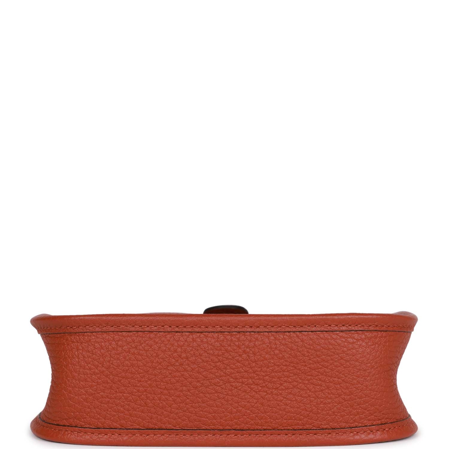 This Evelyne is Cuivre Taurillon Clemence leather Evelyne with tonal stitching, palladium hardware, large perforated H in circle (front), pull tab snap closure, and detachable Capucine/Parme/Rouge shoulder/crossbody strap.