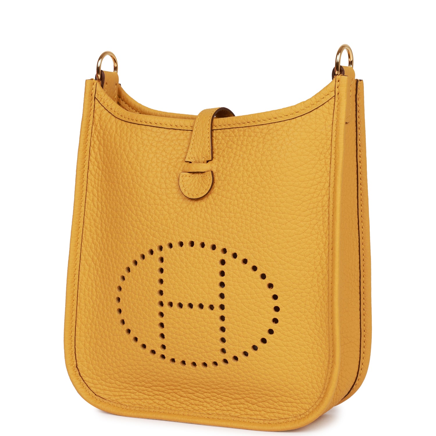 This Evelyne is in Jaune Ambre clemence leather with gold hardware and has tonal stitching, pull tab top closure and a Jaune Ambre removable canvas and leather shoulder/crossbody strap.