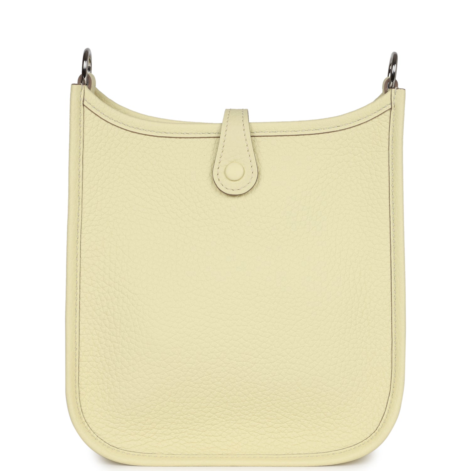 This Evelyne TPM is in Jaune Milton clemence with palladium hardware, tonal stitching large perforated H in circle (front), pull tab snap closure and a removable Jaune Milton wooly/canvas shoulder/crossbody strap.