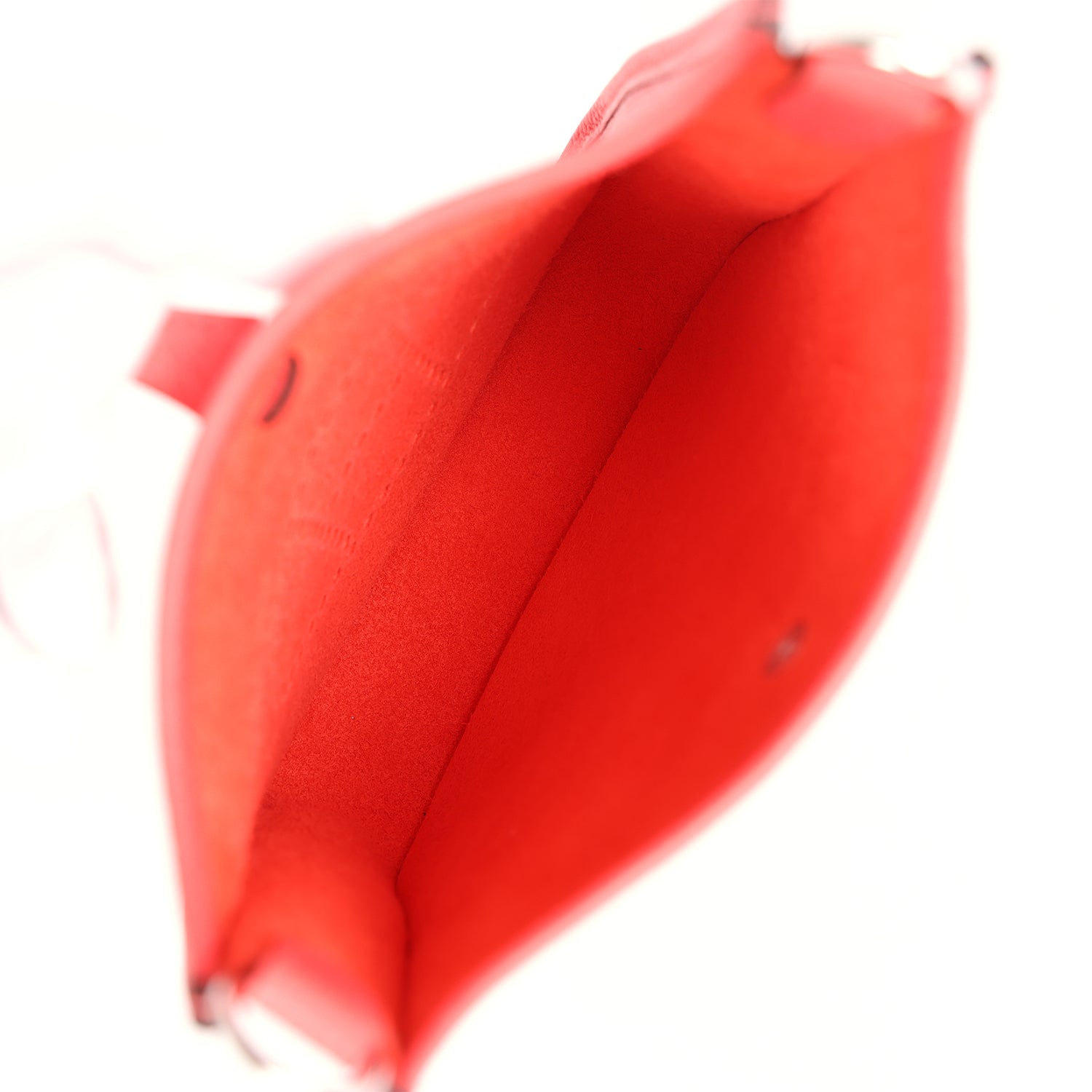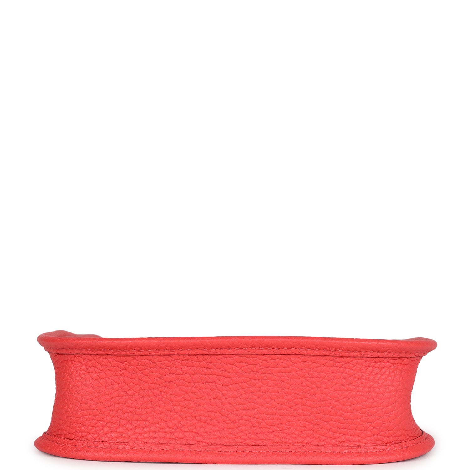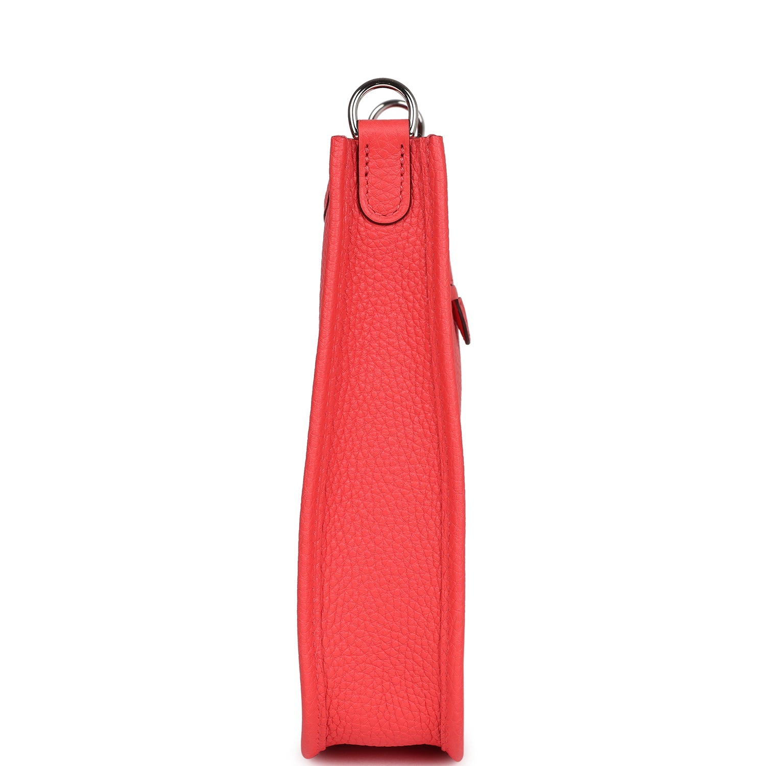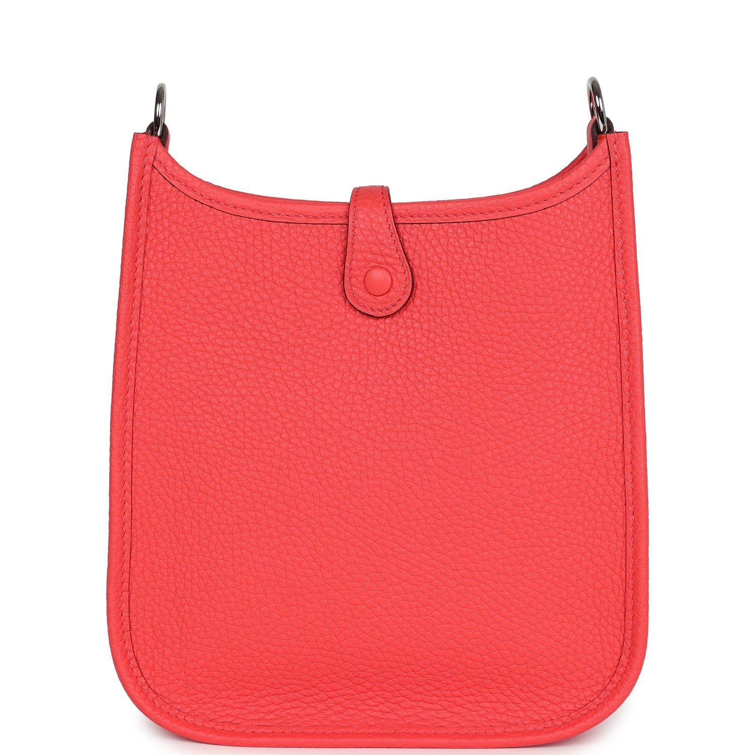 This Evelyne TPM is in Rose Texas clemence leather with palladium hardware and features tonal stitching stitching, pull tab top closure and a removable pull tab snap closure and a removable Rose Texas, Blanc, and Gold wooly canvas shoulder/crossbody strap.