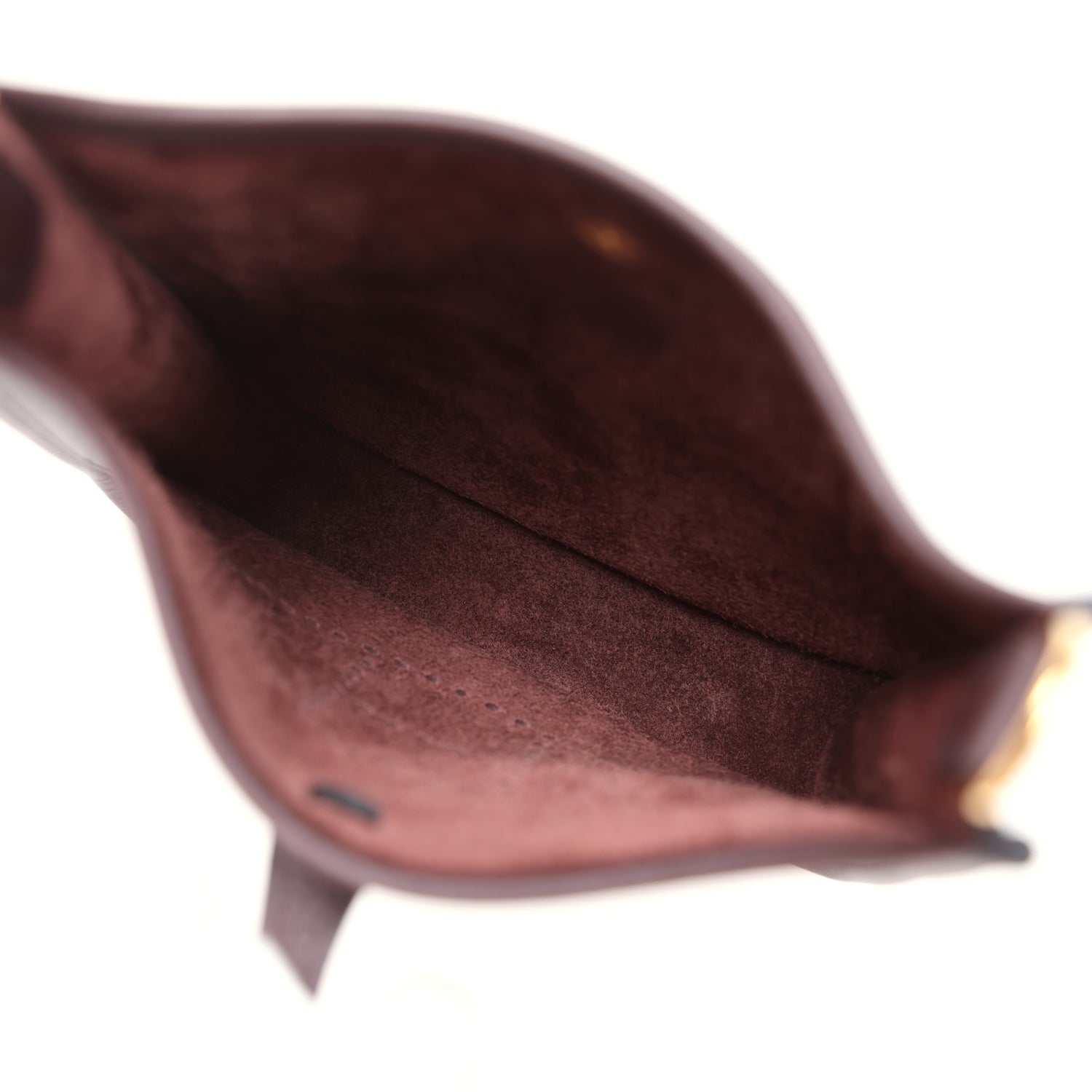 This Evelyne TPM is in Rouge Sellier clemence leather with gold hardware, tonal stitching large perforated H in circle (front), pull tab snap closure and a removable Rouge Sellier wooly/canvas shoulder/crossbody strap.