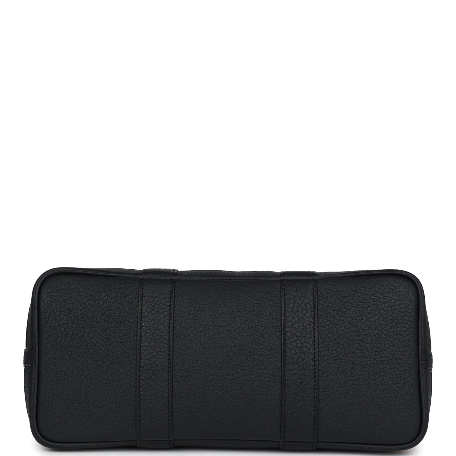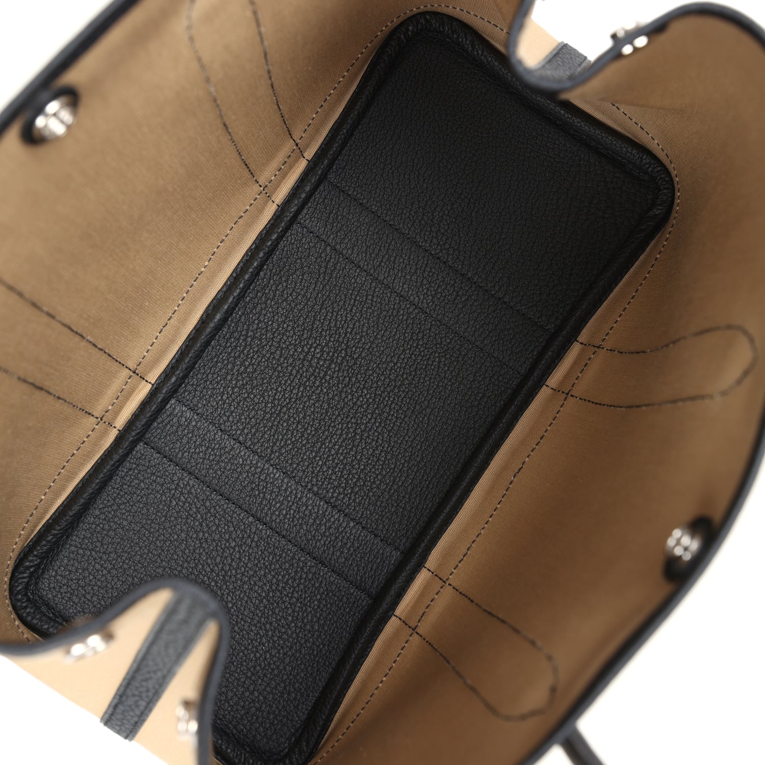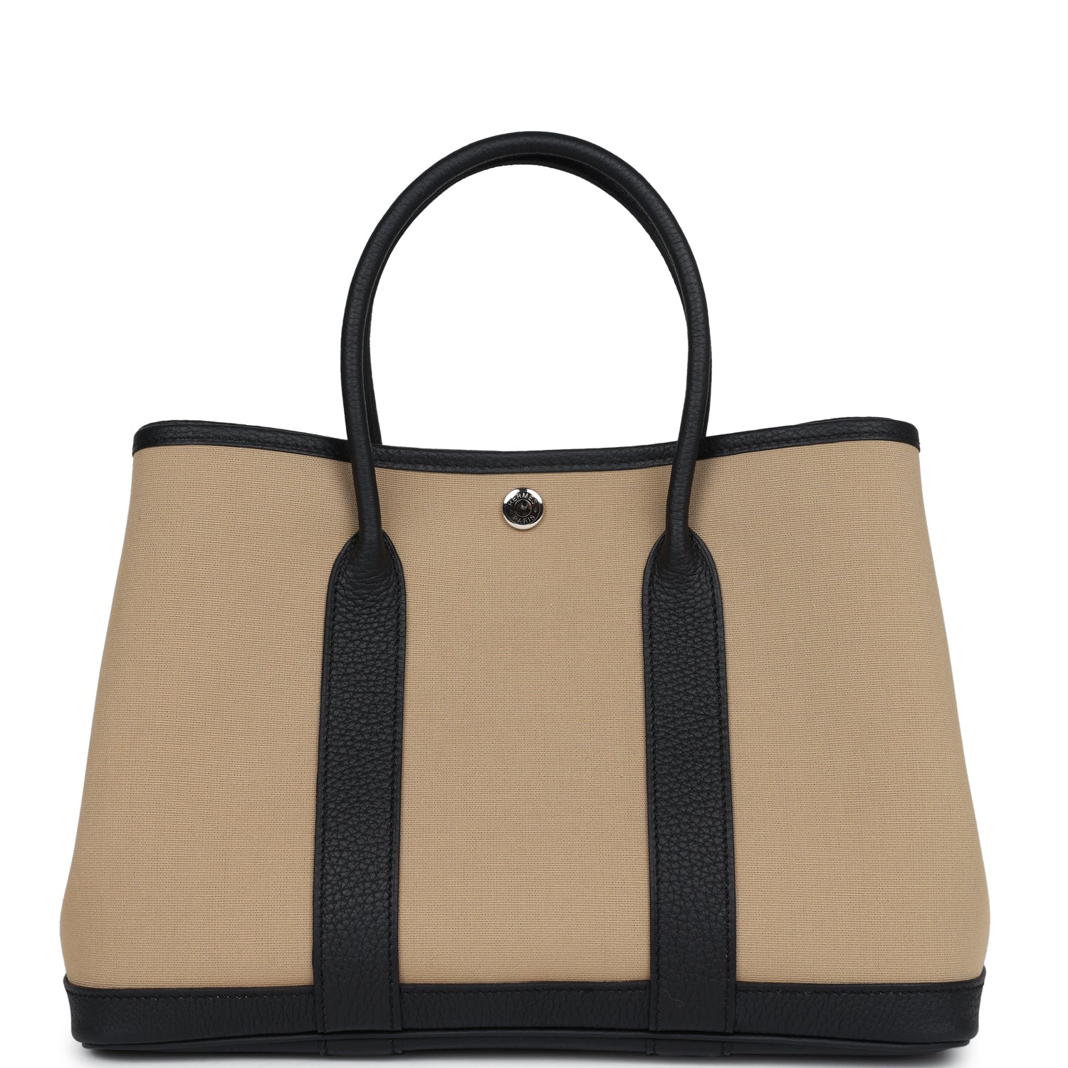 This Garden Party 30 Trench toile canvas and Black negonda leather with palladium hardware, and features tonal stitching, toile canvas lining, one engraved palladium front snap closure with two snap closures on side to adjust bag width. This bag features two Black negonda leather top handles.