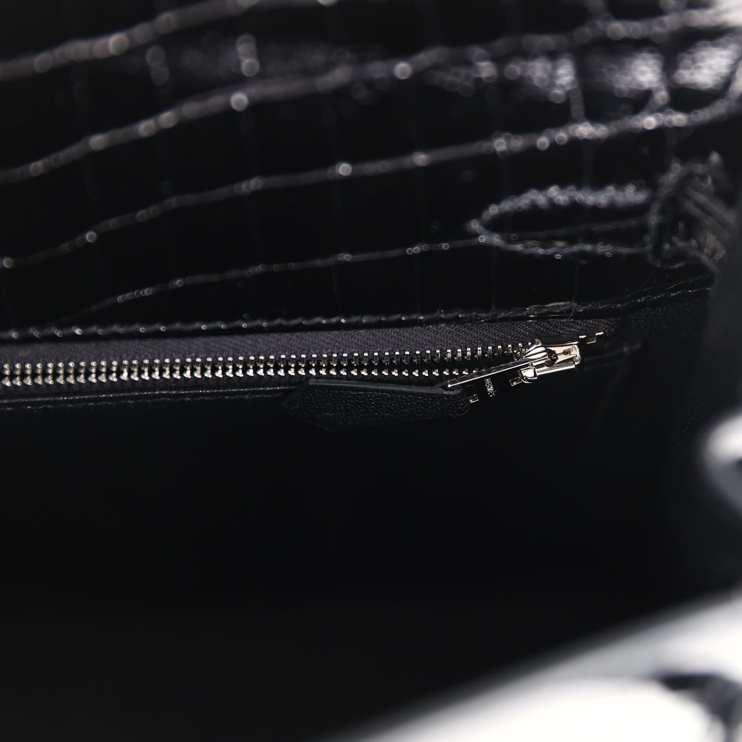 This Kelly, in the Sellier style, is in Black shiny Niloticus crocodile with palladium hardware and has tonal stitching, front flap, two straps with center toggle closure, clochette with lock and two keys, single rolled handle and removable strap.