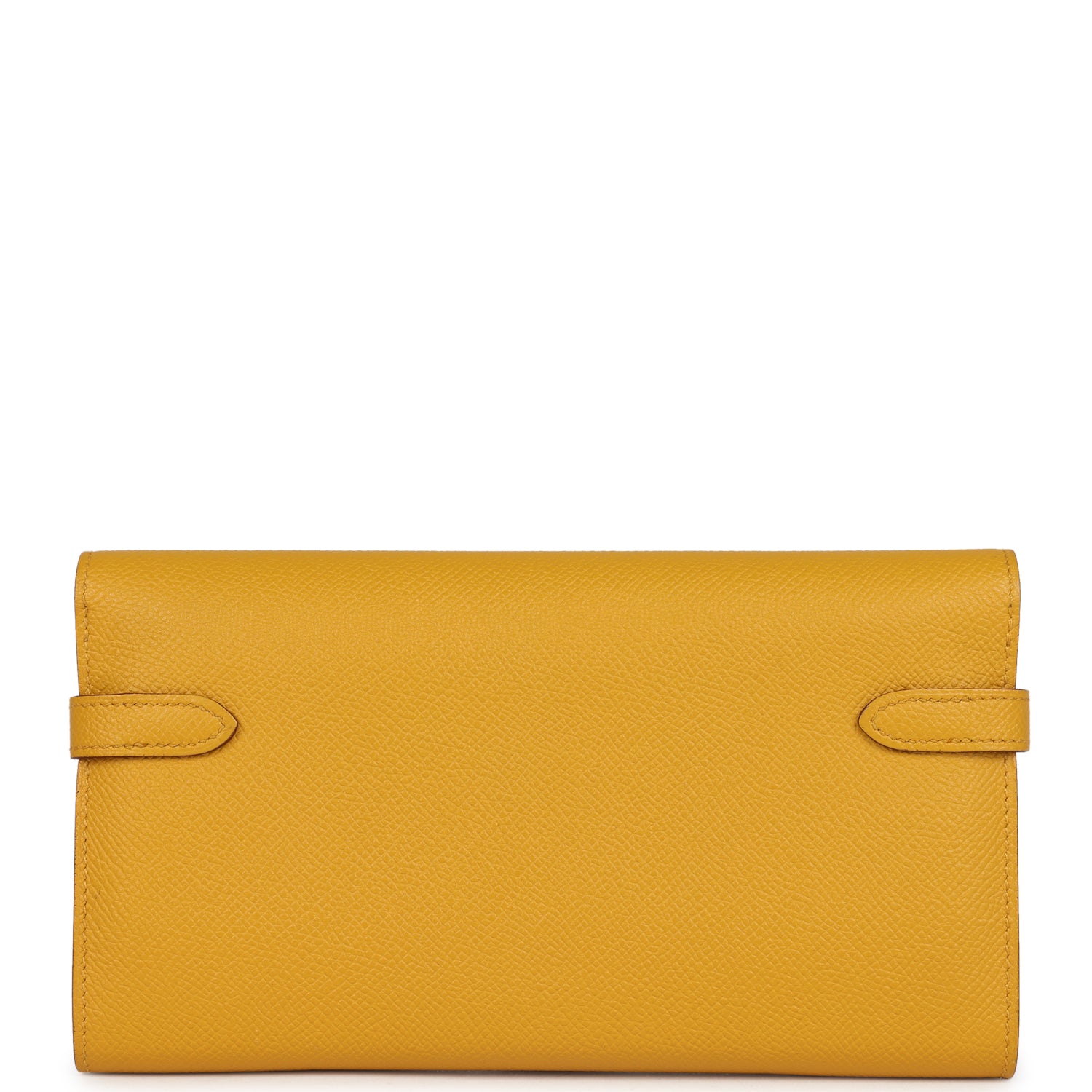 This Kelly Long Wallet is in Jaune Ambre epsom leather with gold hardware. This wallet, which can be used as a clutch, has tonal stitching and a front toggle closure.