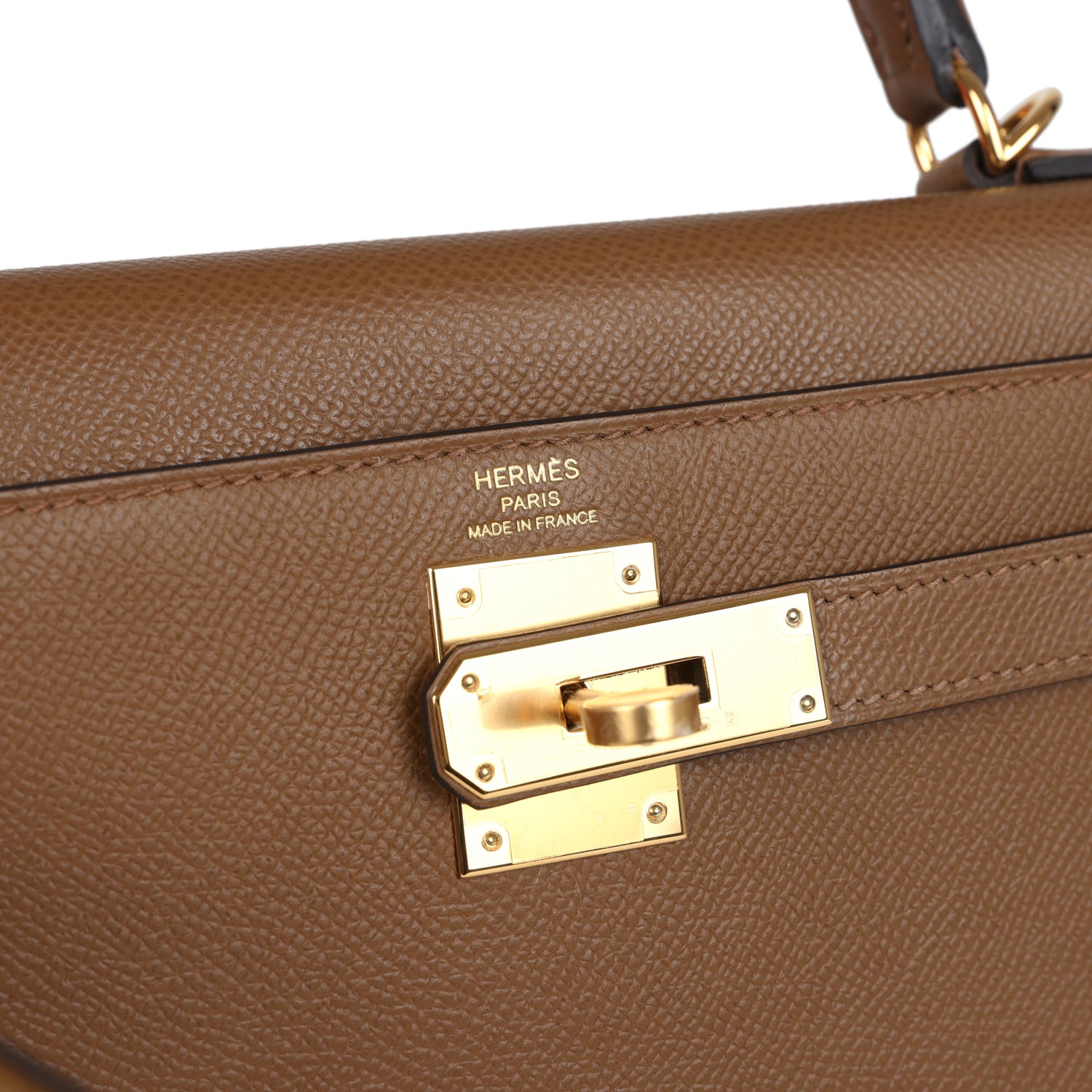 This Kelly, in the Sellier style, is in Alezan epsom leather with gold hardware and has tonal stitching, front flap, two straps with center toggle closure, clochette with lock and two keys a single rolled handle and removable shoulder strap.