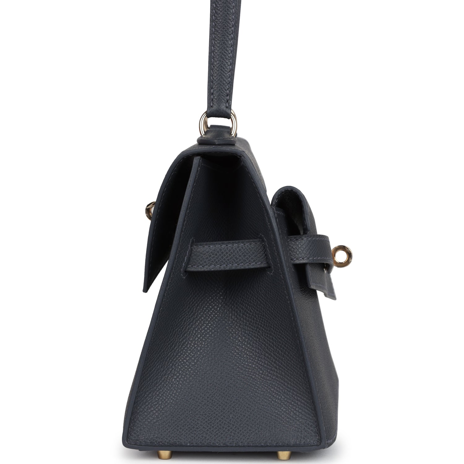 This Limited Edition Kelly Sellier en Desordre is in Ardoise epsom leather with palladium hardware and has tonal stitching, distorted flaps with turnlock closures, one exterior flap pocket and single shoulder strap.