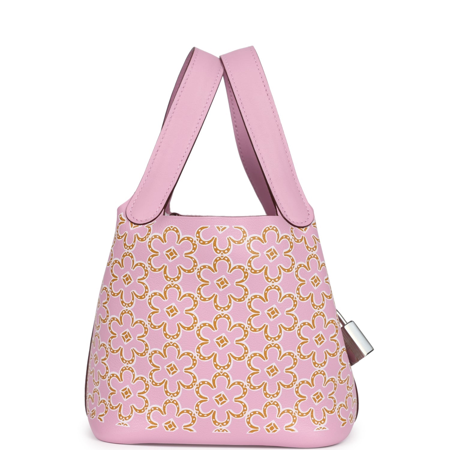 This limited edition "Lucky Daisy" Picotin Lock is in Mauve Sylvestre swift leather with palladium hardware and has tonal stitching with two top handles.