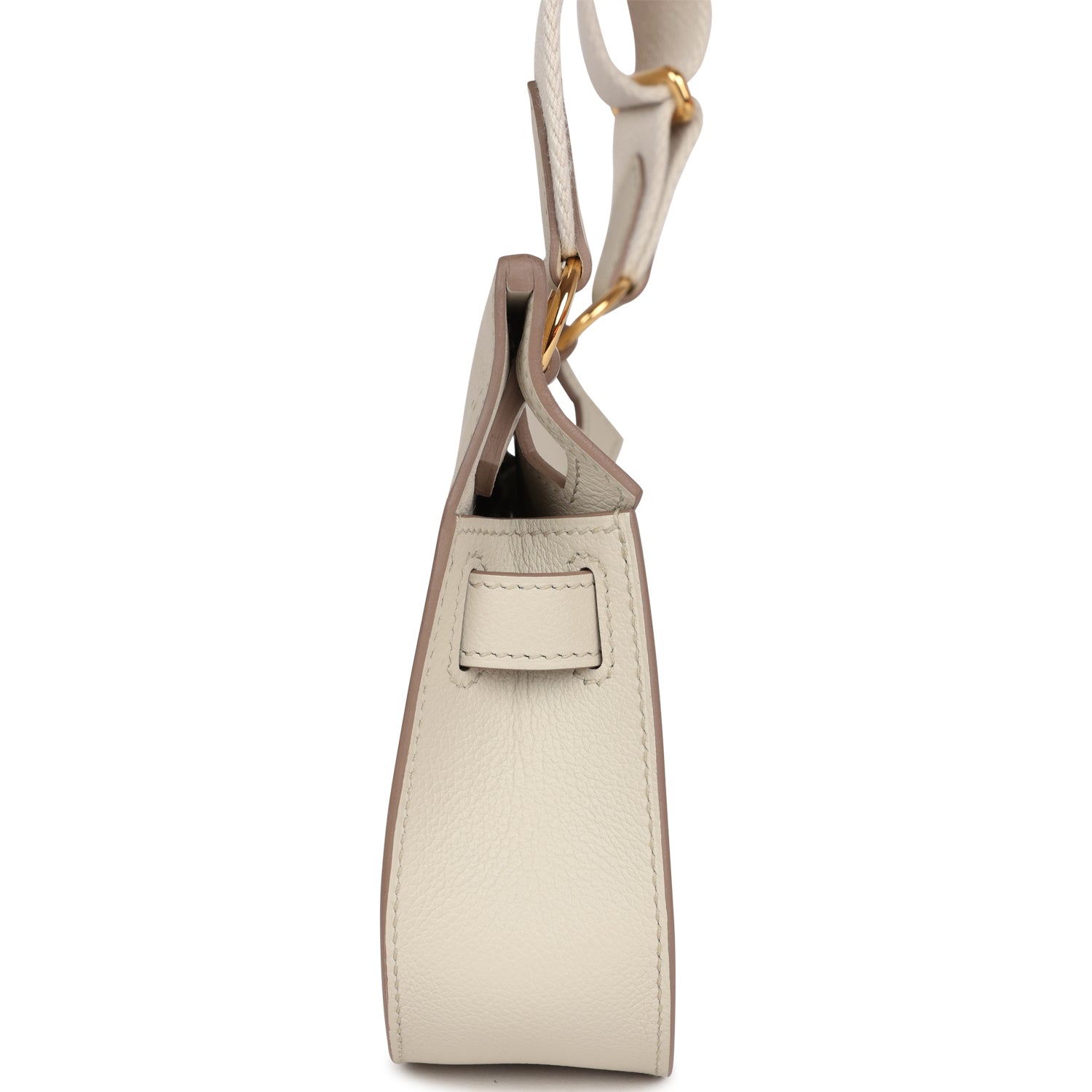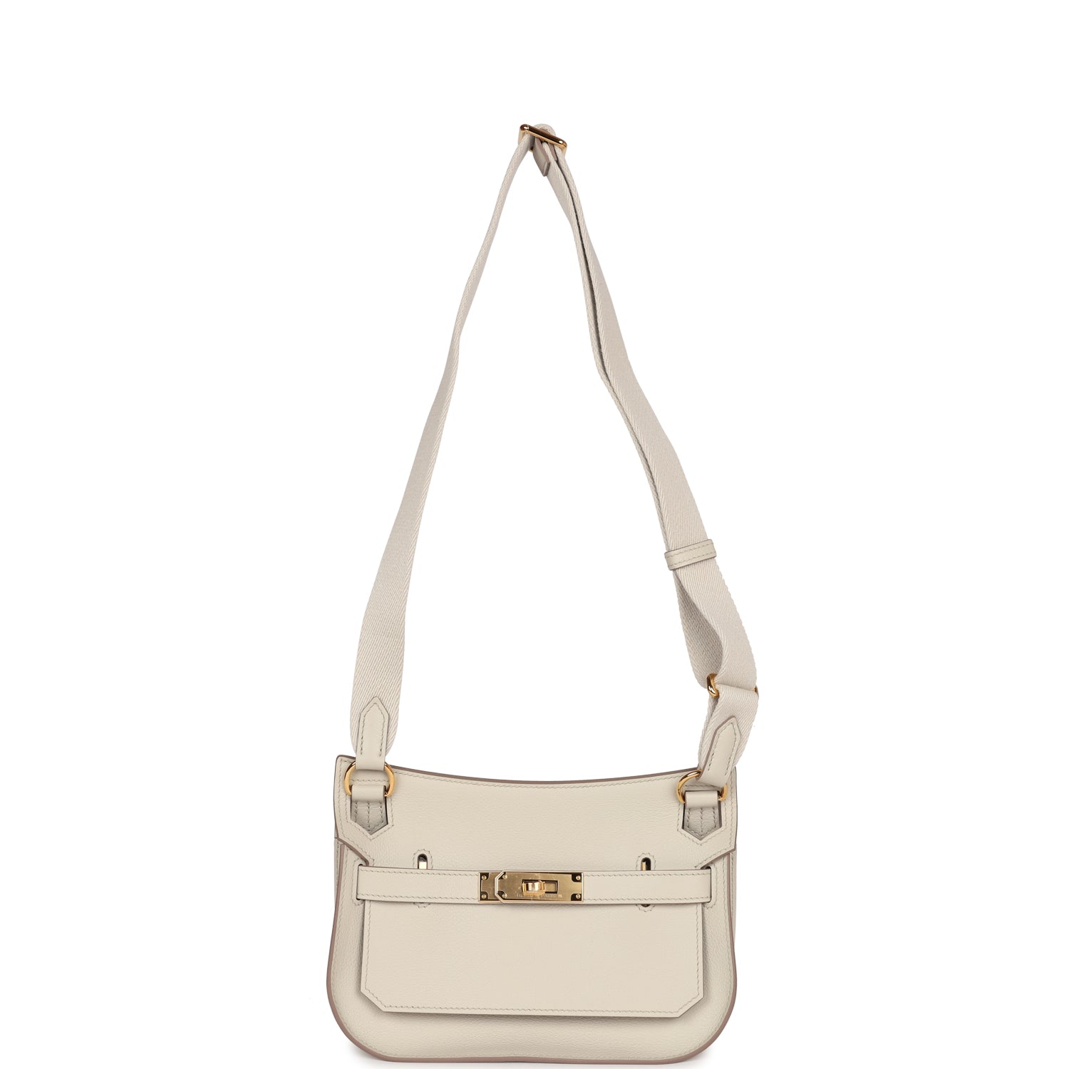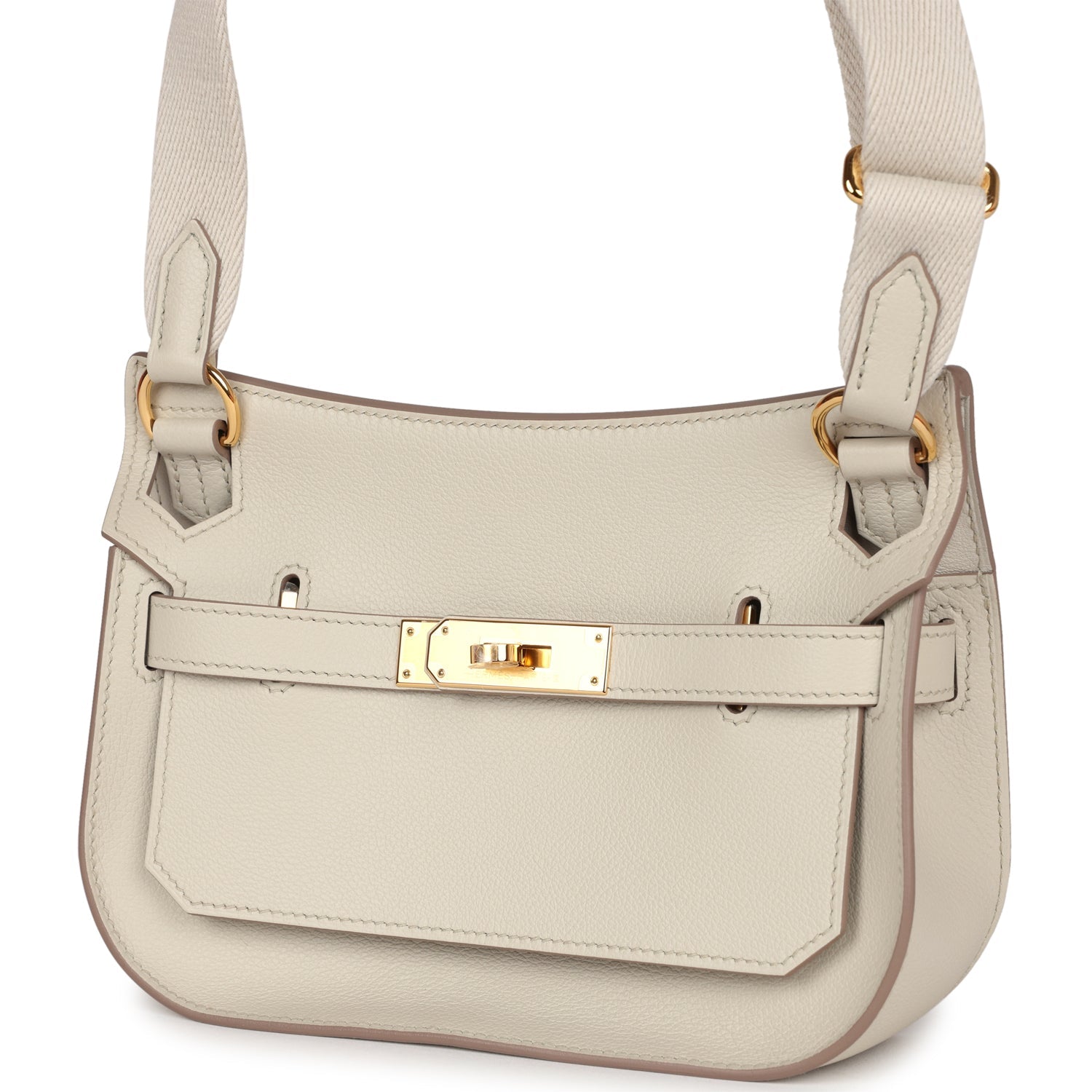 This Jypsiere mini is in Beton evercolor leather with gold hardware, tonal stitching, single flap, two pull straps, turnlock closure, and a flat wool shoulder strap.