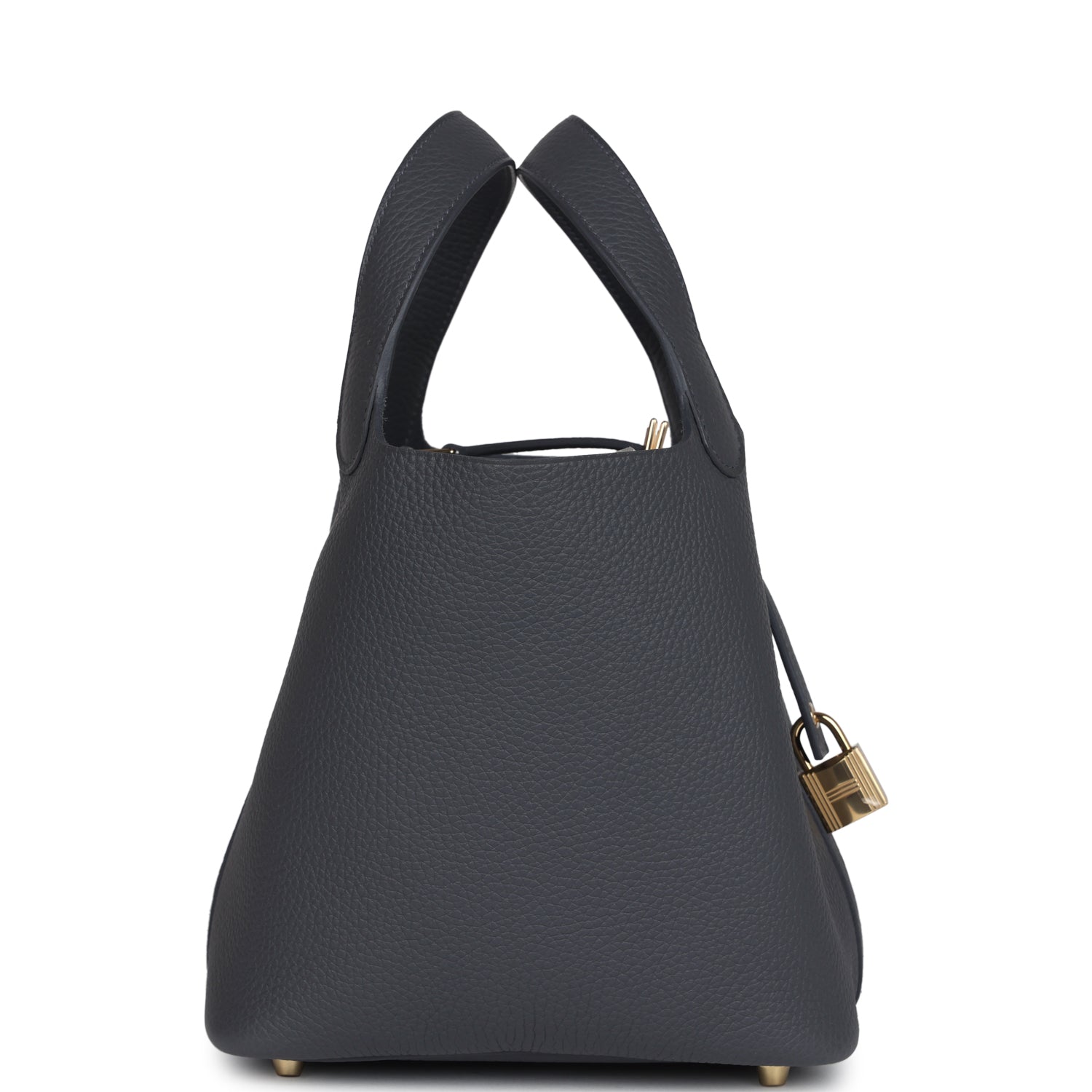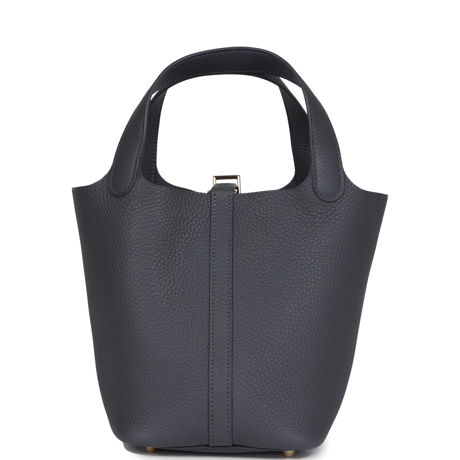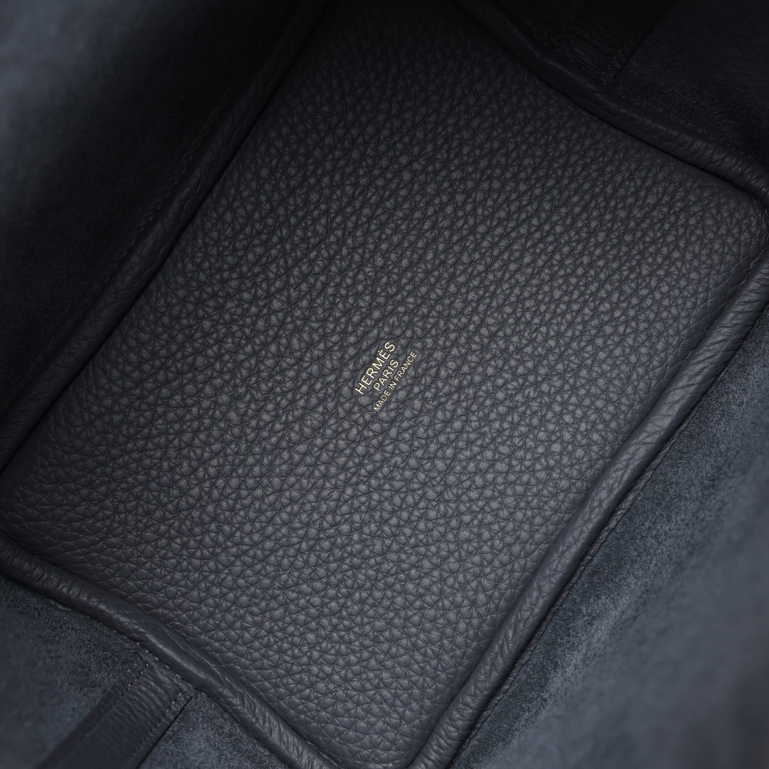 This Picotin is in Ardoise clemence leather with permabrass hardware and has tonal stitching with two top handles, lock and two keys.