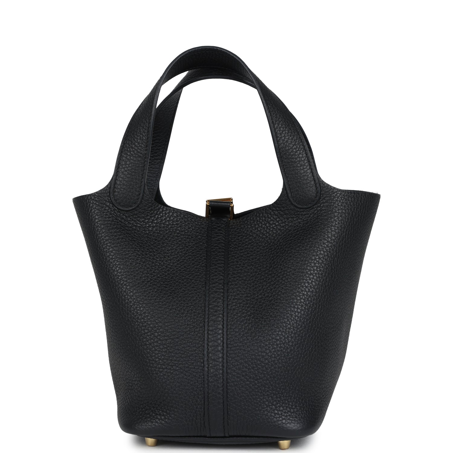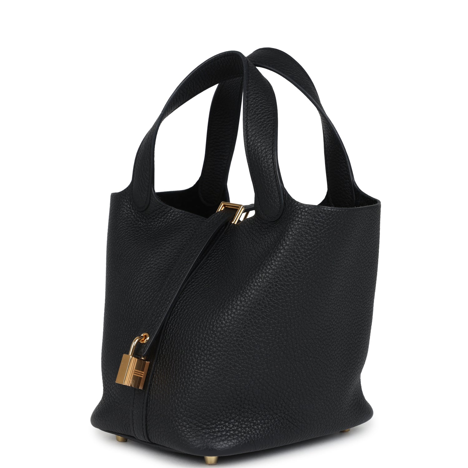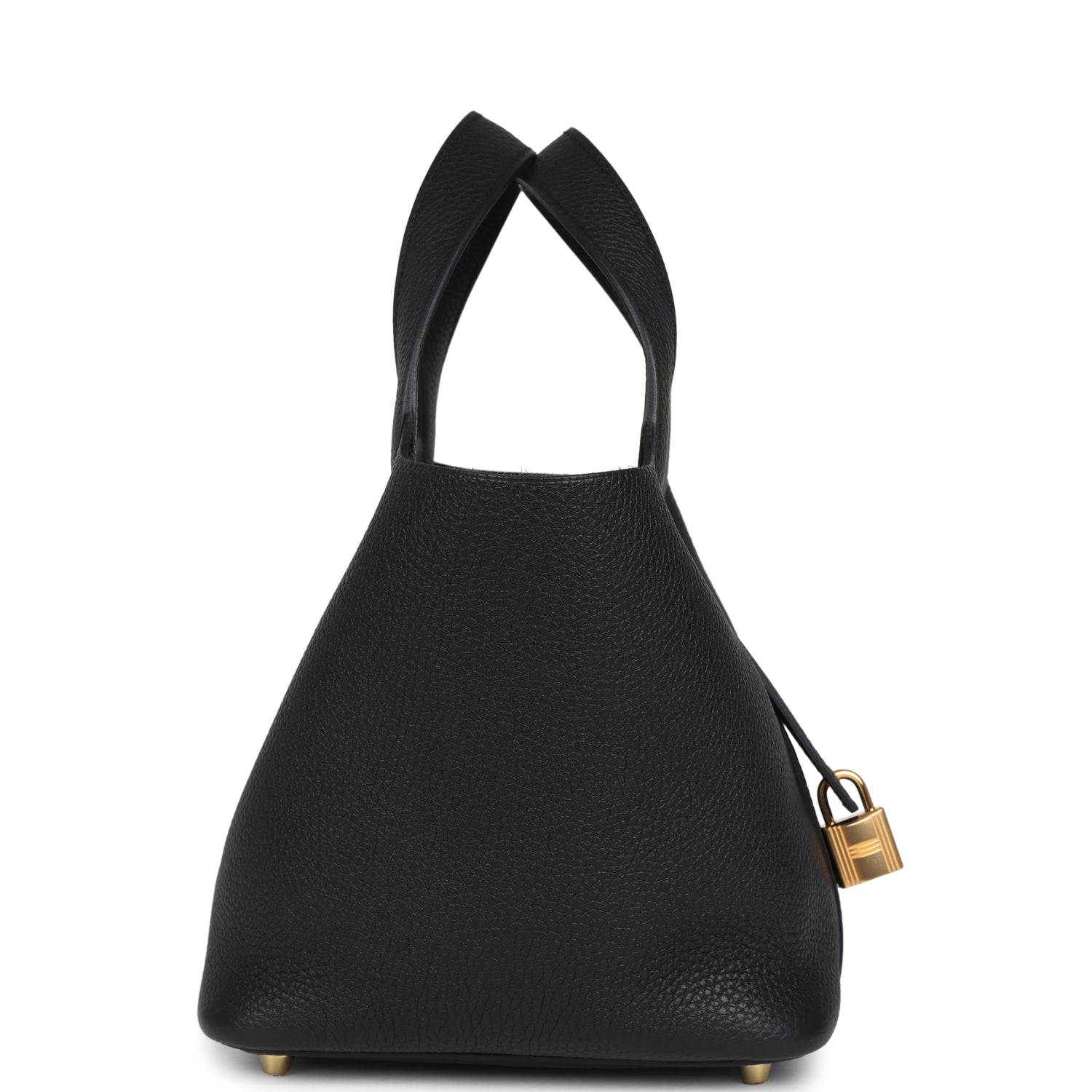 This Picotin Lock is in Black clemence leather with gold hardware and has tonal stitching with two top handles.