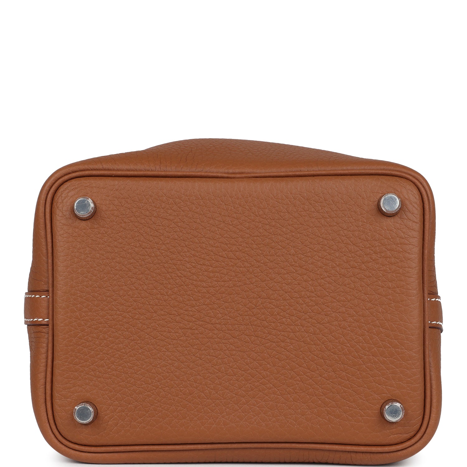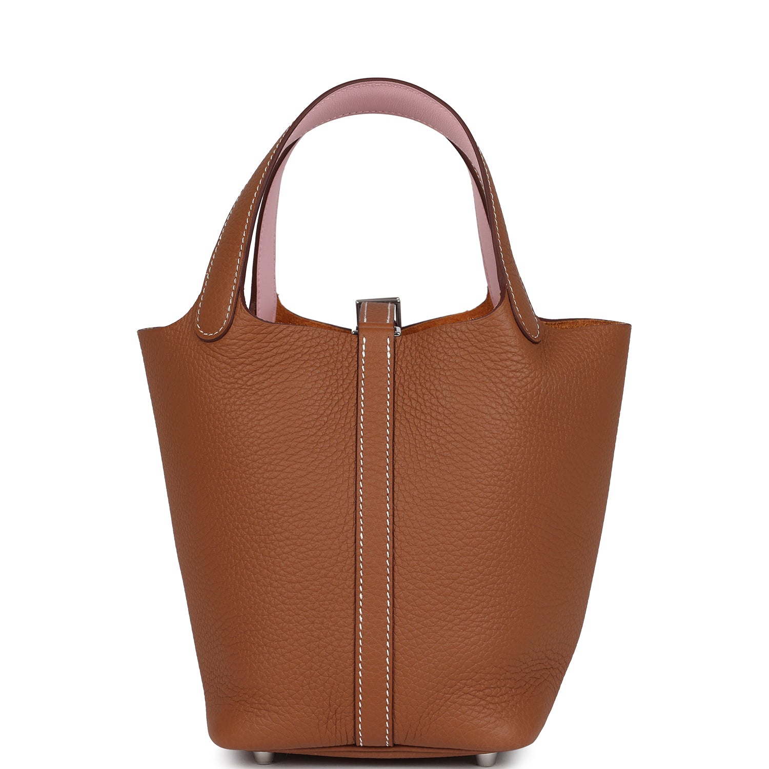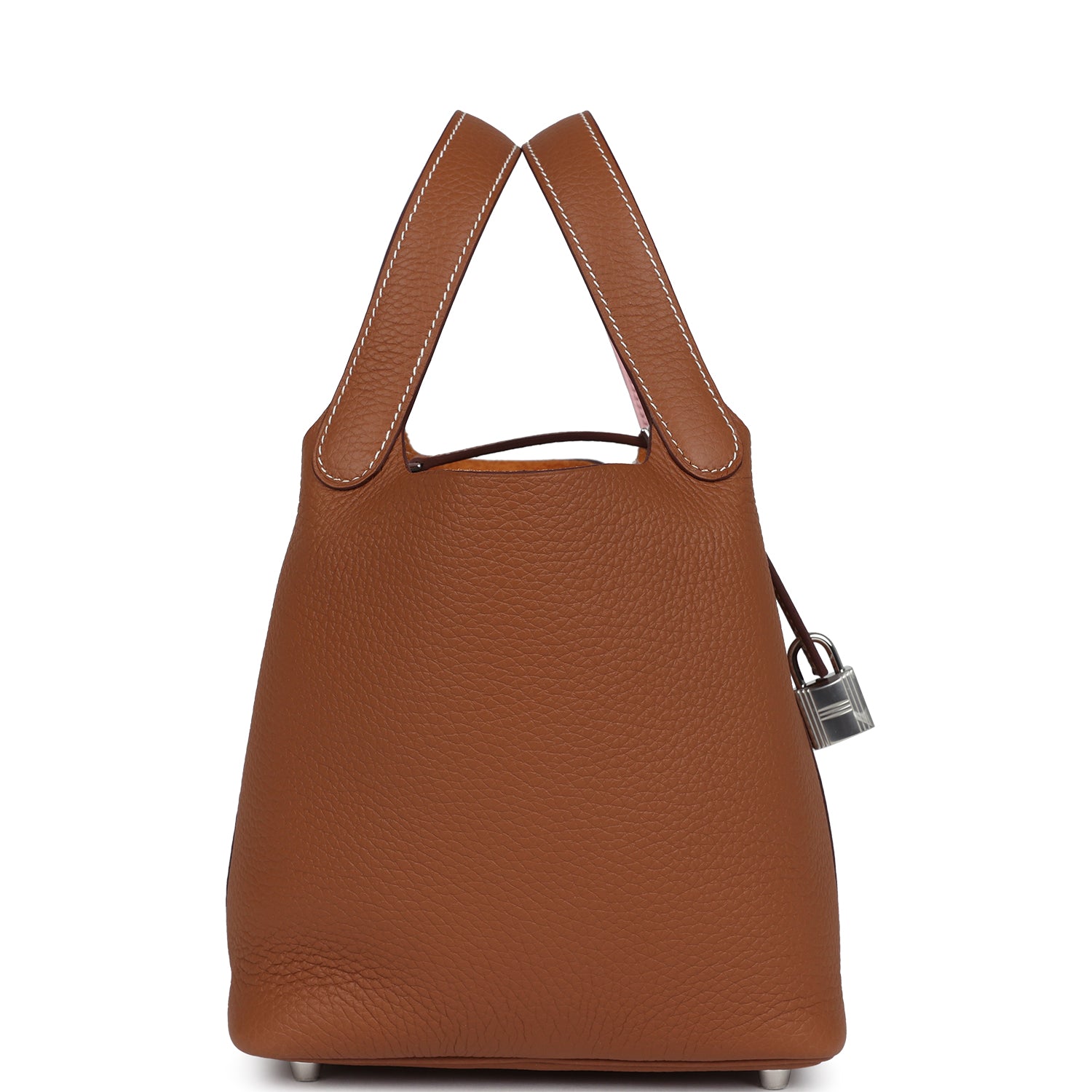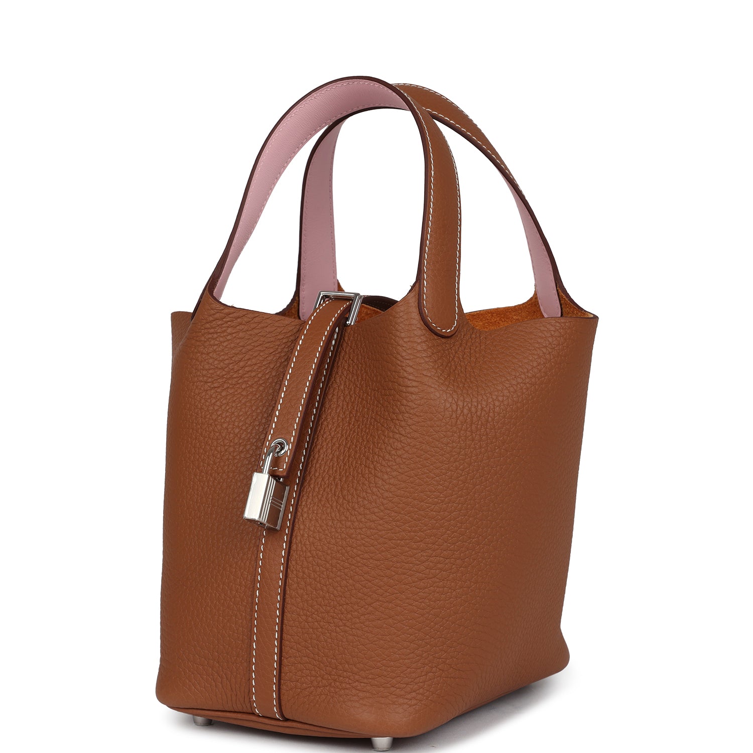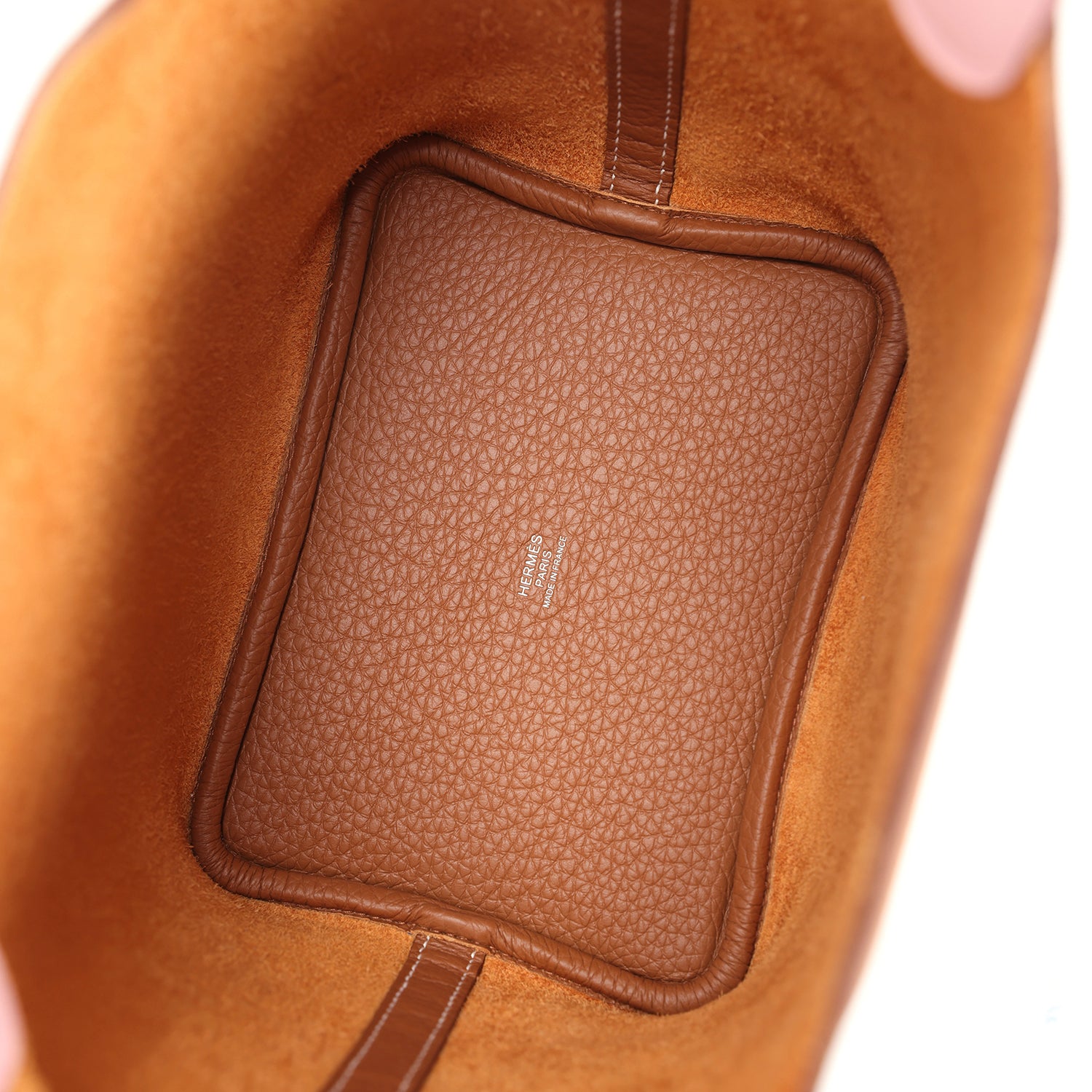 This Eclat Picotin Lock is in Gold clemence and Rose Sakura swift leather with palladium hardware and has contrast stitching with two top handles.