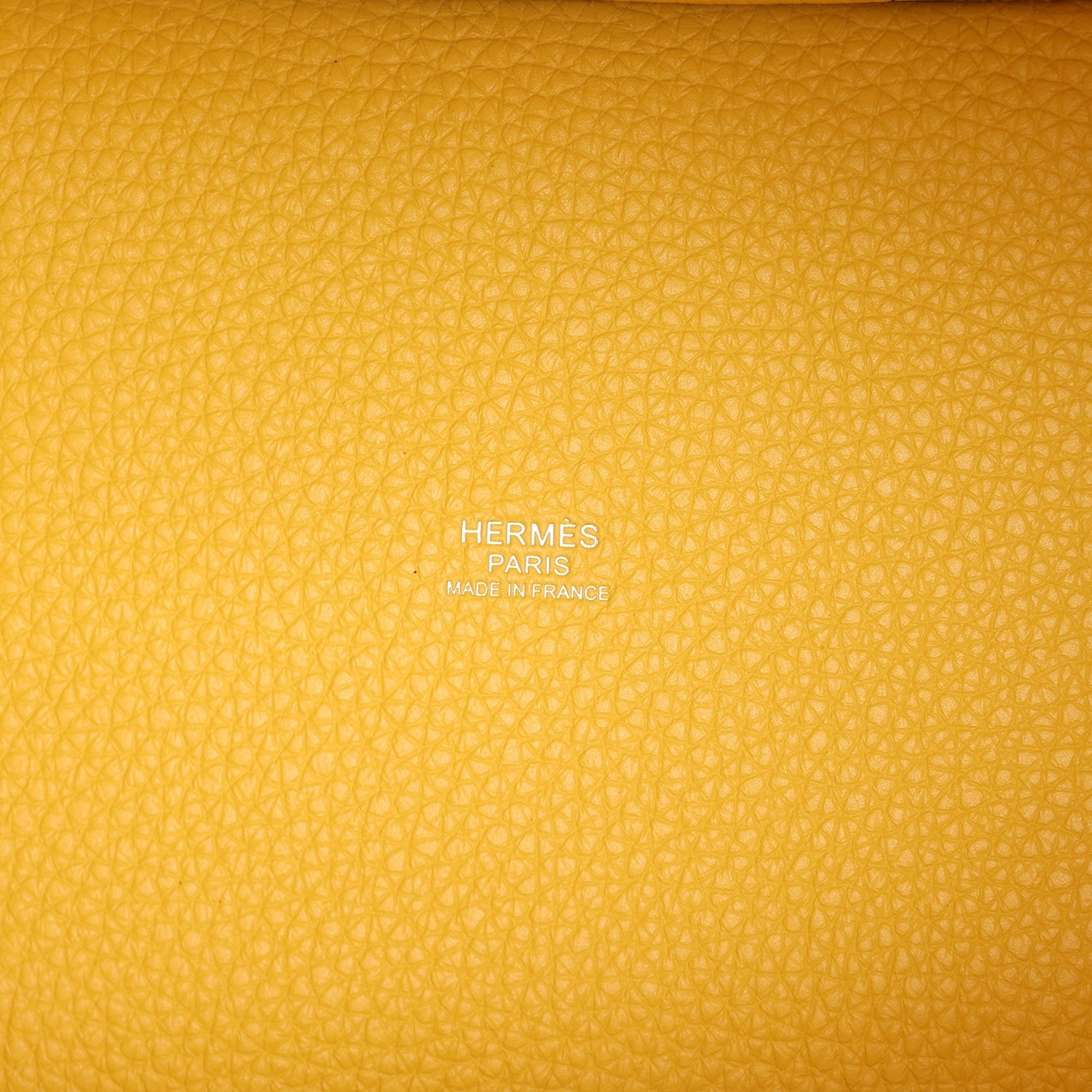 This Picotin Lock is in Sun clemence leather with palladium hardware and has tonal stitching with two top handles.