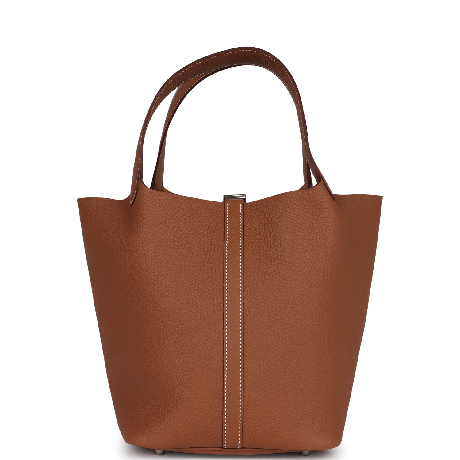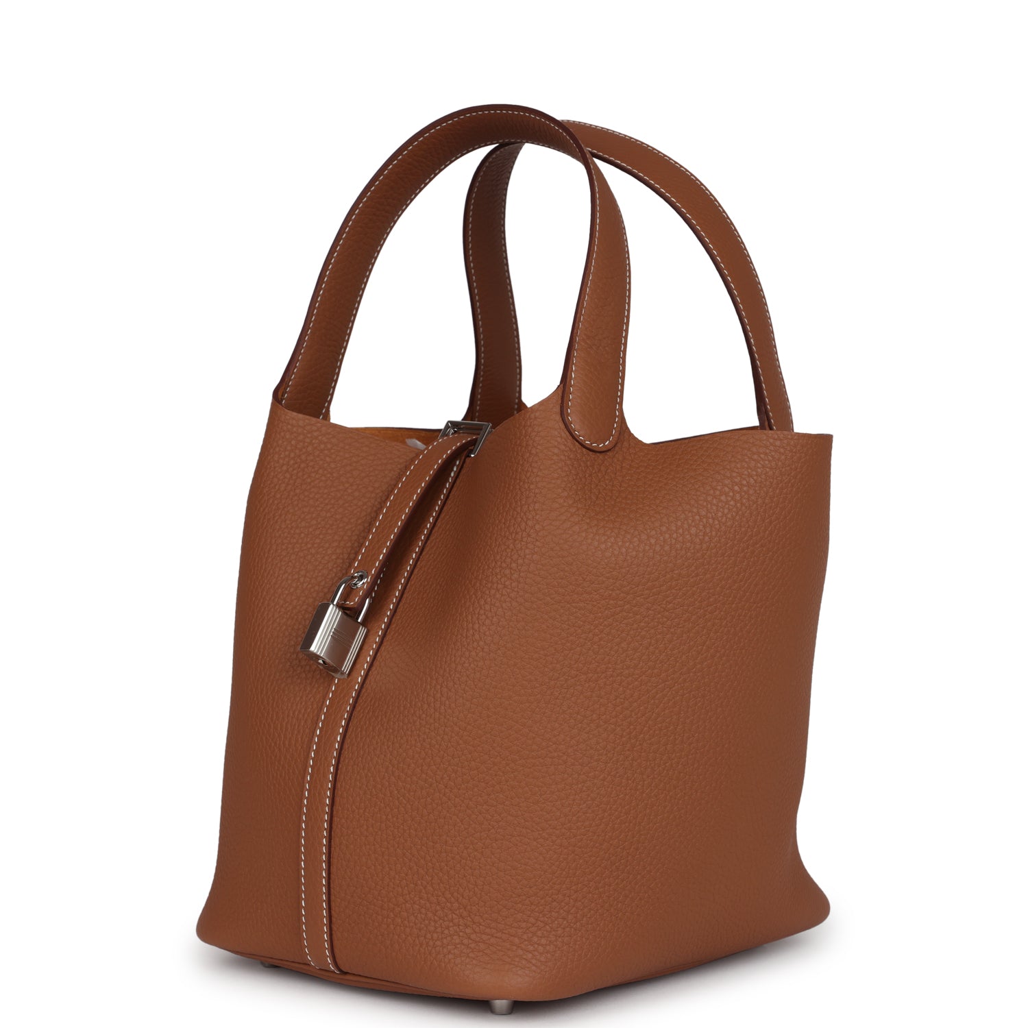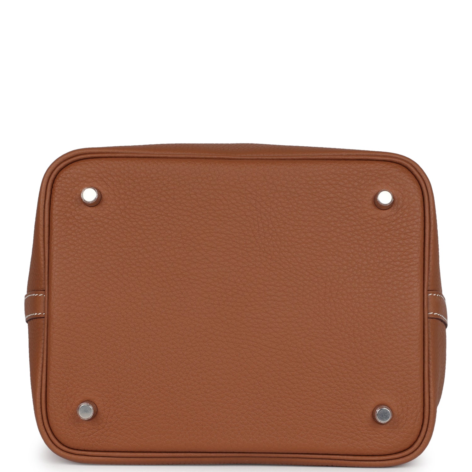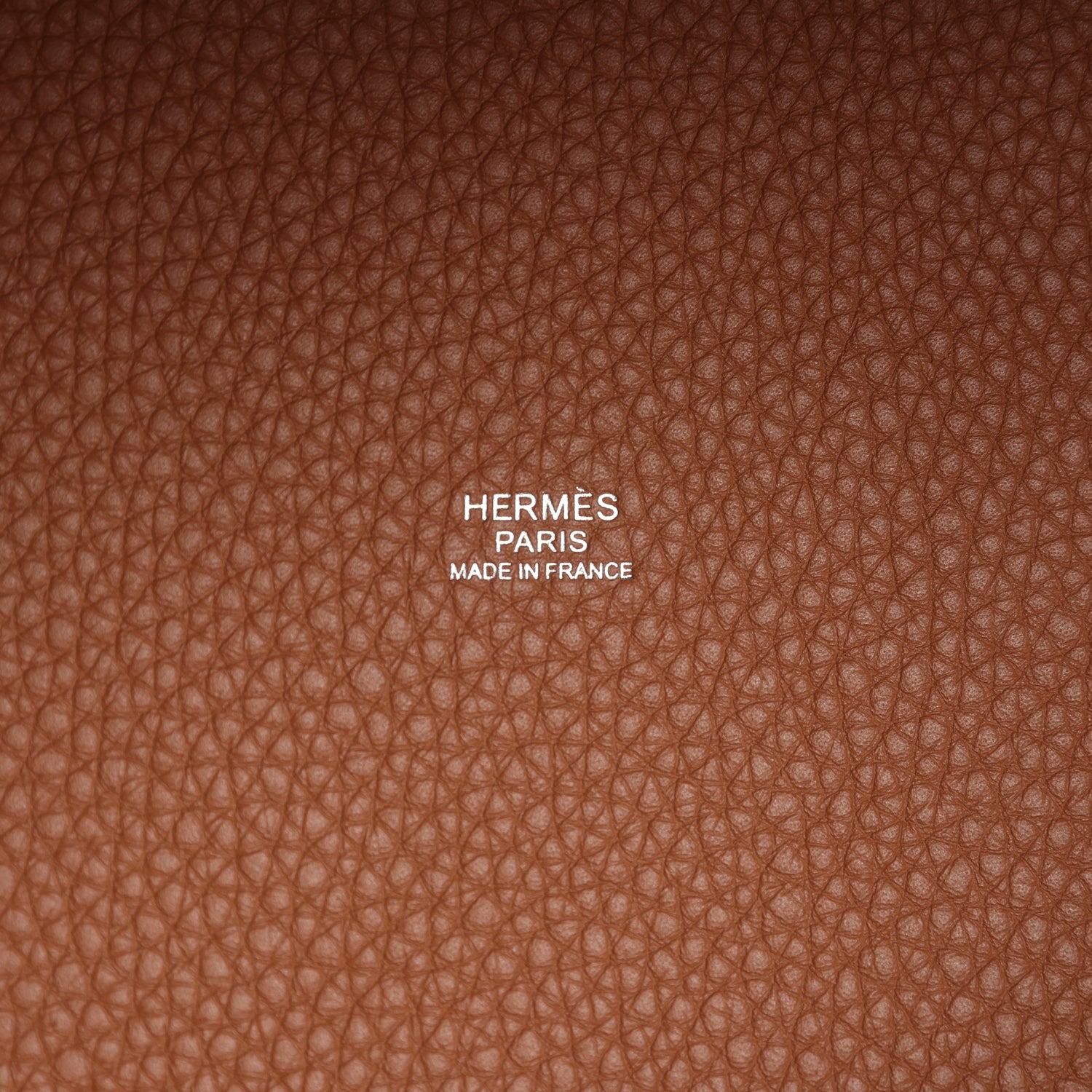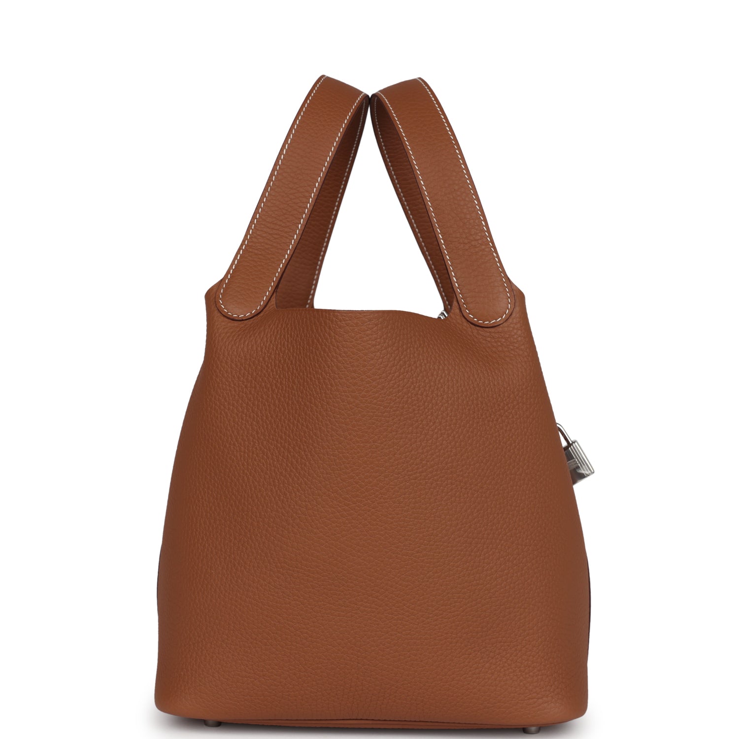 This Picotin is in Gold clemence leather with palladium hardware and has contrast stitching with two top handles.