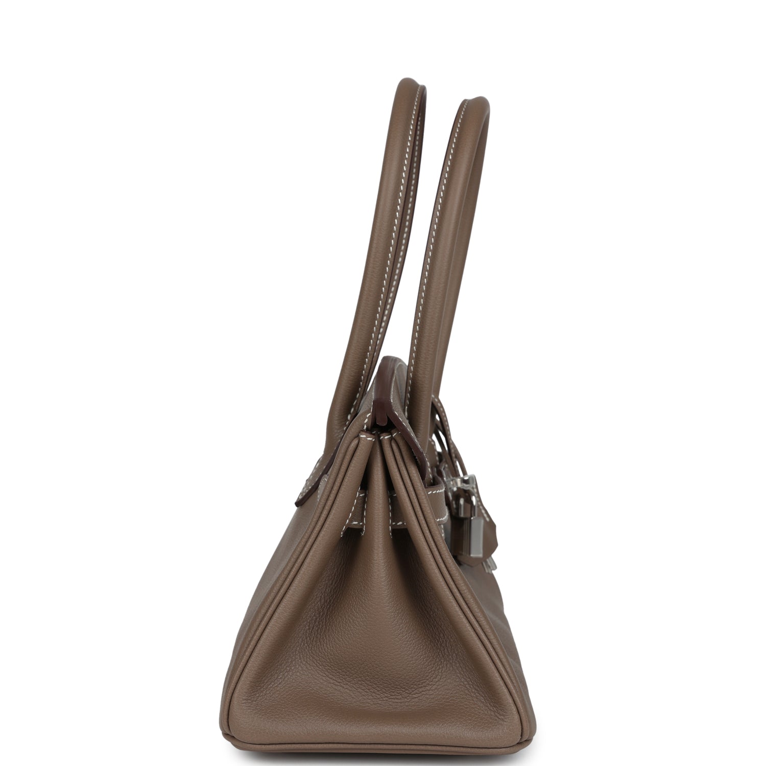 This Shoulder Birkin Light 29 is in Etoupe evercolor leather with palladium hardware and has white contrast stitching, two straps with front toggle closure, clochette with lock and two keys and double rolled handles.